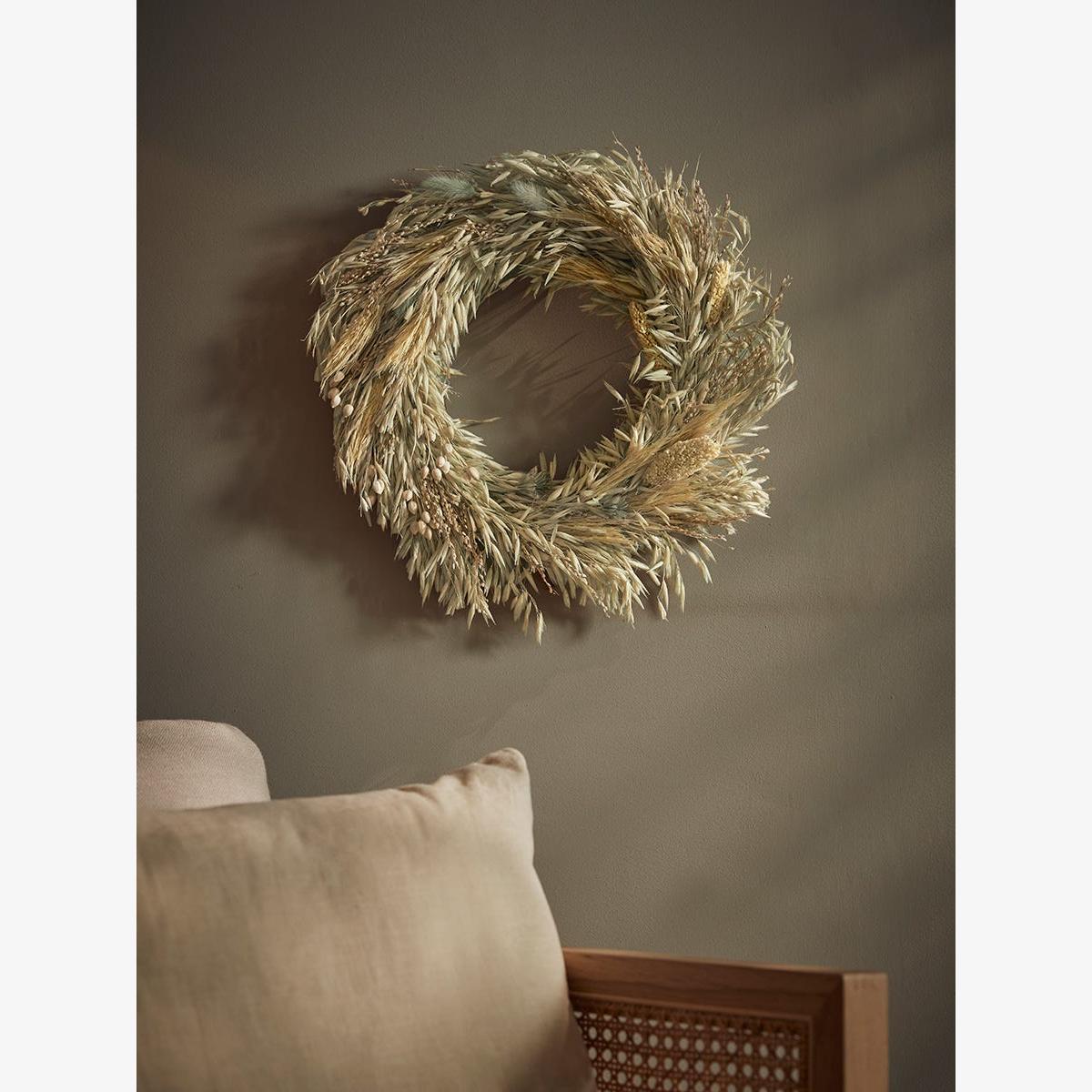 I love this large dried grass wreath for its neutral, earthy tones and.textural appeal-it's a versatile piece that adds natural warmth to various interiors. It works particularly well in rustic, boho, or farmhouse-style spaces, but can also soften more modern or minimalist decor when styled thoughtfully. Practical styling tips include hanging it on a feature wall as a statement piece, or employing it as a centrepiece on a table with complementary natural elements like wooden or ceramic accents. Its low-maintenance nature makes it ideal for busy households or those who want a long-lasting decorative element without the upkeep of fresh foliage.