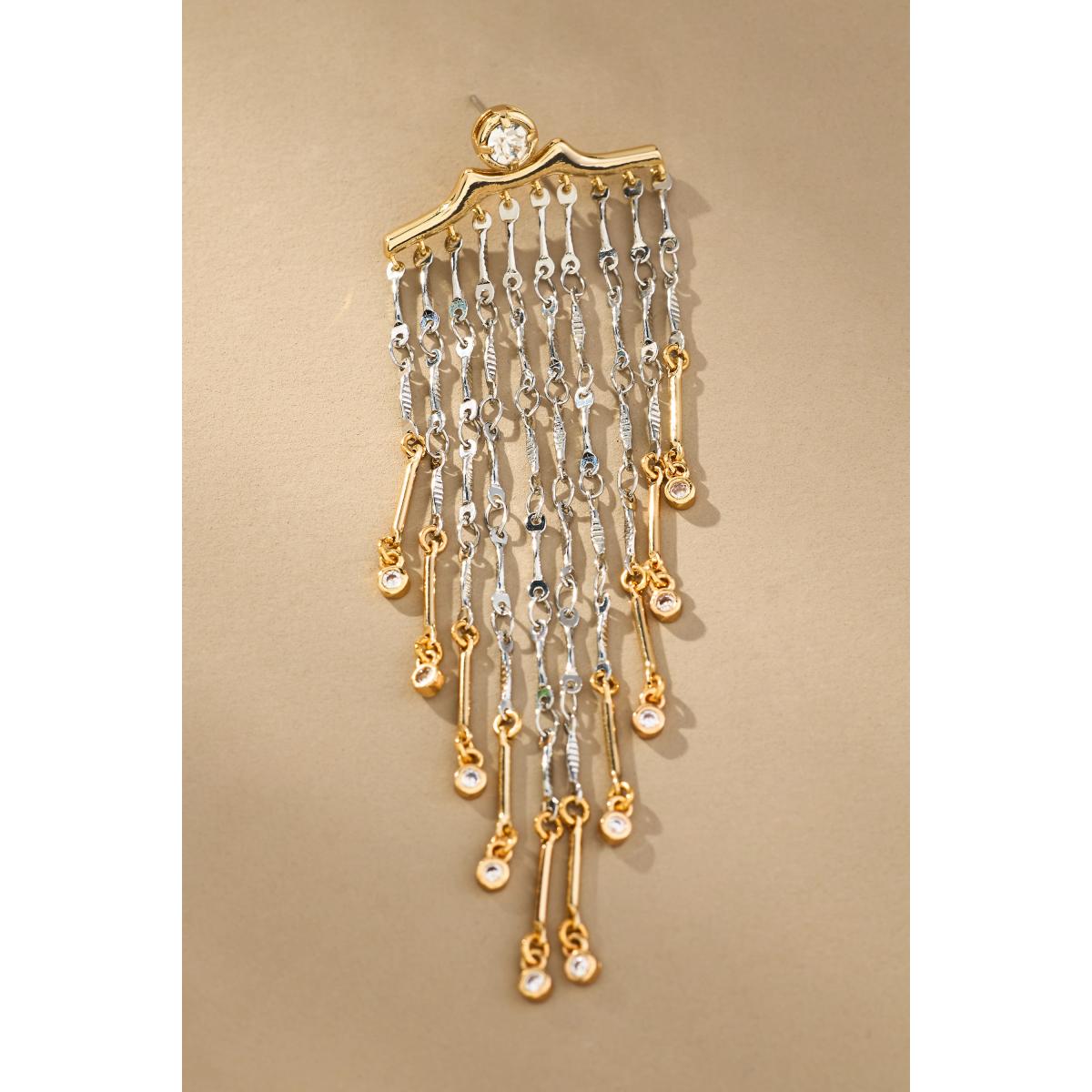 The mixed metal chandelier earrings are a bold accessory that work best in eclectic or contemporary interiors, where their metallic finishes can be complemented by similar accents like brass or gold-toned decor pieces. I love how they add a statement touch without overwhelming a space, making them ideal for both casual and formal occasions. For styling tips, consider pairing them with sleek updos or tucked-back hair to let the earrings take centre stage, and keep other accessories minimal. In terms of interiors, they work well in spaces with metallic highlights or minimalist palettes where their shimmer can really shine. A practical tip would be to store them carefully to prevent the chains from tangling, ensuring they stay in prime condition for your next statement look.