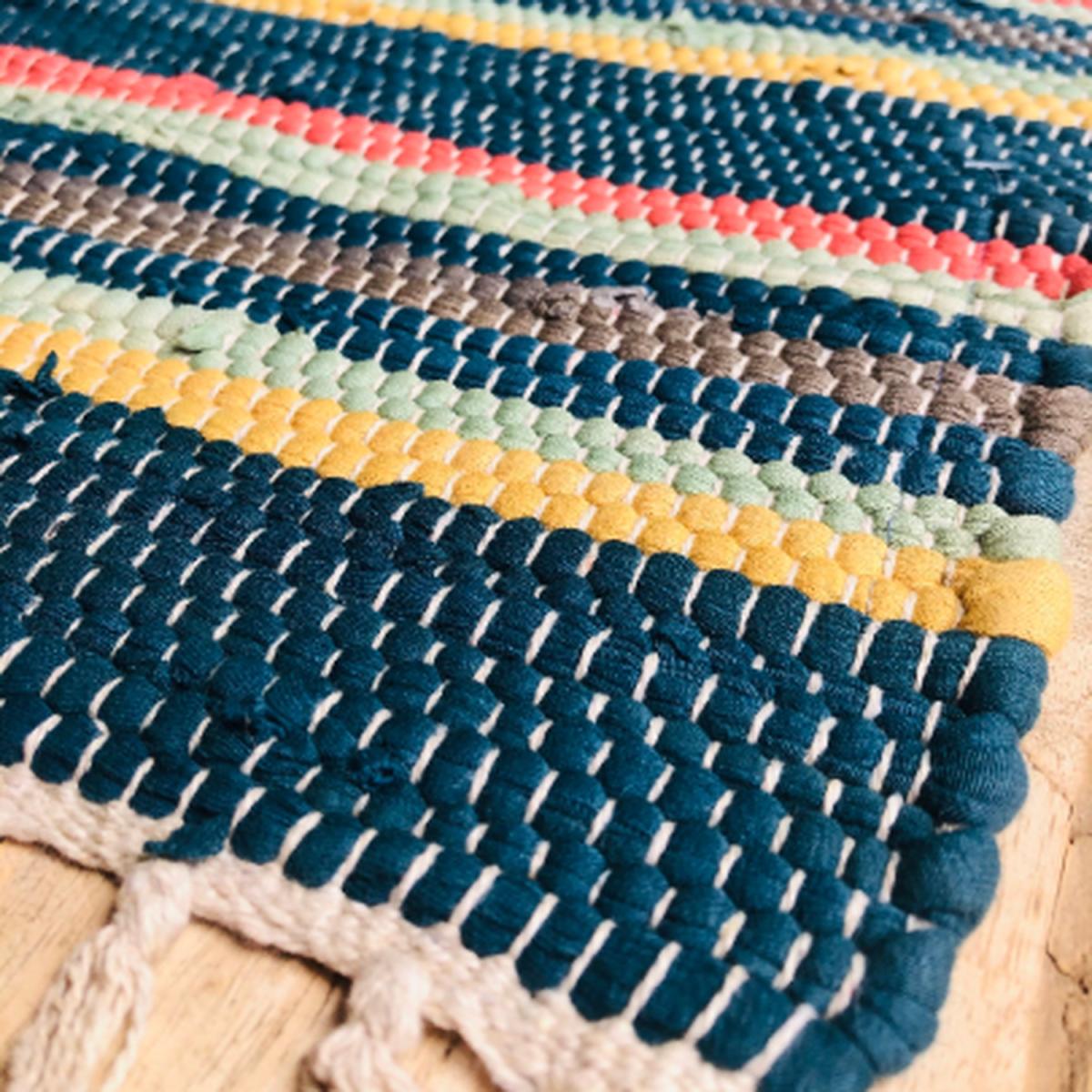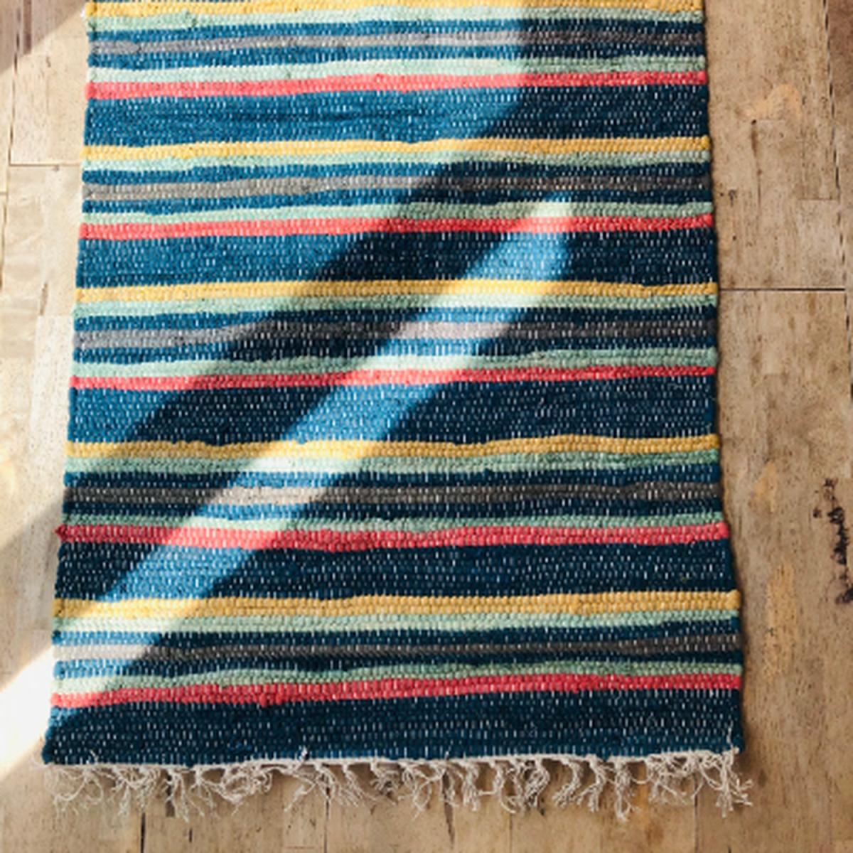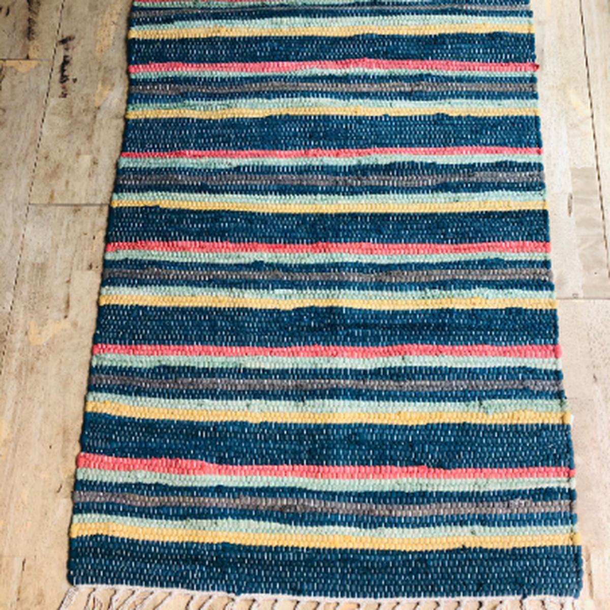 A lovely traditionally hand loomed rag rug. A mixed pattern in bright mixed stripes. Made from 80% cotton 20% other. Very well made and a nice modern design. Would look good in any room. Each one is individual. Fair trade rugs. Each one is handmade so no two rugs are the same.