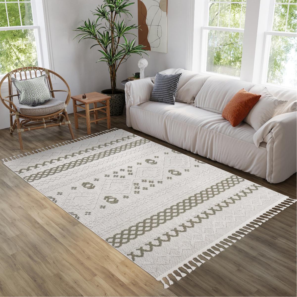 Presenting the Miya Rug: a stylish and durable addition to your home. Available exclusively in the size 200cm x 290cm, this rug showcases a unique flat and loop design, ensuring a contemporary look and long-lasting quality. The Miya Rug features a sophisticated blend of green, grey, and white hues, adding a fresh and elegant touch to any room. Whether for high-traffic areas or cozy corners, the Miya Rug combines beauty and resilience, making it an excellent choice for your living space.