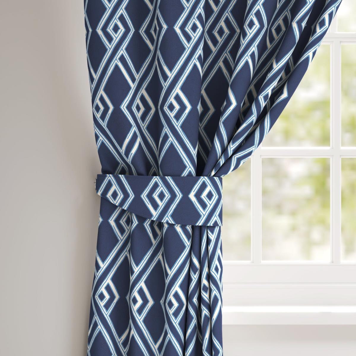 Revamp your curtains with the contemporary flair of our Miyagi Pattern Made to Order Tiebacks. Meticulously crafted from fire-retardant fabric, these tiebacks seamlessly blend safety and style, ensuring a neat and polished appearance for your curtains. Individually sold, each tieback provides the option of a sleek plain or an elegant piped edge, allowing you to customise the look to your liking. The versatile geometric pattern introduces a modern touch to any space, making these tiebacks suitable for both residential and commercial use. Proudly made in the UK, Miyagi Pattern Made to Order Tiebacks bring unparalleled quality and sophistication to your window treatments. Available in both a plain and piped design, this tieback can be paired with our matching Made to Measure Curtain to give your home, office or commercial space a beautifully co-ordinated finish. Book an appointment with one of our expert consultants who will guide you through the process of creating your very own Made to Order Tieback. *If you are unsure on testing requirements for your chosen environment, check with a qualified fire officer what testing is required & that this meets your needs.