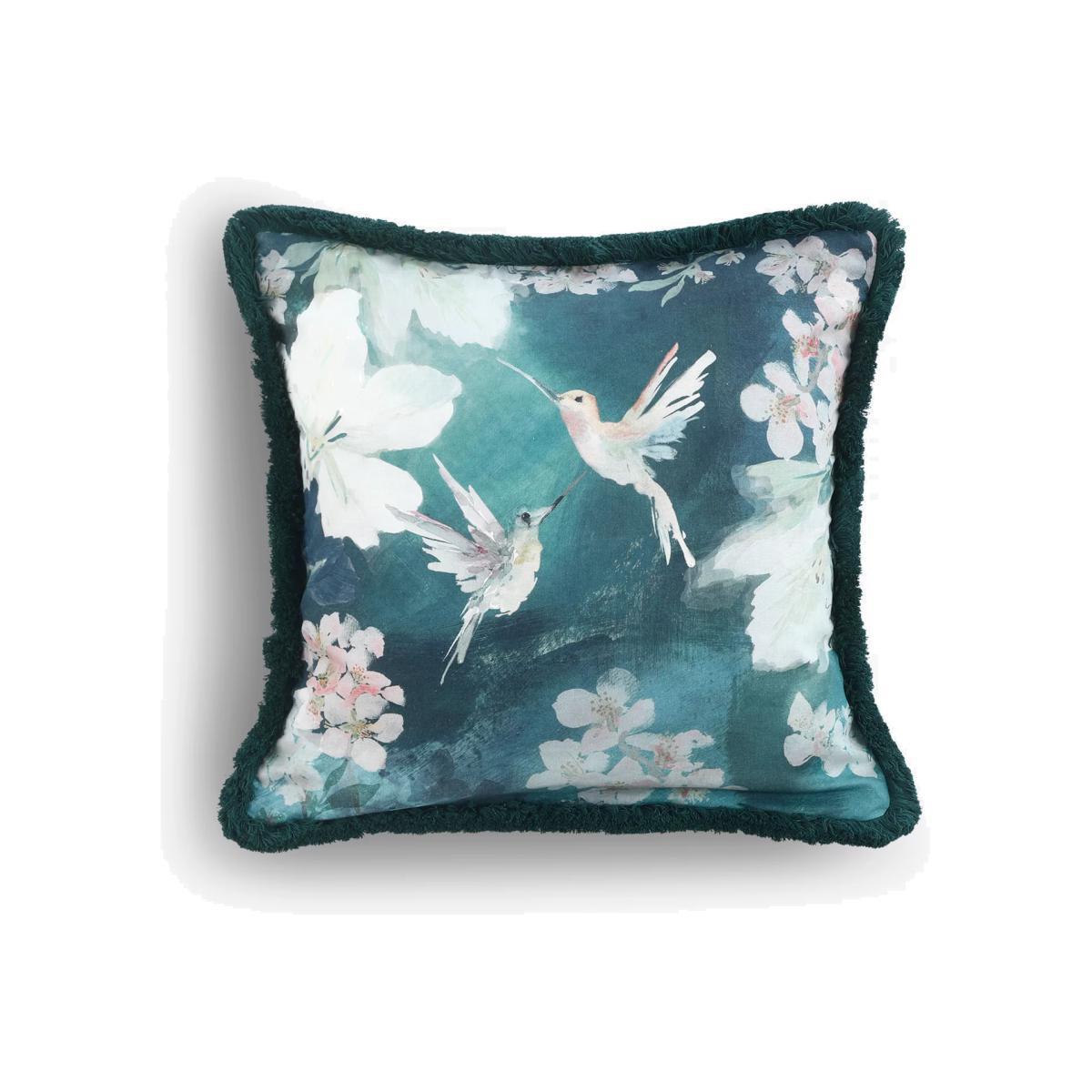 Avri is a pretty design, featuring a soft floral border with two little hummingbirds hovering in the centre. The cover is printed digitally, on linen-cotton, with a fringed edge.