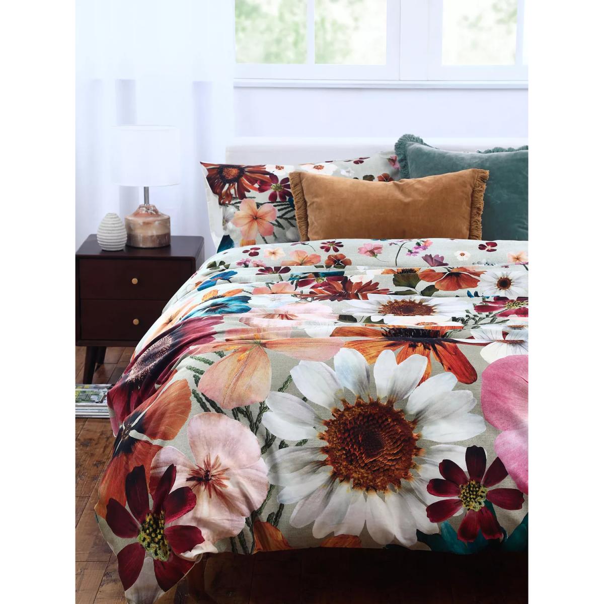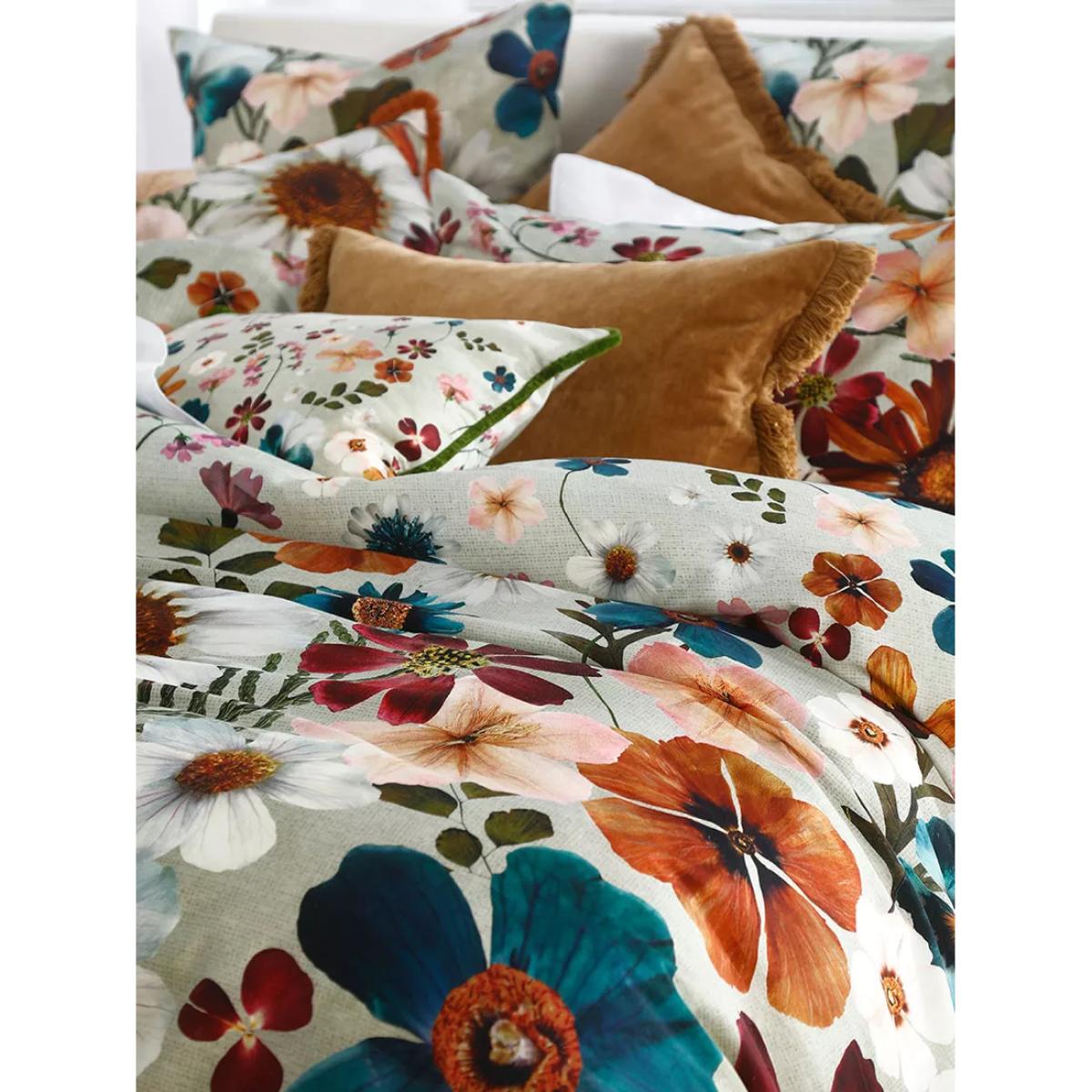 M.M Linen signature design Flowerbed reflects upon mid-century floral art and exudes warmth and vibrant fun. The neutral textured print of the background colour has a hint of sage green. Printed on 220 thread count cotton sateen with a beautifully soft hand feel. Each set contains 2x standard pillowcases. Have you thought about sheeting? Shop here. Bedding sizes To fit duvet/pillow size (cm) Standard pillowcase, L75 x W50cm Double duvet cover, L200 x W200cm King duvet cover, L220 x W225cm Super king duvet cover, L220 x W260cm