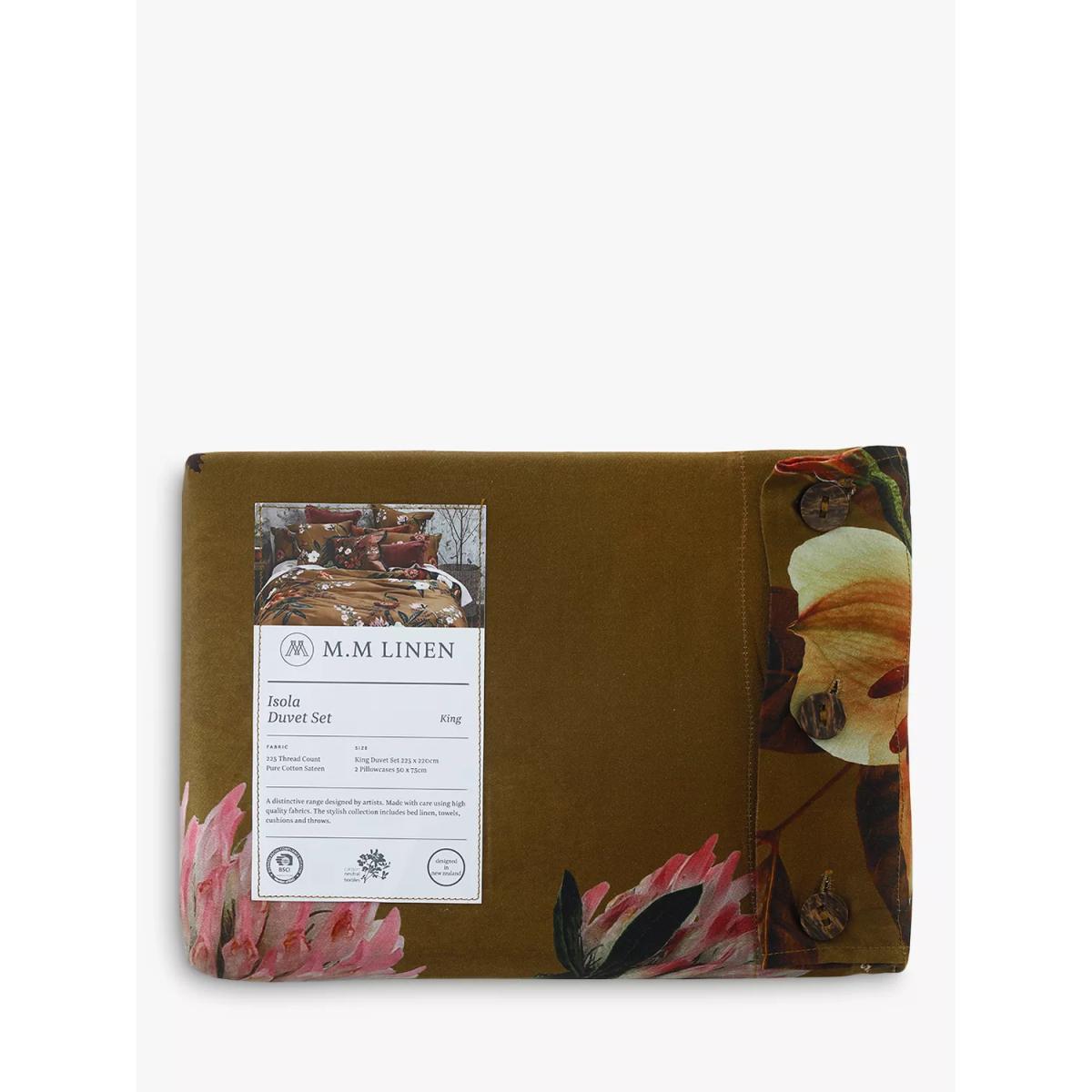 Isola, by M.M Linen, depicts hand-painted bunches of garden flowers in a distinctive palette of warm colours with a mustard coloured background. The reverse is plain. Printed onto smooth, 220 thread count cotton, this breathable fabric helps regulate your body’s temperature and aid a restful night’s sleep. All sets come with two standard pillowcases. Have you thought about sheeting? Shop. Bedding sizes To fit duvet/pillow size (cm) Standard pillowcase, L75 x W50cm Double duvet cover, L200 x W200cm King duvet cover, L220 x W225cm Super king duvet cover, L220 x W260cm