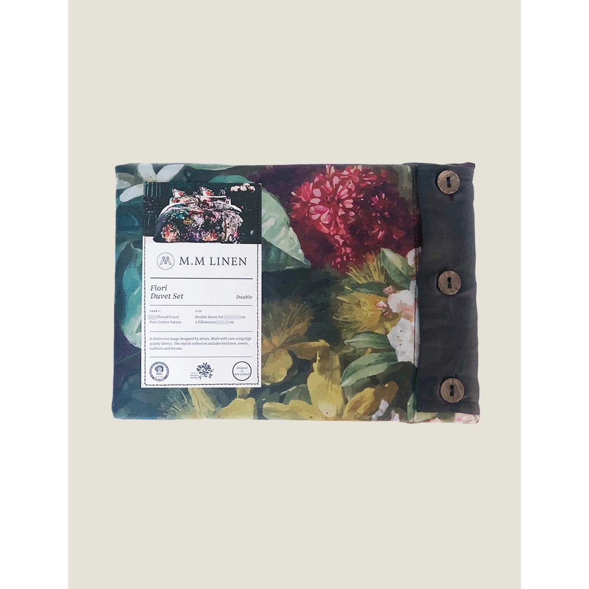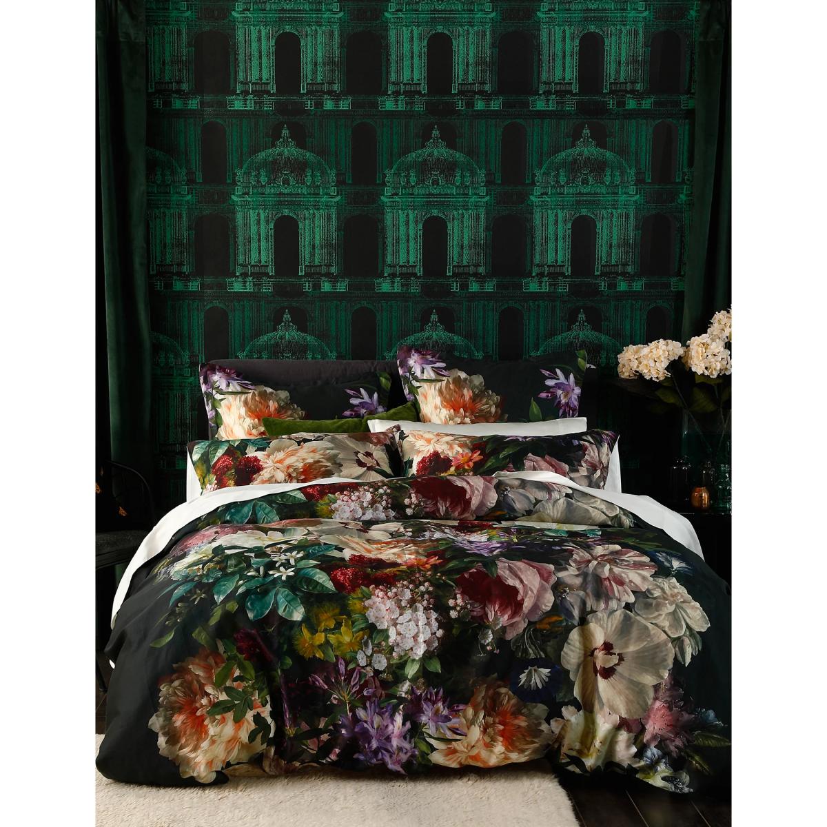 Settle in for the night with this luxurious pure cotton sateen bedding set from MM Linen. The 220 thread count duvet cover and pillowcases feature an artistic floral print set against a dark background for dramatic effect. The reverse is a muted grey tone.