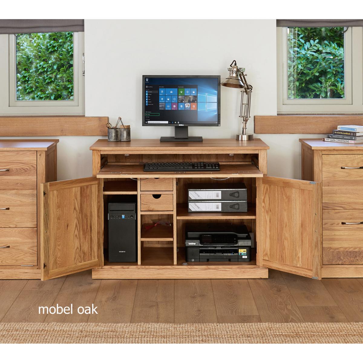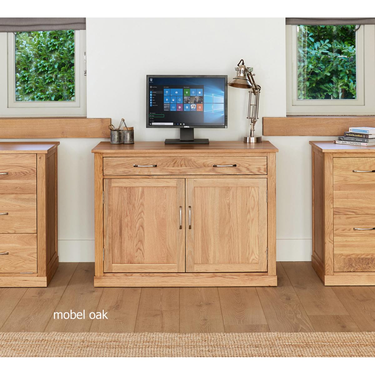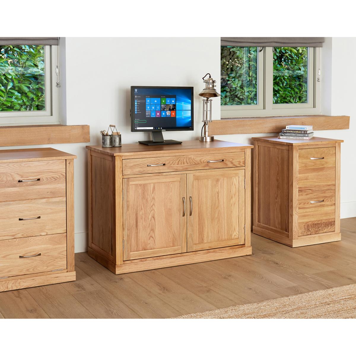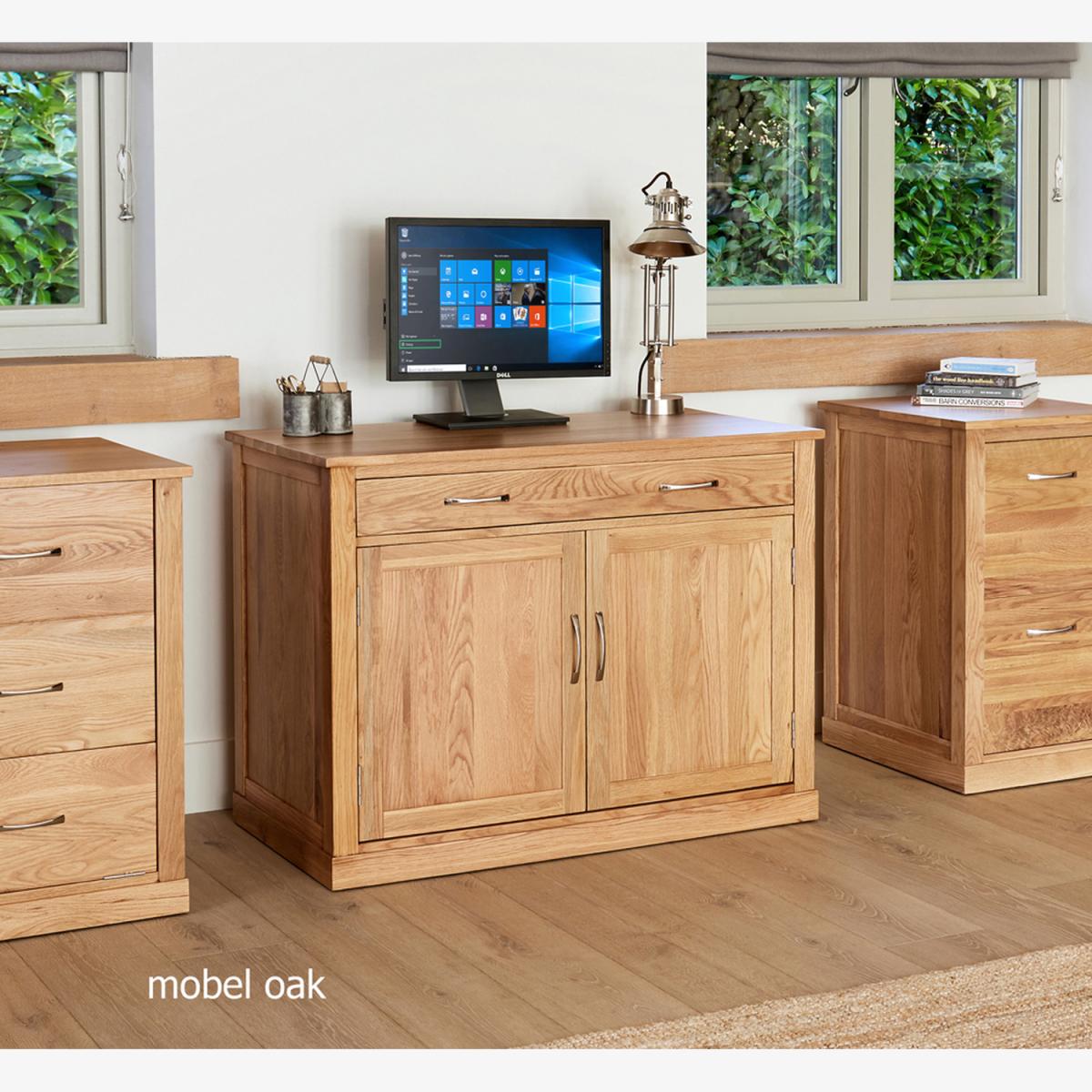 With the looks of a solid oak sideboard, this home office computer desk is a clever storage solution giving you a working space at home. The double handled drawer at the top pulls out to give you extra work surface. The double doors open to reveal a single shelf to the right and a PC tower and drawers to the left.