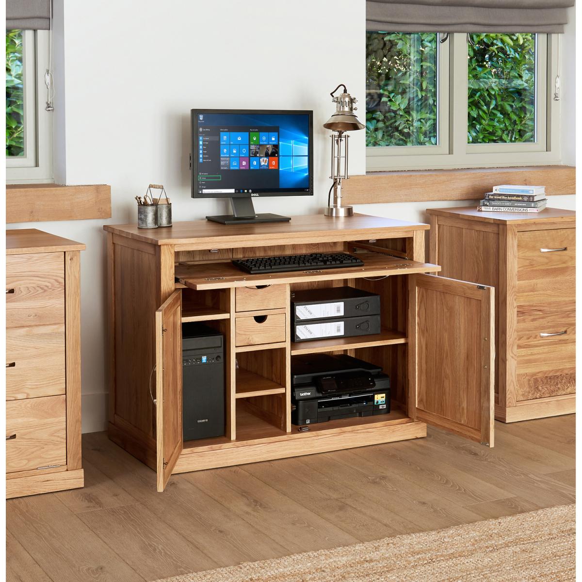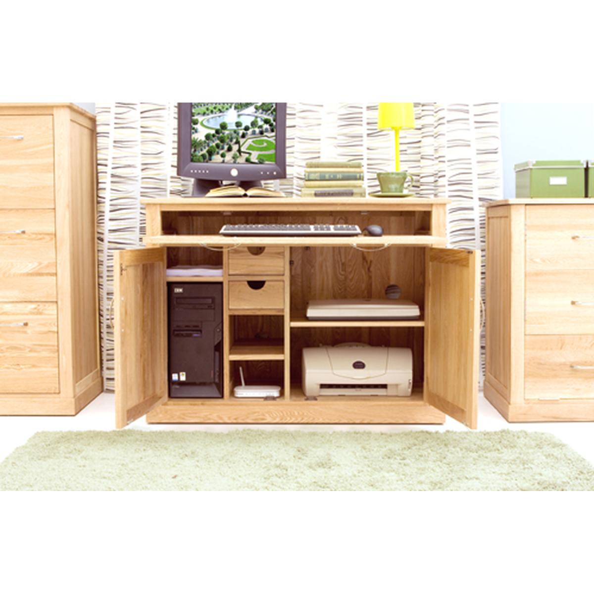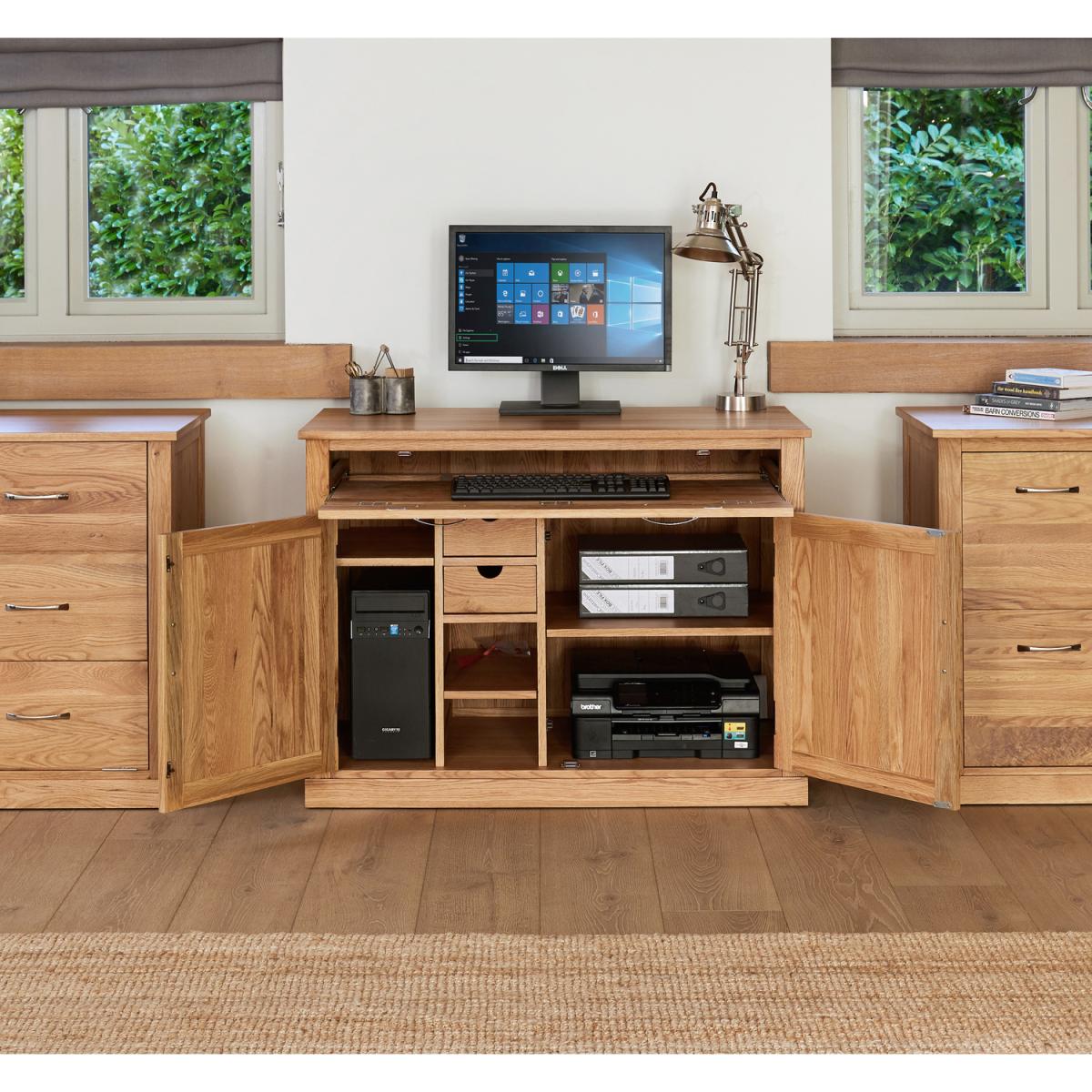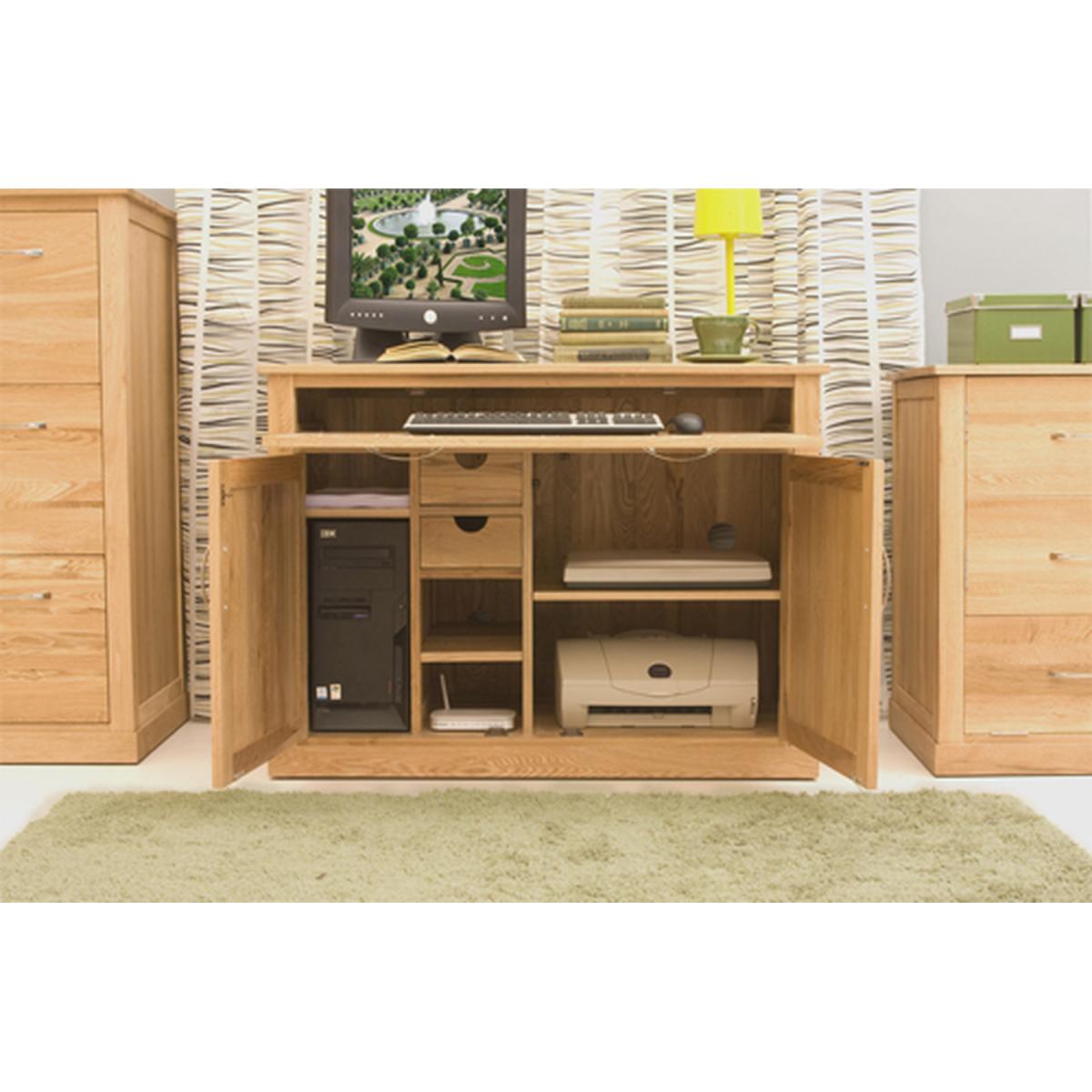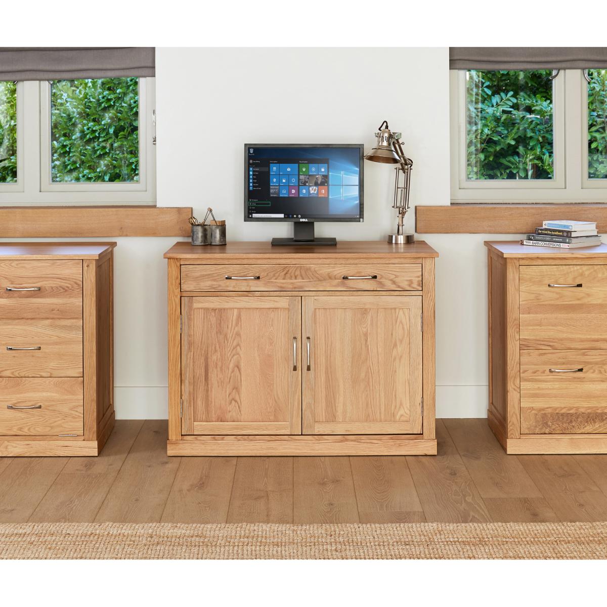With the looks of a solid oak sideboard, this home office computer desk is a clever storage solution giving you a working space at home. The double handled drawer at the top pulls out to give you extra work surface. The double doors open to reveal a single shelf to the right and a PC tower and drawers to the left.