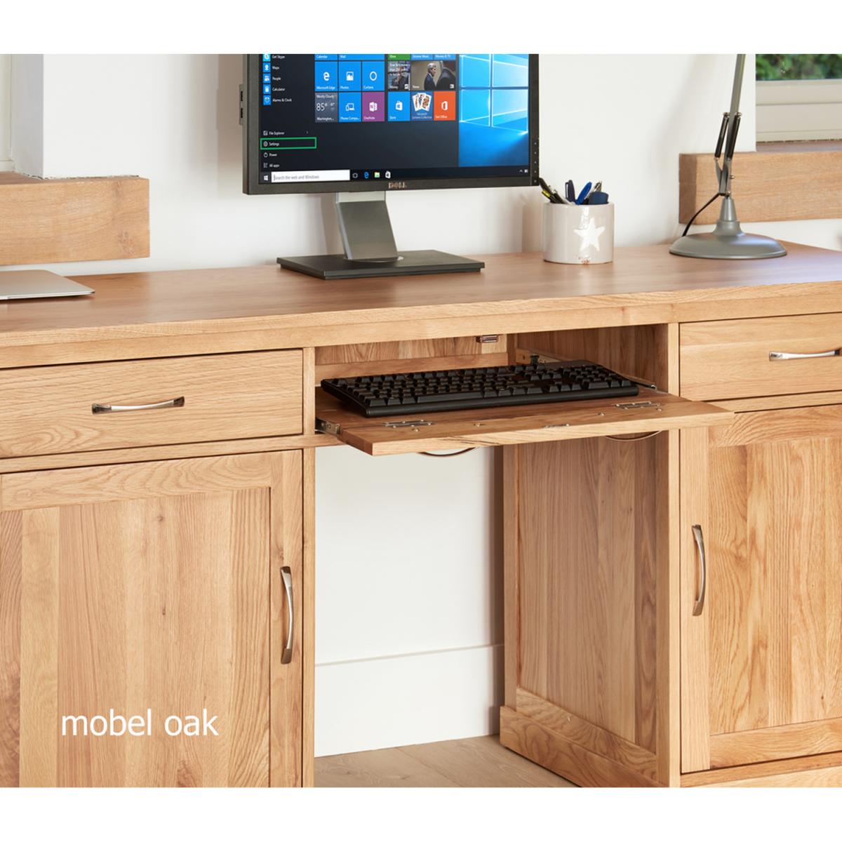 This twin pedestals on this desk have ample storage space with a single shelf cupboard on one side and a multifunctional cupboard on the other. There is a pull out shelf under the table to give you additional work surface and 2 drawers. The panel design sides give this desk the signature Mobel Oak look.