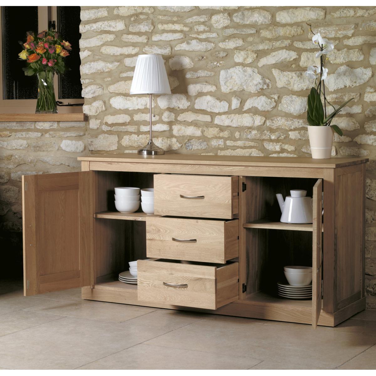 This sideboard comprising of 3 drawers down the middle and a single door cupboard on either side. Made with oak no veneers. Brushed metal handles on all drawers and doors. Dovetail joints on drawers. The sideboard has the Mobel signature panel design on the sides.