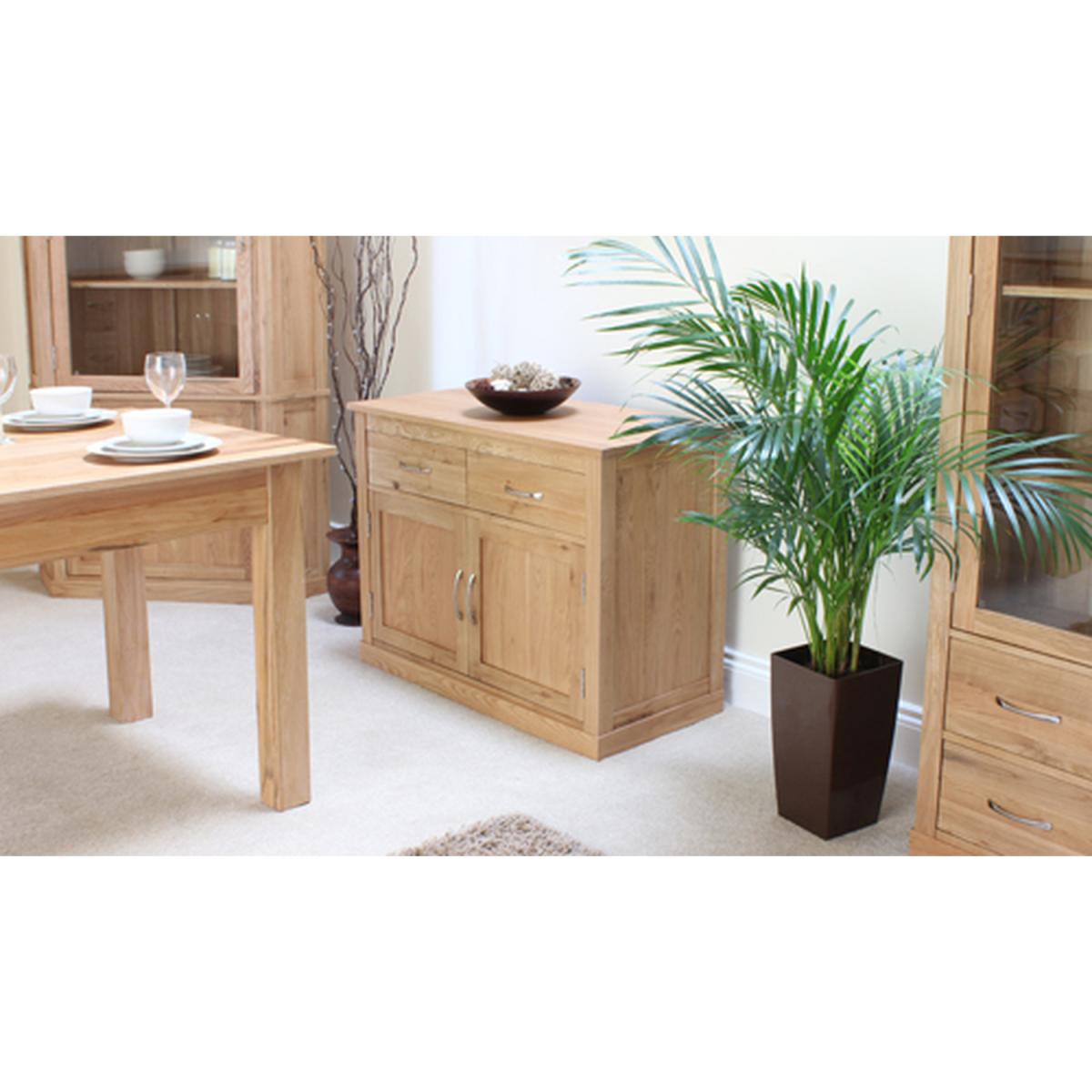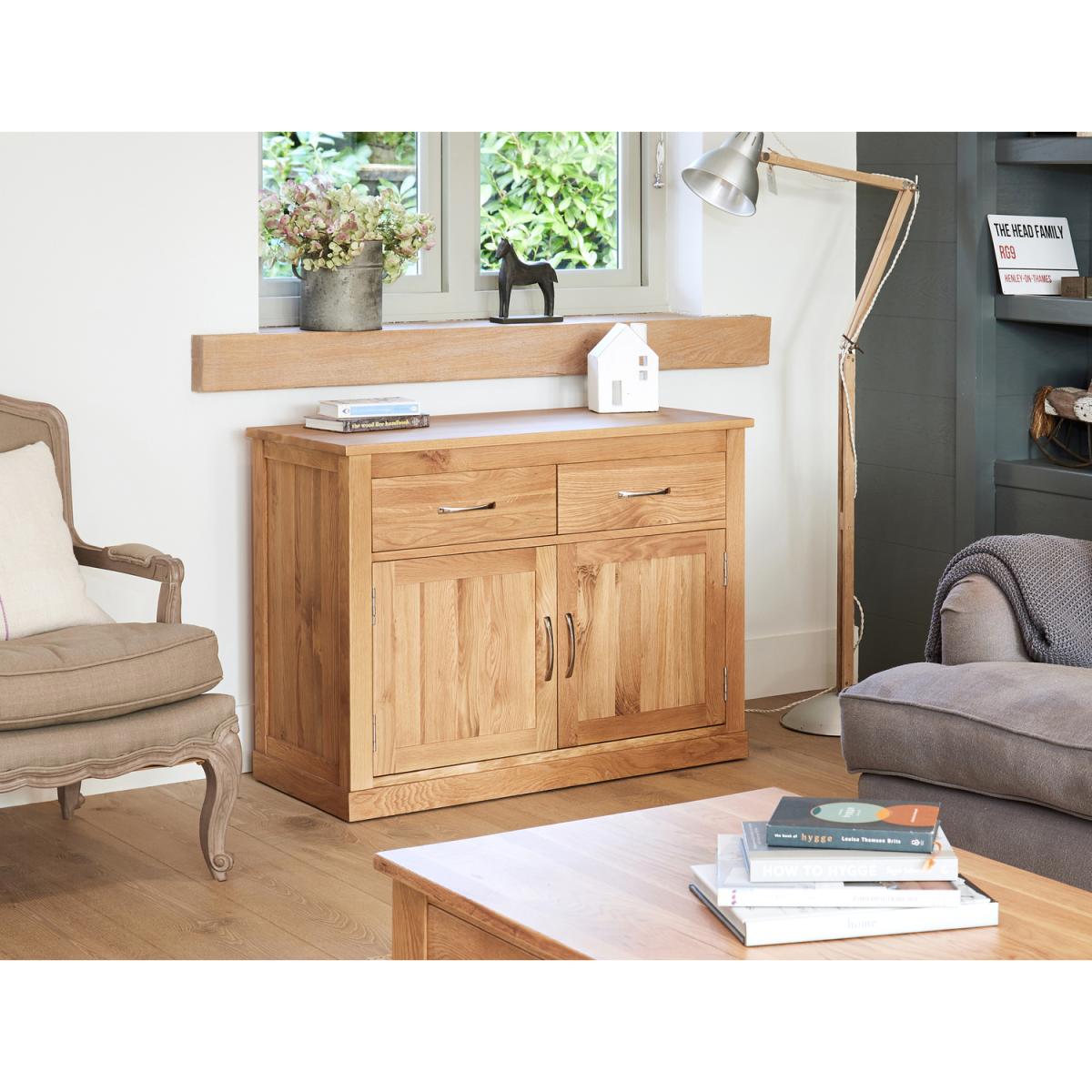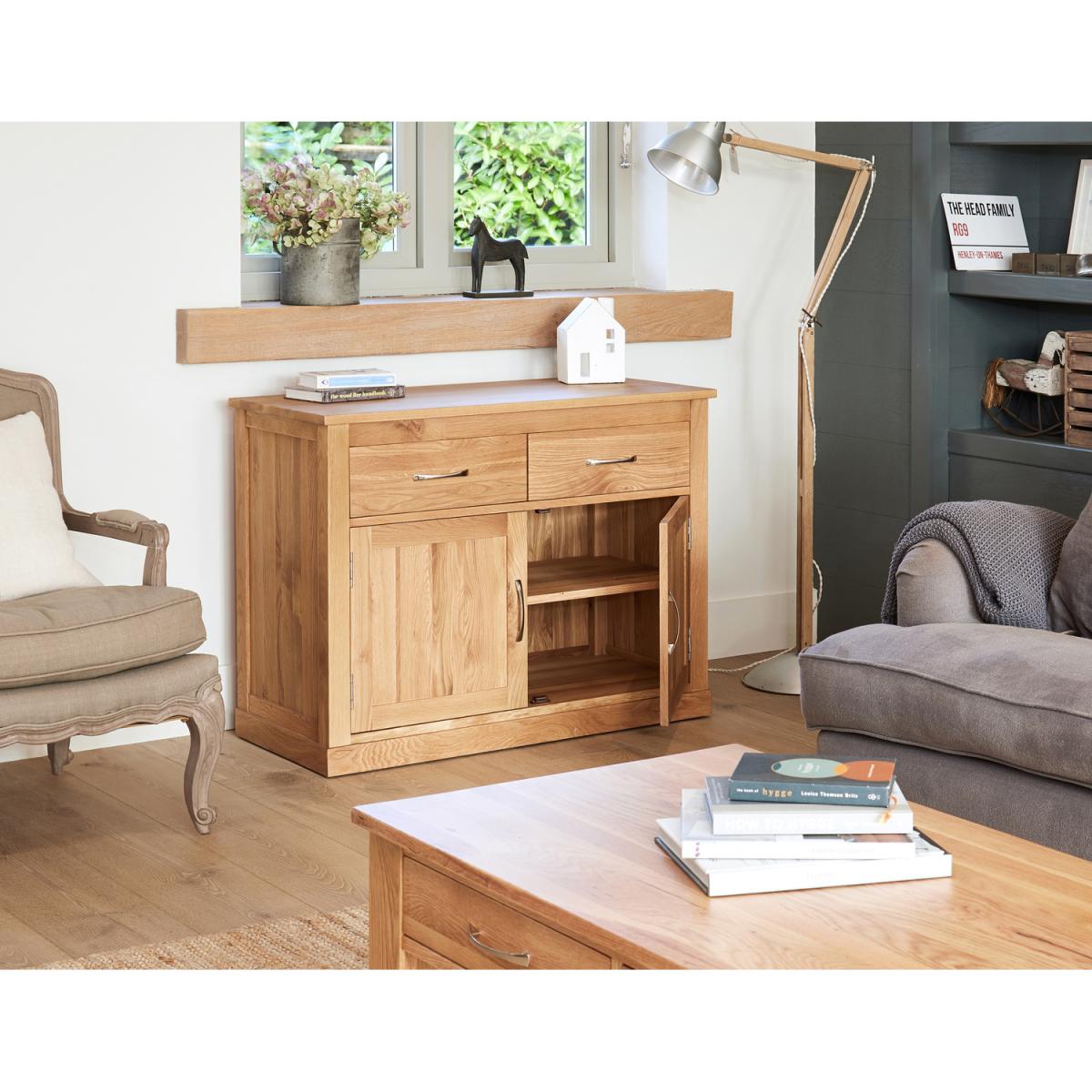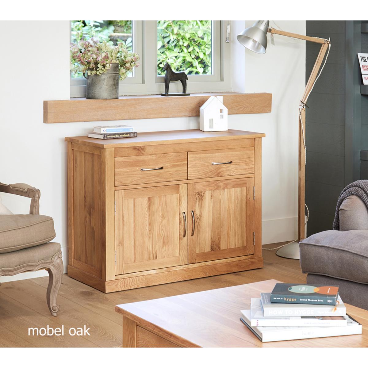 This sideboard comprising of 2 drawers and a double door cupboard. Made with oak no veneers. Metal handles on all drawers and doors. Dovetail joints on drawers. The sideboard has the Mobel signature panel design on the sides. A quality built modern piece of furniture with a satin lacquered finish.