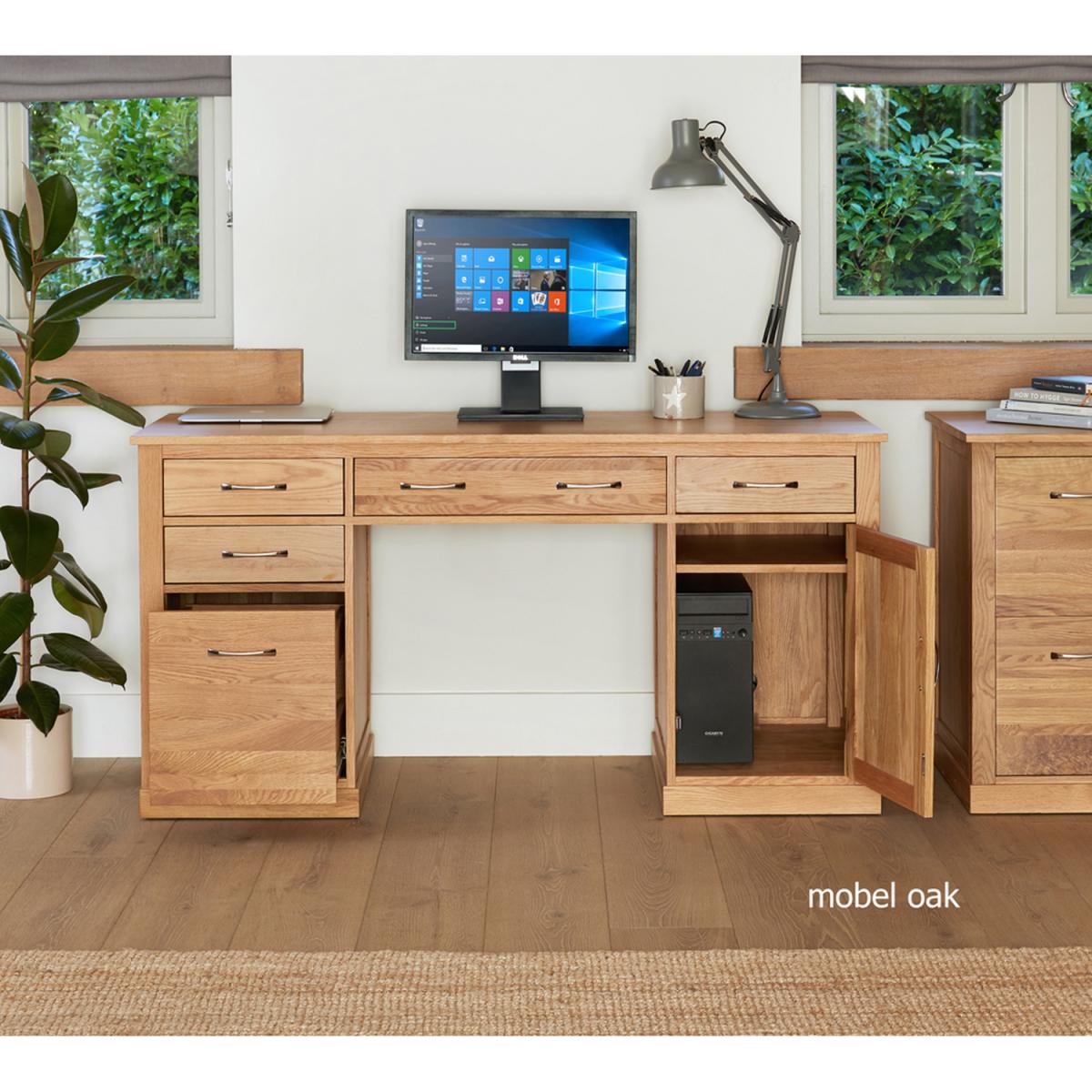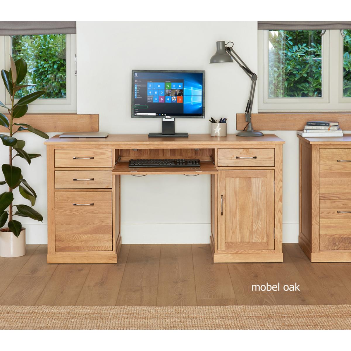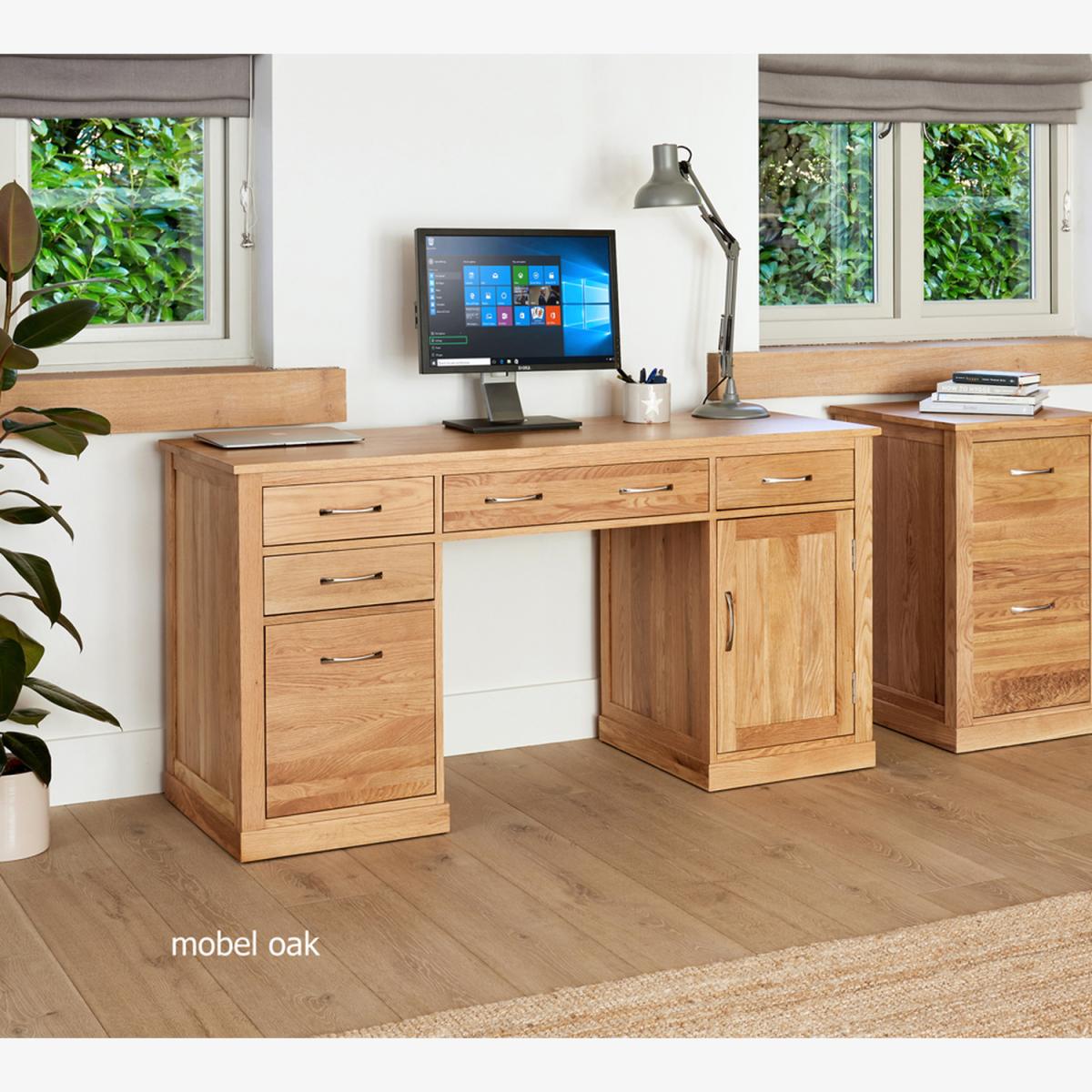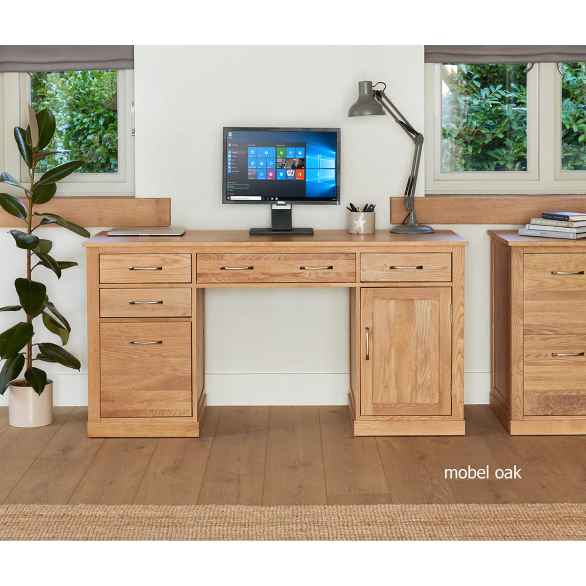 This twin pedestal computer desk has a clean and stylish look. The panel design sides give this desk the signature Mobel Oak look. The pedestals have ample storage including 4 drawers and a cupboard. There is a pull out shelf under the table top give you additional work surface ideal for sitting your keyboard on.