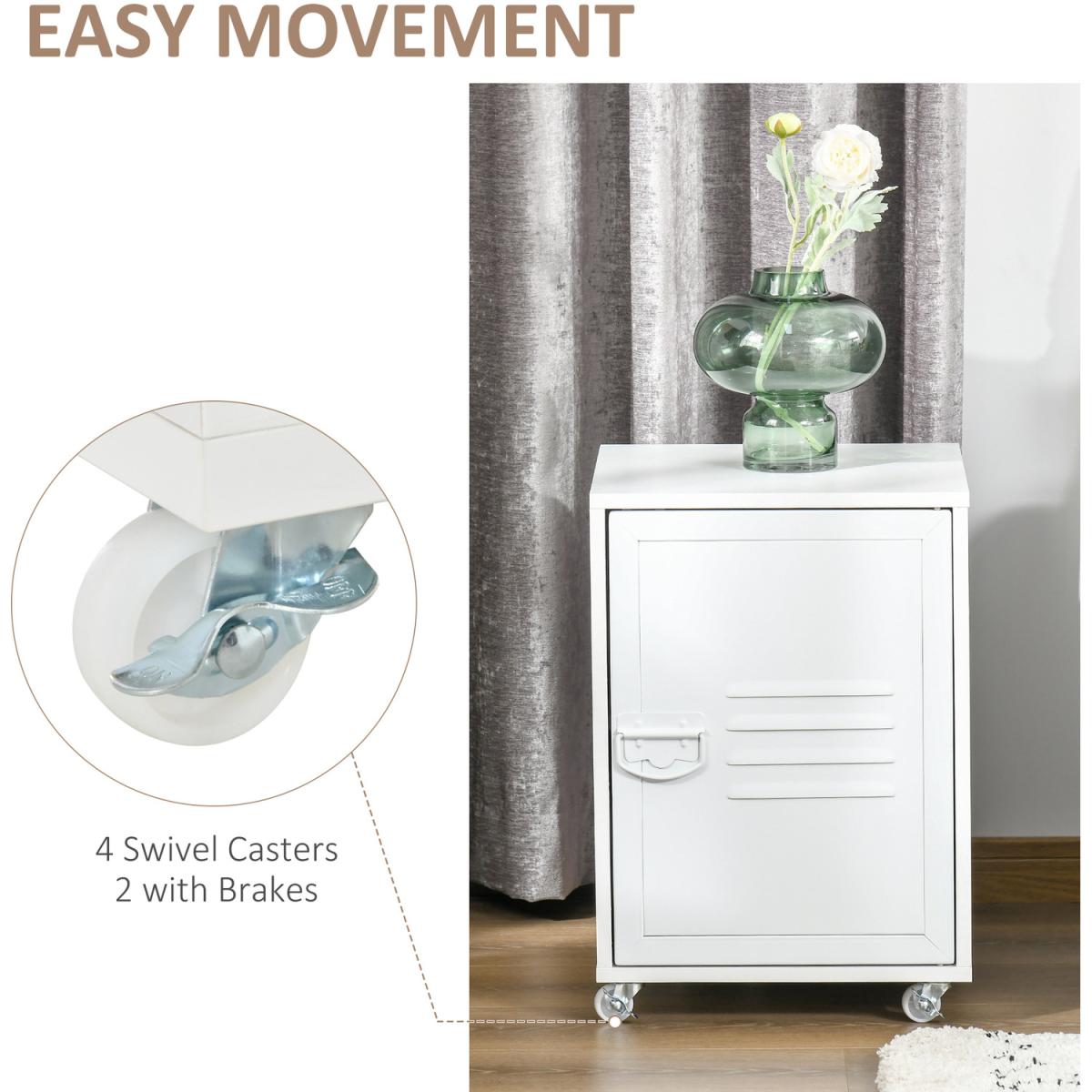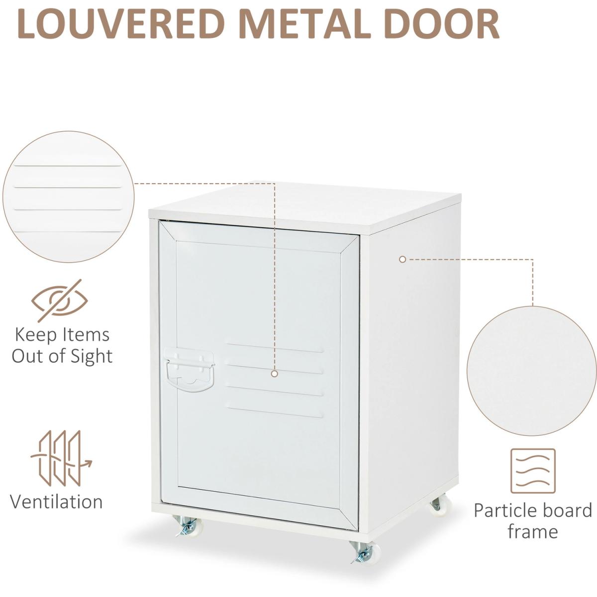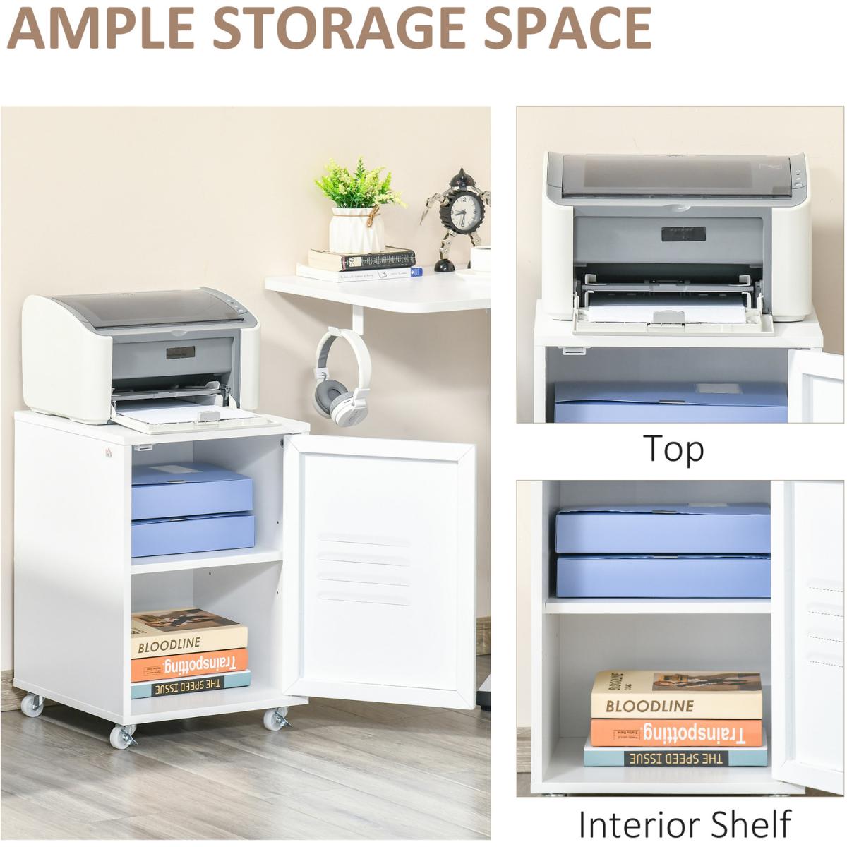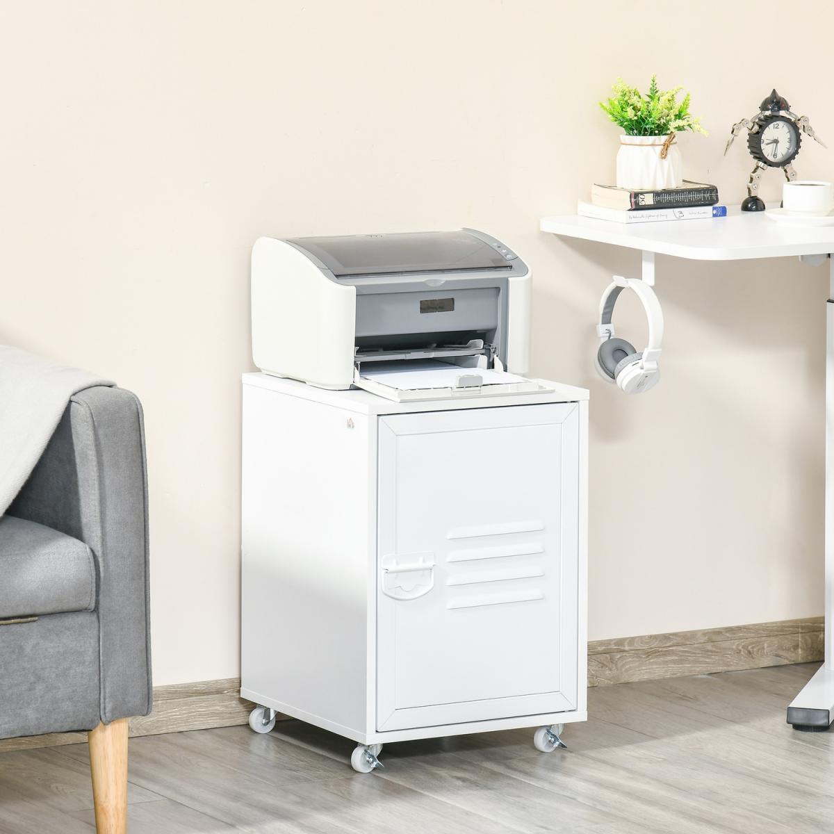 Covered with a louvered metal door to keep items out of sight as well as maintain ventilation. Works perfectly as a file cabinet, bedside table, and printer stand. Magnetic door catch and metal handle are designed for easy open and close. Swivel casters and compact size ensure easy movement.