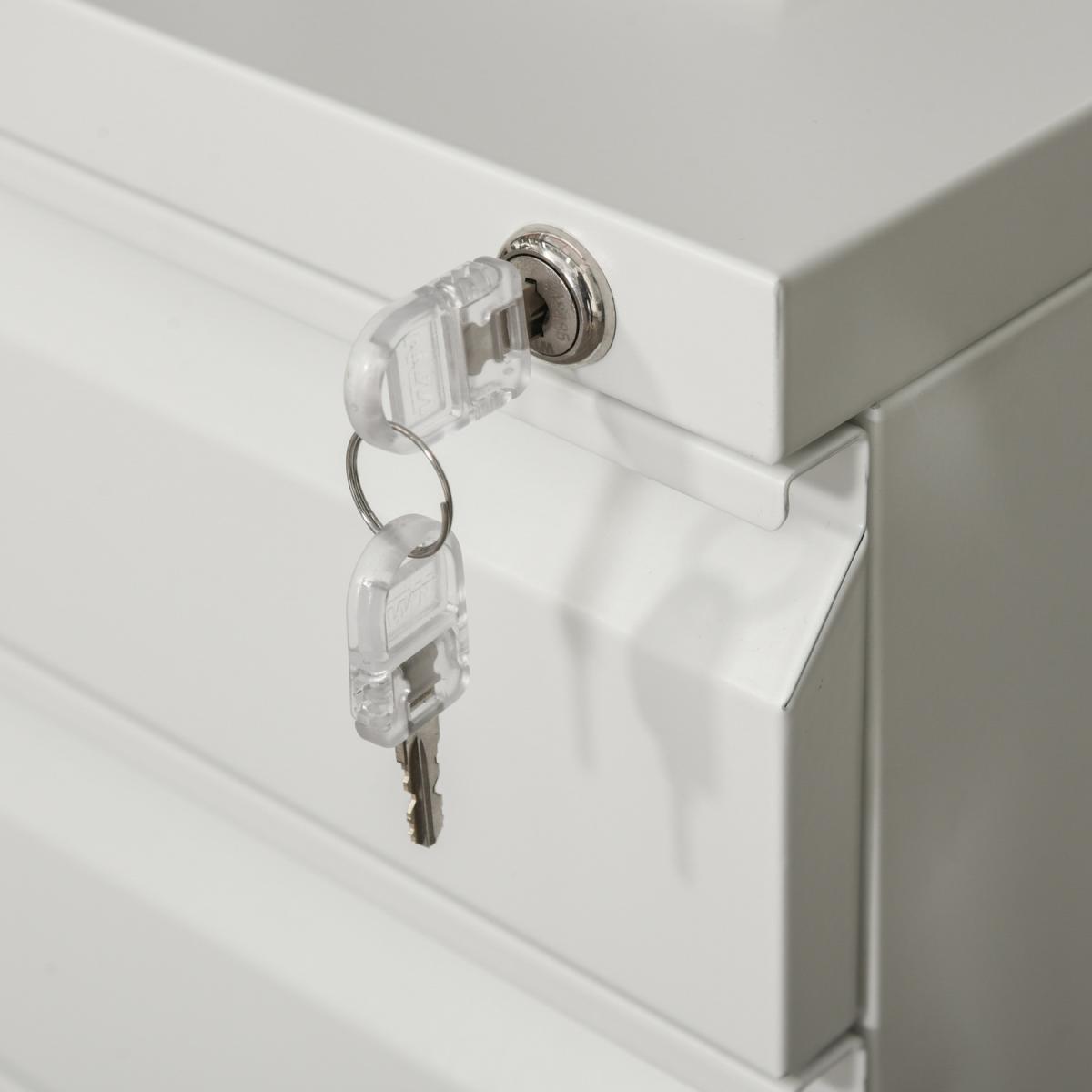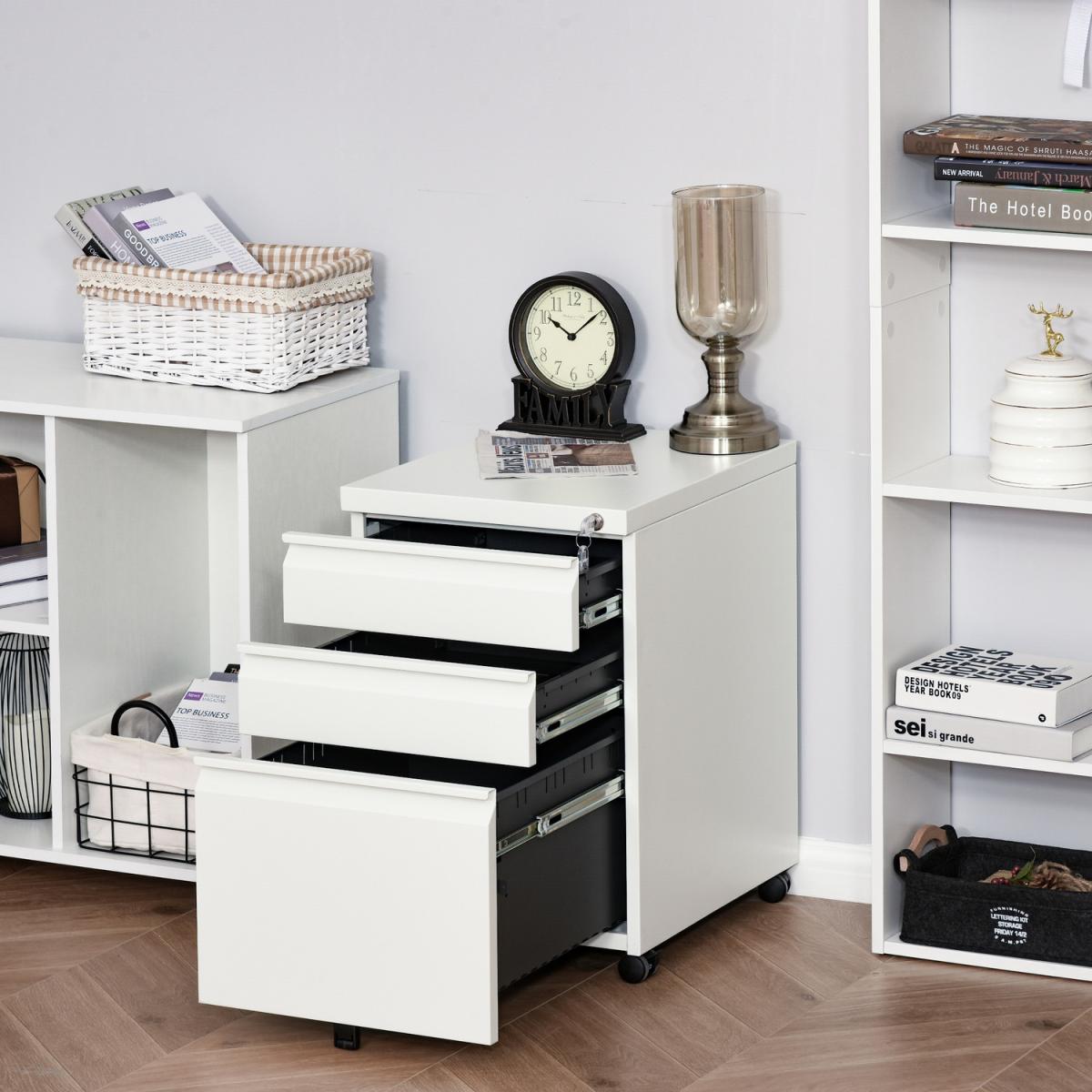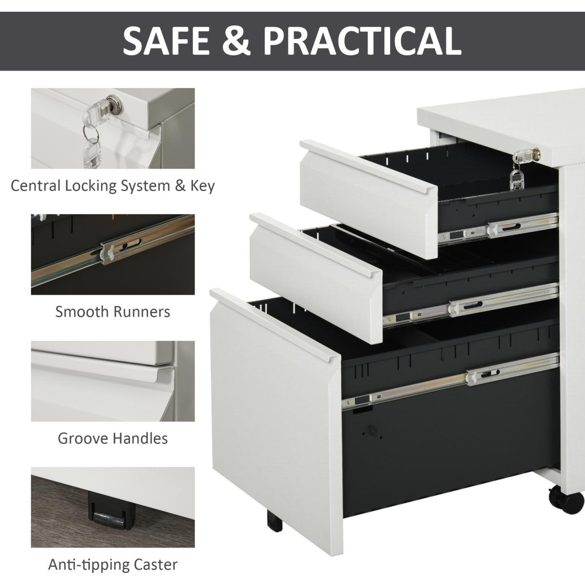 A design which is formed of two small drawers and one large, which gives lots of room for organising: the bottom drawer features hanging rails for A4 folders and files, with a stationery tray in the top drawer for pens and pencils. Made from steel, the frame is tough, with a powder coating to ensure extra protection and strength. There are five wheels fixed on the bottom, which keeps the cabinet balanced, even with the drawers open, and makes it easy to move around - even when full.