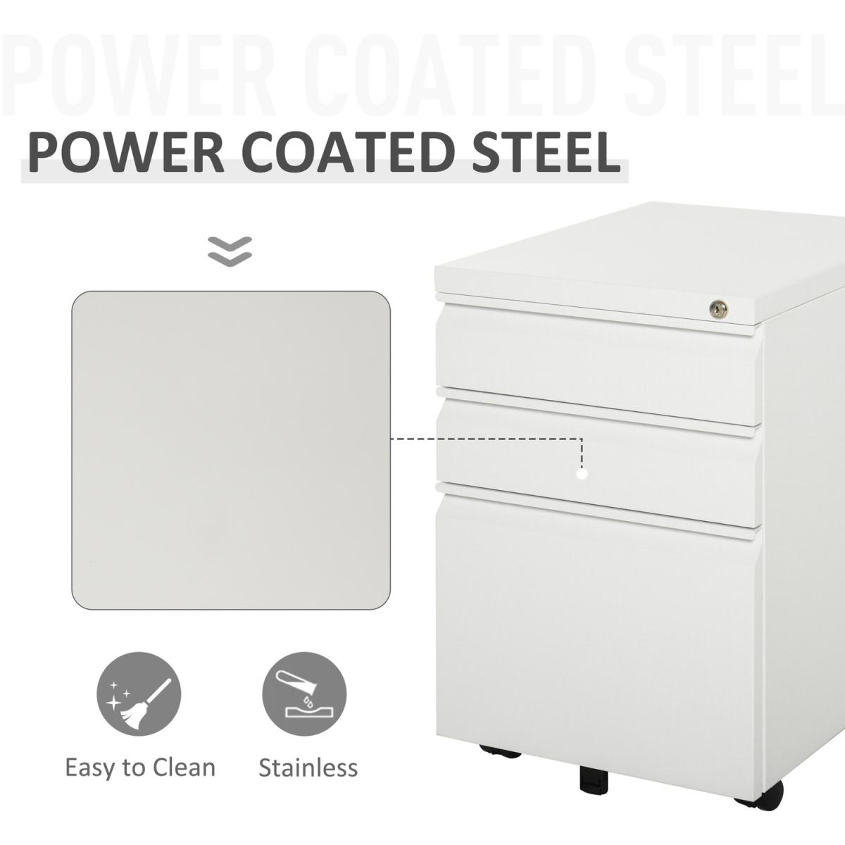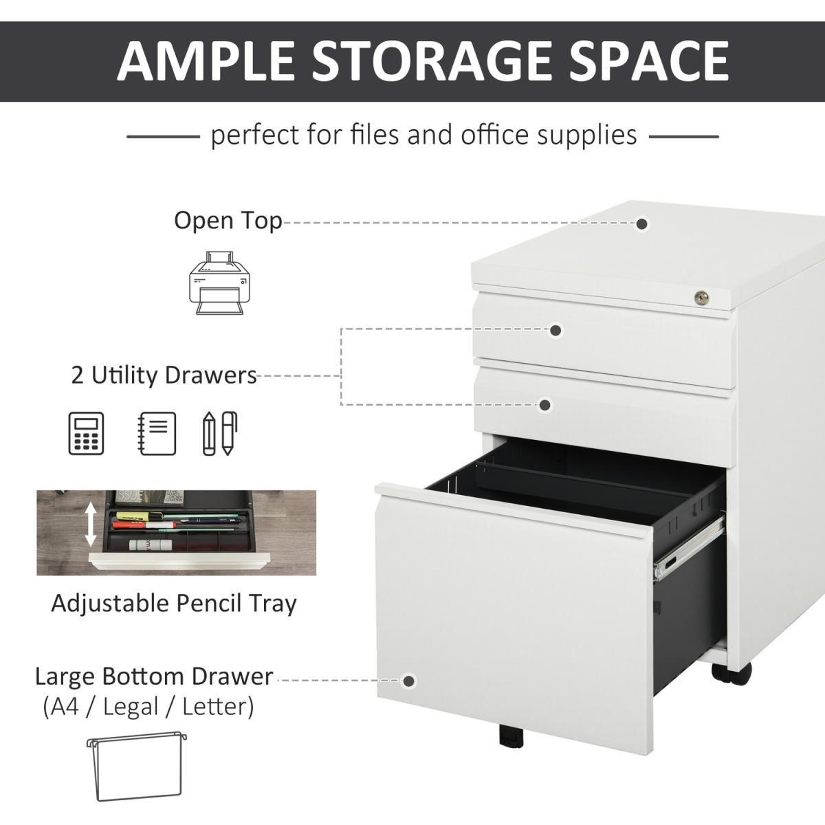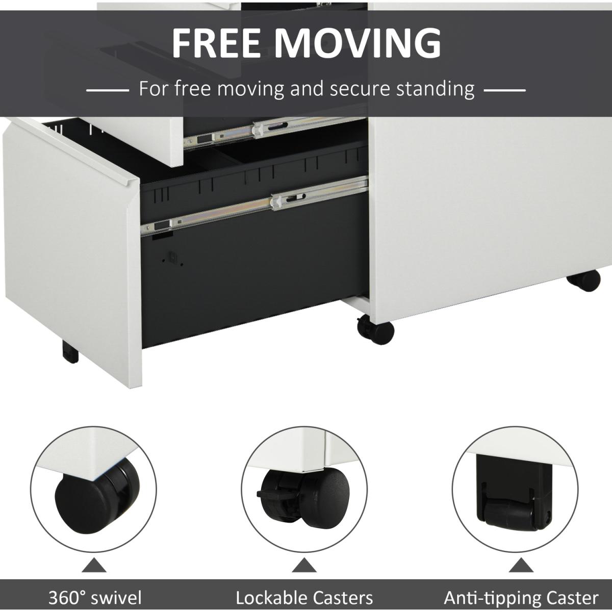 A design which is formed of two small drawers and one large, which gives lots of room for organising: the bottom drawer features hanging rails for A4 folders and files, with a stationery tray in the top drawer for pens and pencils. Made from steel, the frame is tough, with a powder coating to ensure extra protection and strength. There are five wheels fixed on the bottom, which keeps the cabinet balanced, even with the drawers open, and makes it easy to move around - even when full.