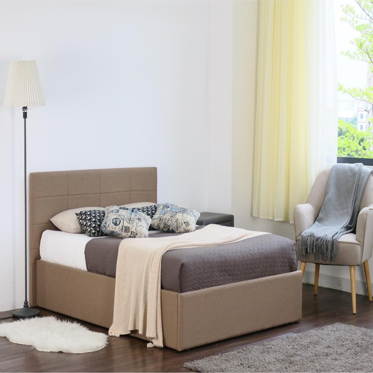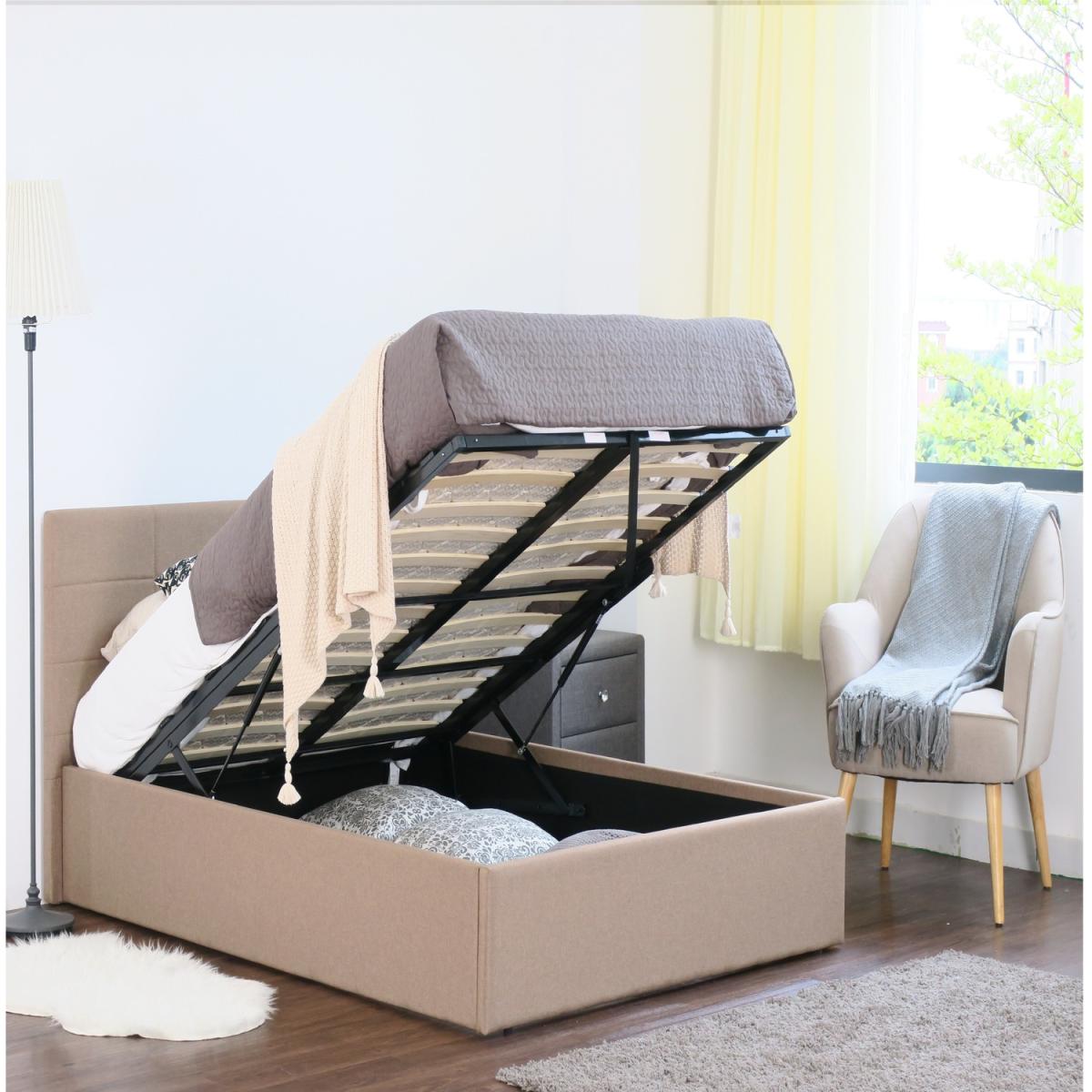 This stylish and modern linen upholstered Ottoman's add a modern presence to any bedroom. They feature a stylish square block upholstered headboard and with padded side rails and footboard. The headboard features colour coordinated modern buttoning detail. Available to purchase in grey, cream or brown these fabric ottomans will suit any modern interior. The great aspect of these bed frames is they feature a gas lift mechanism, that lifts the mattress easily to reveal ample space for storage under the bed. The mattress is supported on a solid beech slats framework.