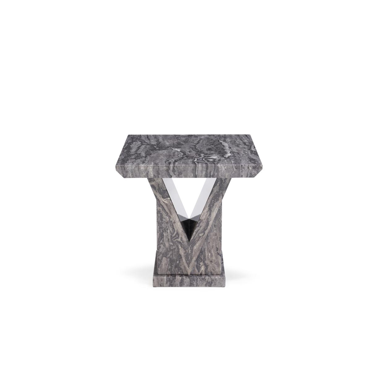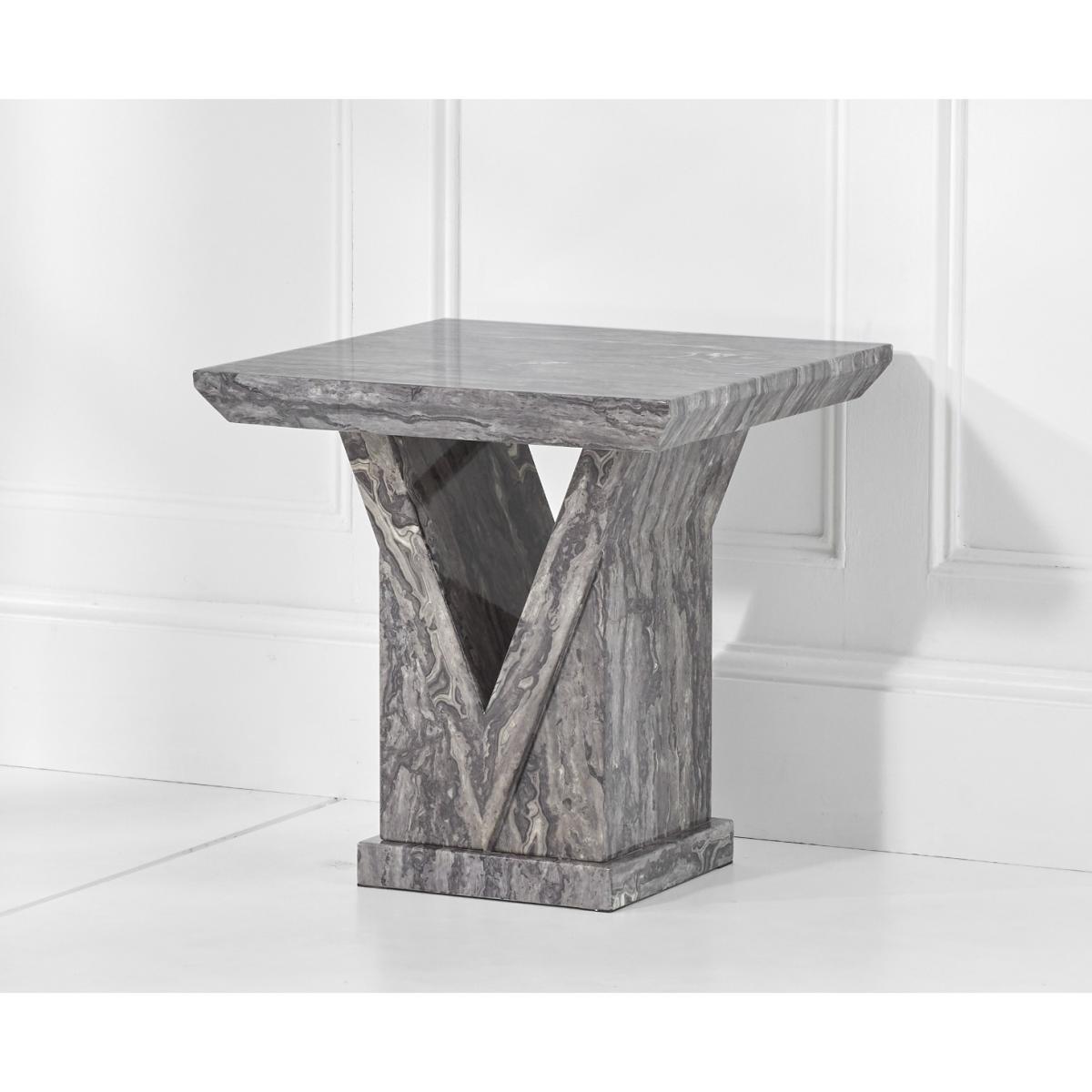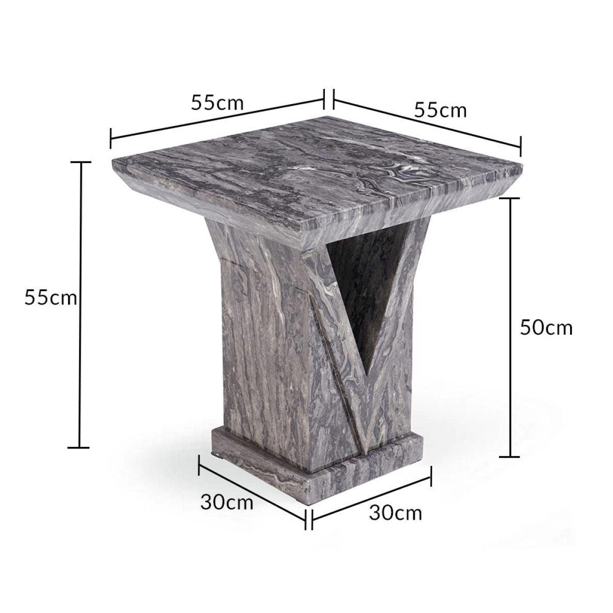 A stunning fusion of bold contemporary style and everyday practicality, the Mocha Grey Marble Side Table is a chic addition to any interior. Instantly updating any space, the grey marble side table features a unique modern design that makes a statement. Hard wearing grey marble side table or lamp table. Beautifully designed with a thick surface for a unique look. Unique V pedestal base design giving great stabilityUV resistant. Heat resistant up to 50 degrees Celsius Additional Measurements:Table Top Thickness: 5cm. Pedestal Width: 30cm. Pedestal Depth: 30cm. Height to Underside of Table Top: 50cm