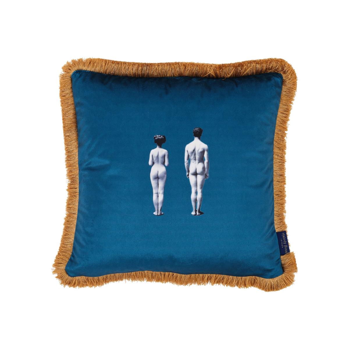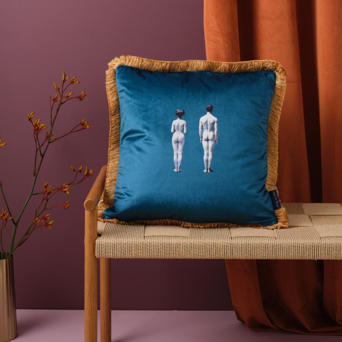New Melody Rose's sumptuous velvet cushion featuring the Models design in a unique shade of Bayberry Blue now features a luxurious handcrafted gold fringe ruche, for a truly luxurious update to any room. The luxurious fringe ruche frames the Models design on one side and features a plain Bayberry Blue back giving two options for display. Perfect on it’s own or mix and match to combine your choice of designs and colors to create a unique look. The Models cushion also available in burnt orange, sharkskin grey, vintage rose and lush meadow green. Made entirely in England. Includes plump feather inner cushion.