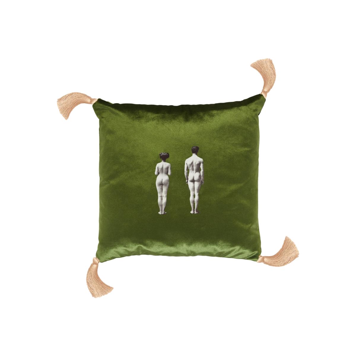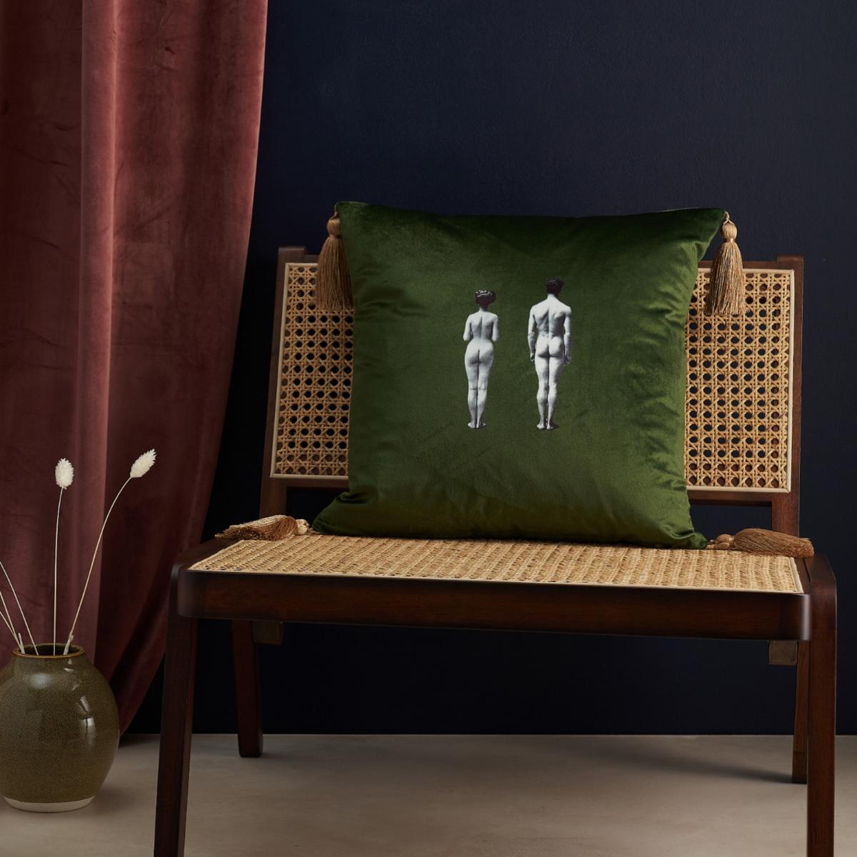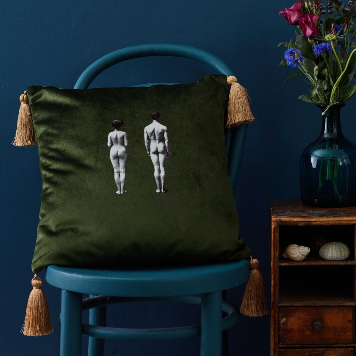 A sumptuous velvet cushion featuring the cheeky Models design in lush meadow green from the Melody Rose 'Modern Surrealist' collection. Inspired by the Surrealists of the early 20th century, the design pays homage to the movement which finds magic and beauty in the unexpected and the uncanny, the disregarded and the unconventional. Perfect on it’s own or mixed and matched, the design is available in a range of colours. Made in England, each cushion is finished with elegant handmade burnished gold tassels. Features hidden zip and plump duck feather inner cushion pad.