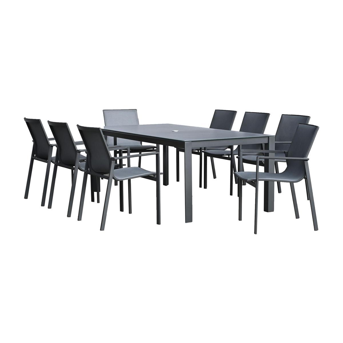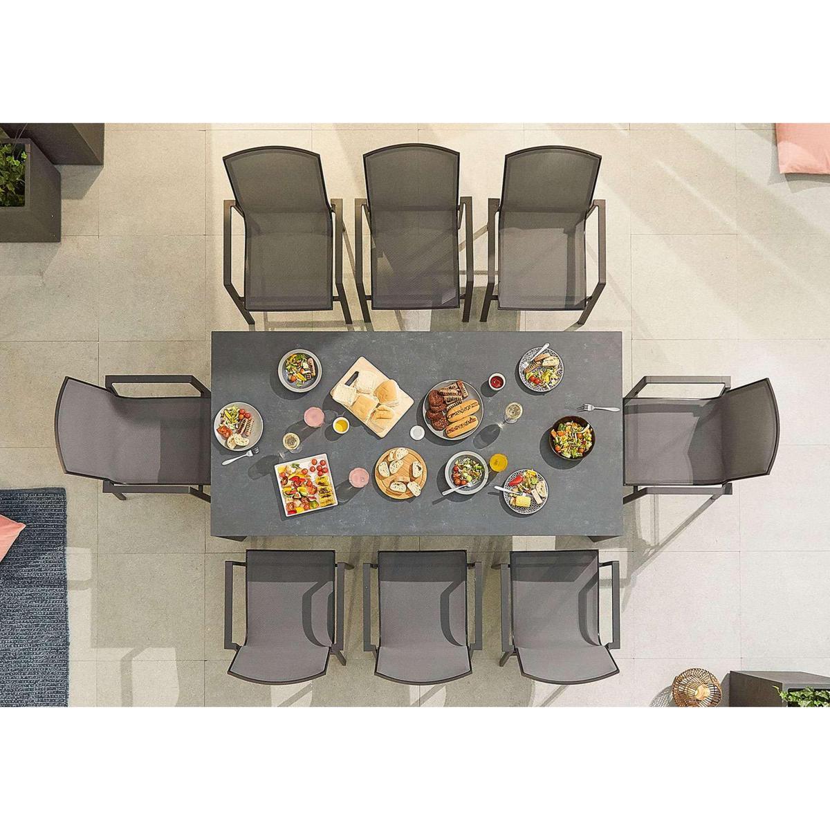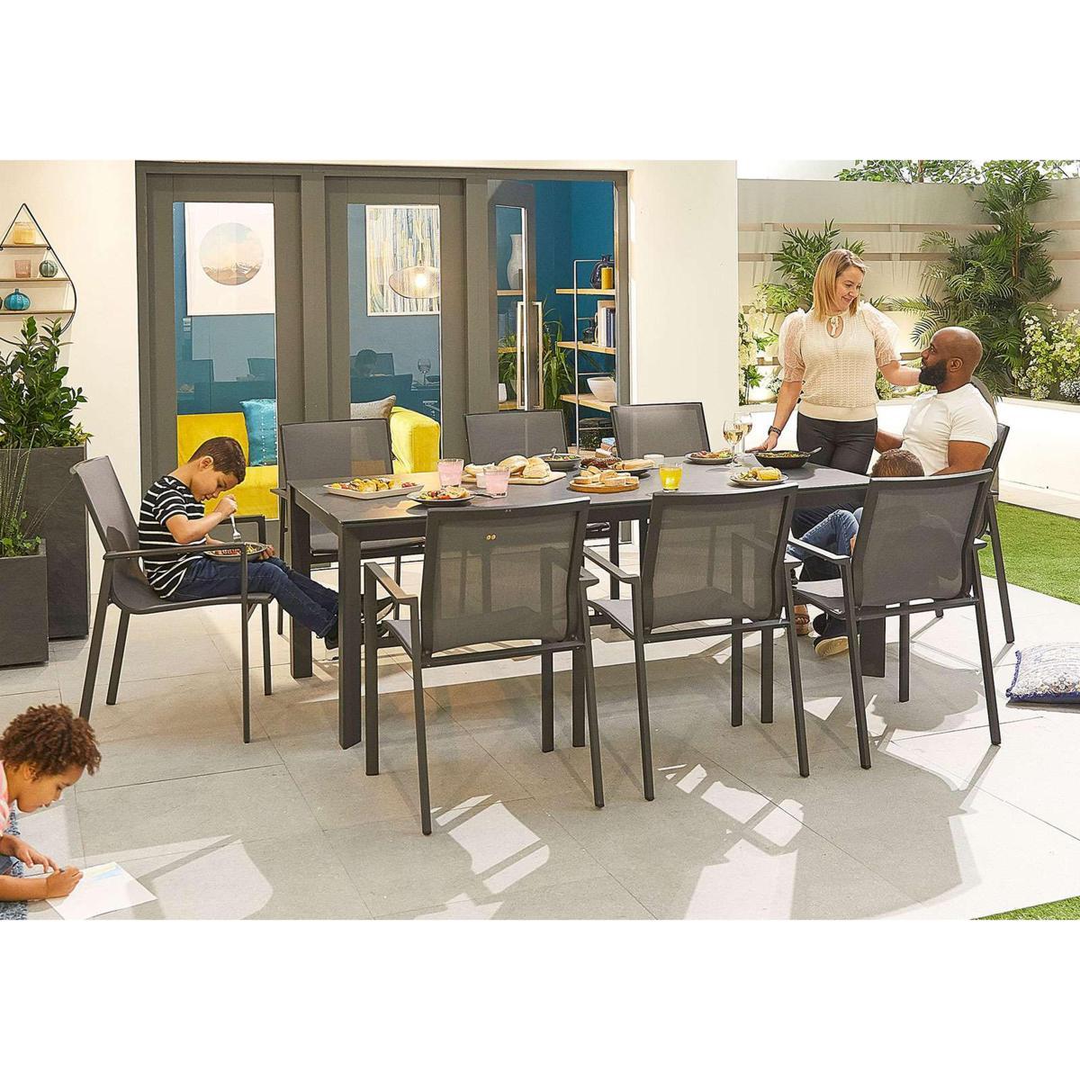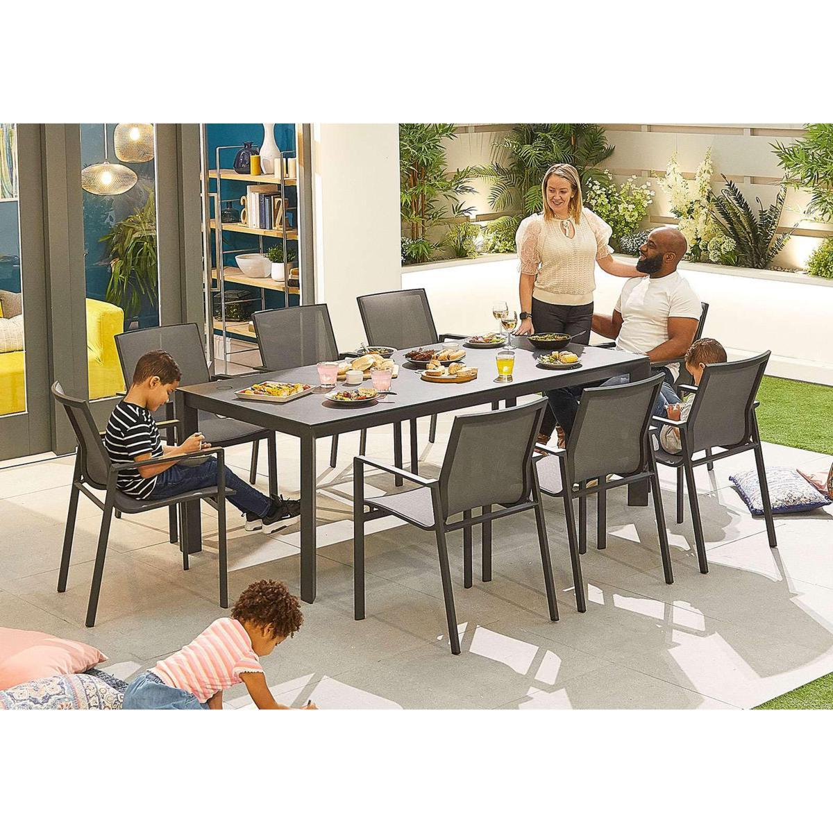 There’s plenty of room to dine al fresco with family and friends with the beautiful Modena dining set in aluminium and ceramic glass. Sleek, modern and it can stay outside all year. Why you’ll love it. Incredibly stylish, low maintenance outdoor dining set. Large rectangular table seats eight, perfect for large patios. Chairs have quick-dry textilene seats. Sleek modern style in lightweight, powder-coated aluminium. Ceramic glass table top is tough, spill-proof and easy to clean. UV resistant, this all-weather garden furniture won’t fade or rust. So you can leave it outdoors all year. Made to last with a 5-year manufacturer’s guarantee. What you need to know. The powder-coated, UV protected aluminium frames are completely rust-proof and weatherproof. No need to cover. Textilene fabric seats. Textilene is a quick drying all-weather fabric. Parasols are available to buy separately. Akzo Nobel powder-coating is an established, industry-leading powder coating technology recognised as the best in the world. The ceramic glass table top is toughened and highly scratch resistant. This garden dining set can be left outside all year round. Clean aluminium furniture with warm soapy water and a soft cloth. Avoid abrasive cloths or chemical cleaners. If your furniture is exposed to salty coastal winds we advise regular wiping down, and covering the furniture in winter and in stormy weather.