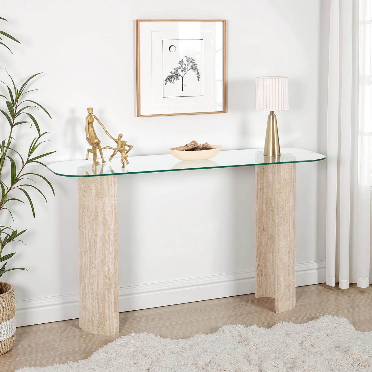 The Modena Console Table offers a modern mix of materials and finishes, perfect for contemporary living spaces. Featuring a clear glass top combined with a cream marble-effect gloss surface and light oak-effect veneer, this piece brings a stylish yet practical touch to any hallway, living room, or dining area. Its clean, streamlined design and neutral tones make it easy to coordinate with a variety of interiors, providing both display space and everyday functionality. UK Mainland delivery only, between 9am - 9pm (weekdays) the courier will contact you on the day of delivery to offer a time slot. This takes place within 10 working days (Ground floor only). Please also ensure that we have a note of your up-to-date address and contact information, including daytime phone number and email address to be passed to the couriers.