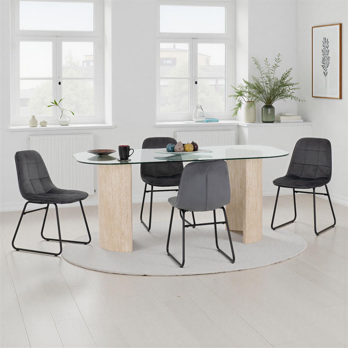 Add a touch of modern sophistication to your dining area with the Modena Dining Set and Lukas Chairs. Featuring a clear glass and cream marble-effect table paired with soft upholstered chairs, this set offers a balance of style and comfort. Perfect for contemporary homes, it combines visual charm with everyday practicality. Whether enjoying daily meals or entertaining guests, the Modena set creates an inviting atmosphere without dominating your space. Its neutral colours and clean lines make it a versatile fit for interiors ranging from minimalist to chic. UK Mainland delivery only, between 9am - 9pm (weekdays) the courier will contact you on the day of delivery to offer a time slot. This takes place within 10 working days (Ground floor only). Please also ensure that we have a note of your up-to-date address and contact information, including daytime phone number and email address to be passed to the couriers.