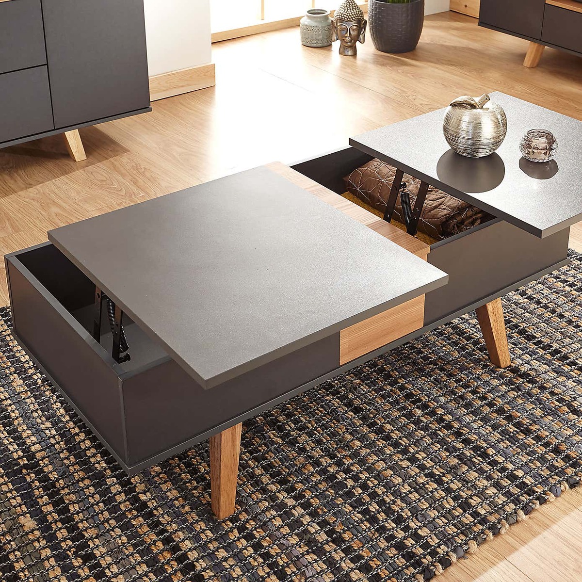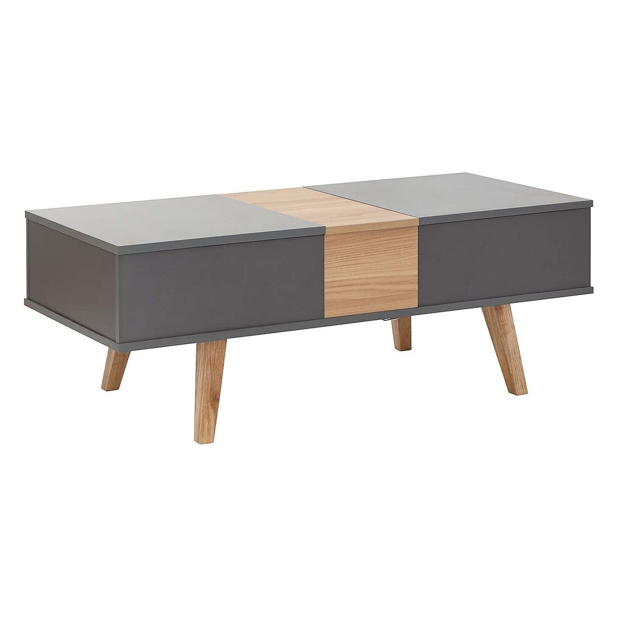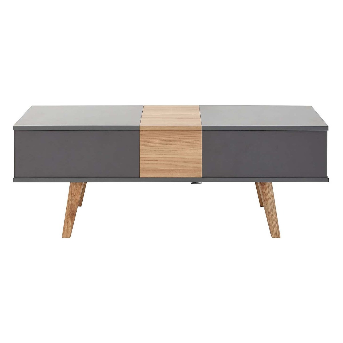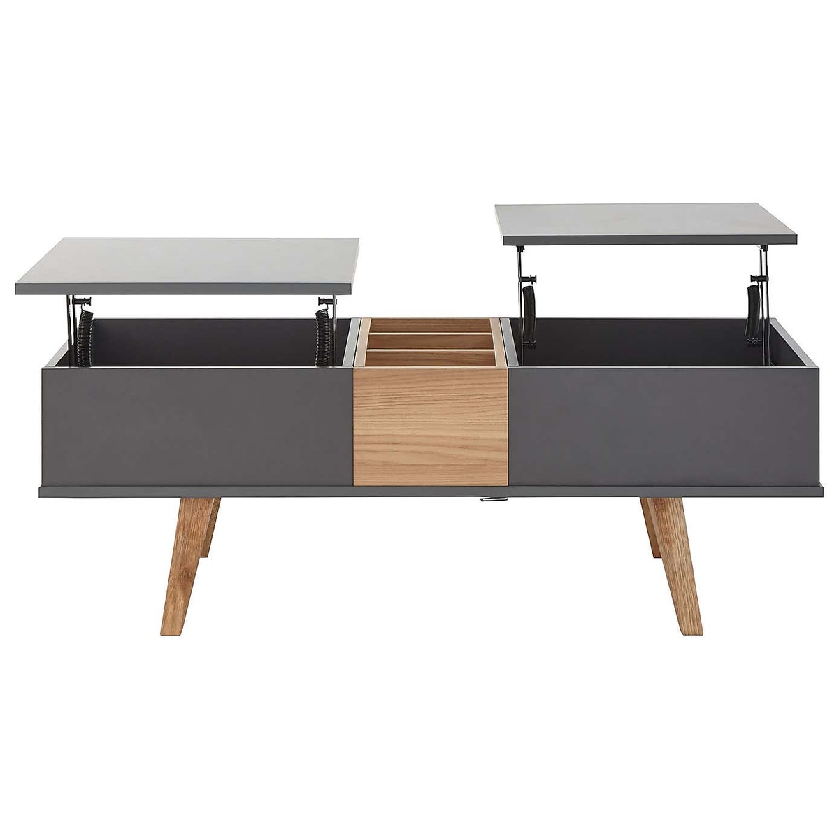 Crafted with a modern Scandi design, the Modena coffee table is finished in a durable, scratch-resistant slate grey melamine, with a contrasting oak effect centre and legs. This self-assembly coffee table boasts an array of multi-functional design features, with two lift-top sections to provide a higher table surface and reveal ample storage space beneath. These can be configured to open from both sides of the table, and include soft-close hinges for added convenience. The centre compartment also slides open to reveal an additional storage space, with the lid able to be easily stored beneath the table. Please note, unfortunately we cannot deliver this item to the Channel Islands.