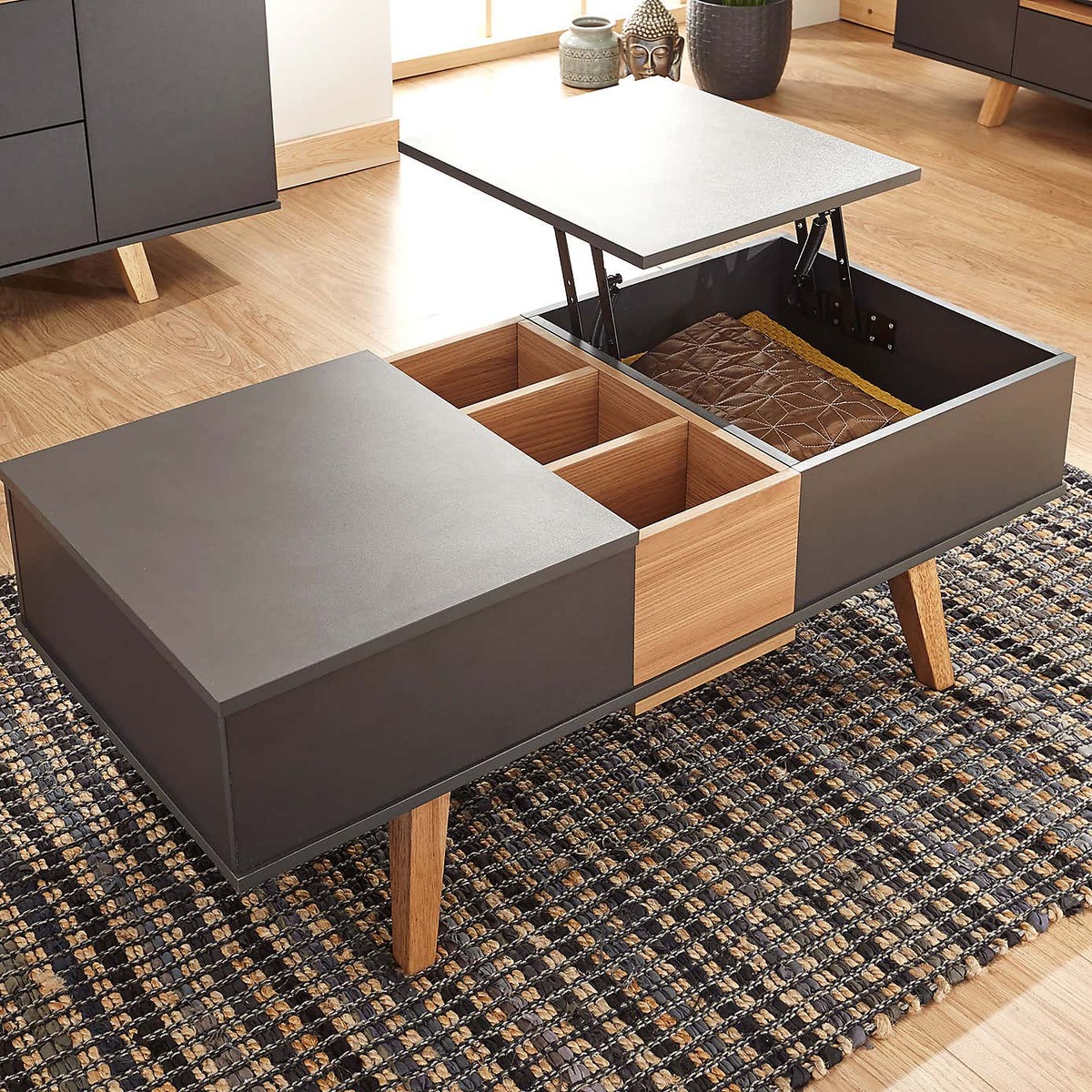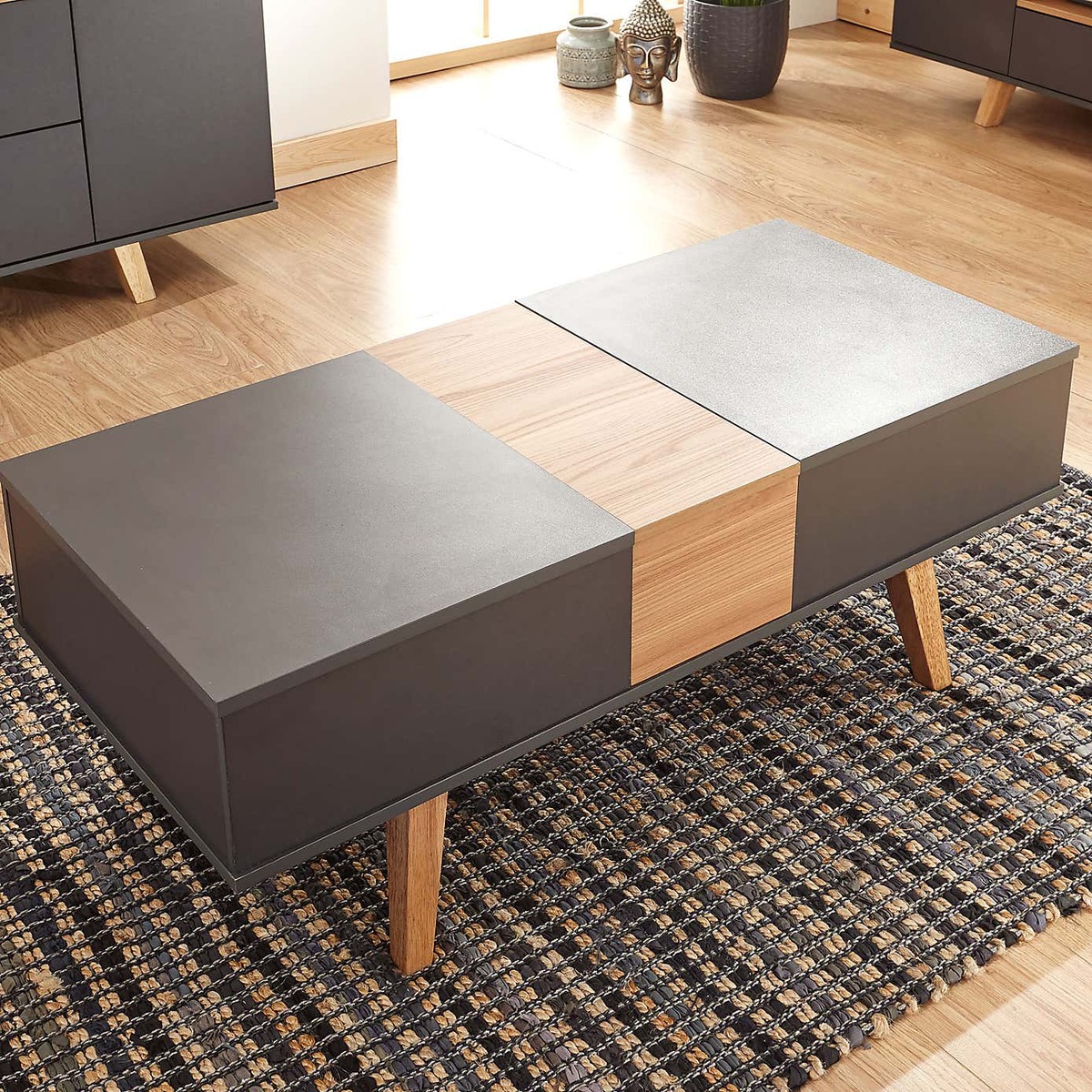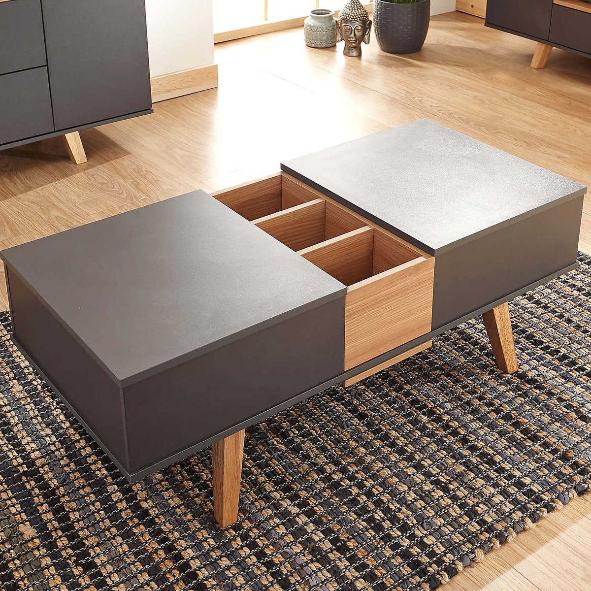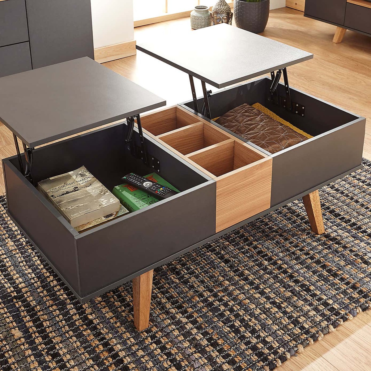 Crafted with a modern Scandi design, the Modena coffee table is finished in a durable, scratch-resistant slate grey melamine, with a contrasting oak effect centre and legs. This self-assembly coffee table boasts an array of multi-functional design features, with two lift-top sections to provide a higher table surface and reveal ample storage space beneath. These can be configured to open from both sides of the table, and include soft-close hinges for added convenience. The centre compartment also slides open to reveal an additional storage space, with the lid able to be easily stored beneath the table. Please note, unfortunately we cannot deliver this item to the Channel Islands.