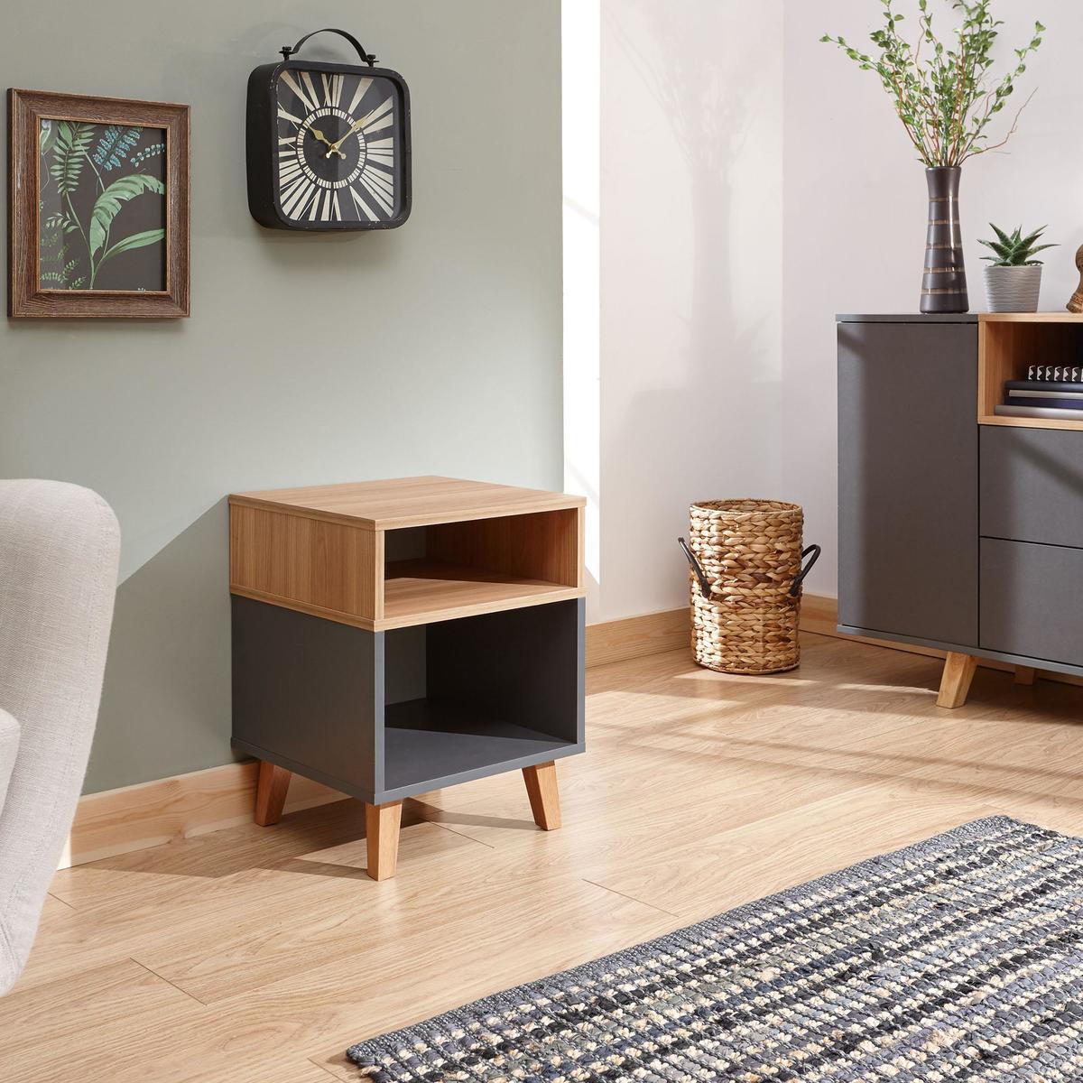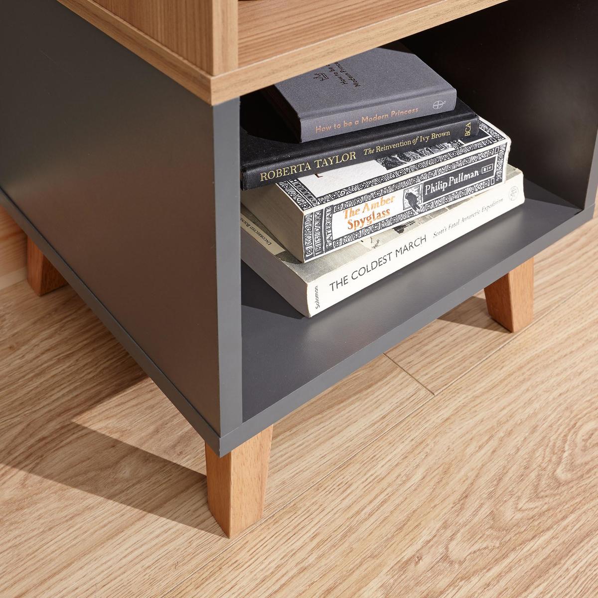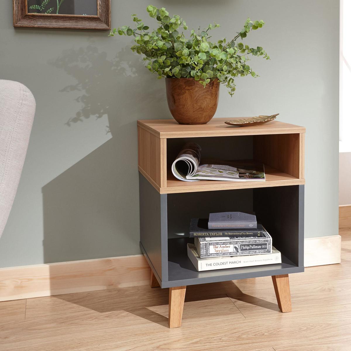 Crafted in a modern Scandi design, the Modena side table offers a clean, minimalist look and would be a great addition to any modern living space. This self-assembly side table features a mix of durable, scratch-resistant slate grey melamine and an oak effect finish, with four retro Scandi-style legs to complete the look. The two double-sided open shelves offer plenty of storage and versatility, allowing the table to be positioned in the centre of the room, or against a wall. Please note, unfortunately we cannot deliver this item to the Channel Islands.