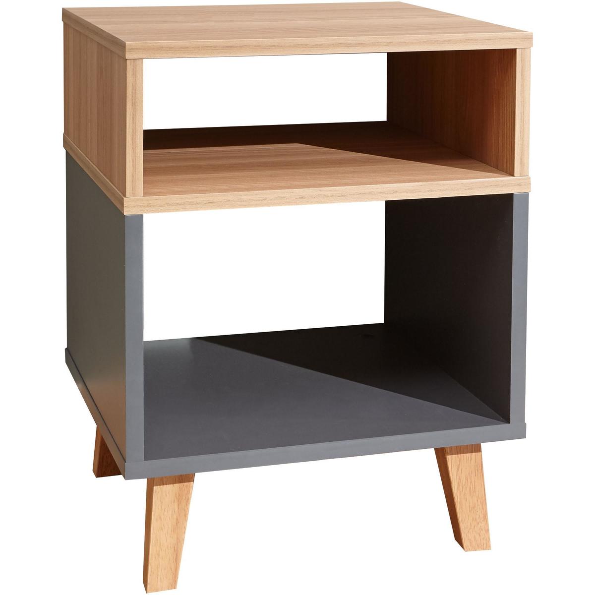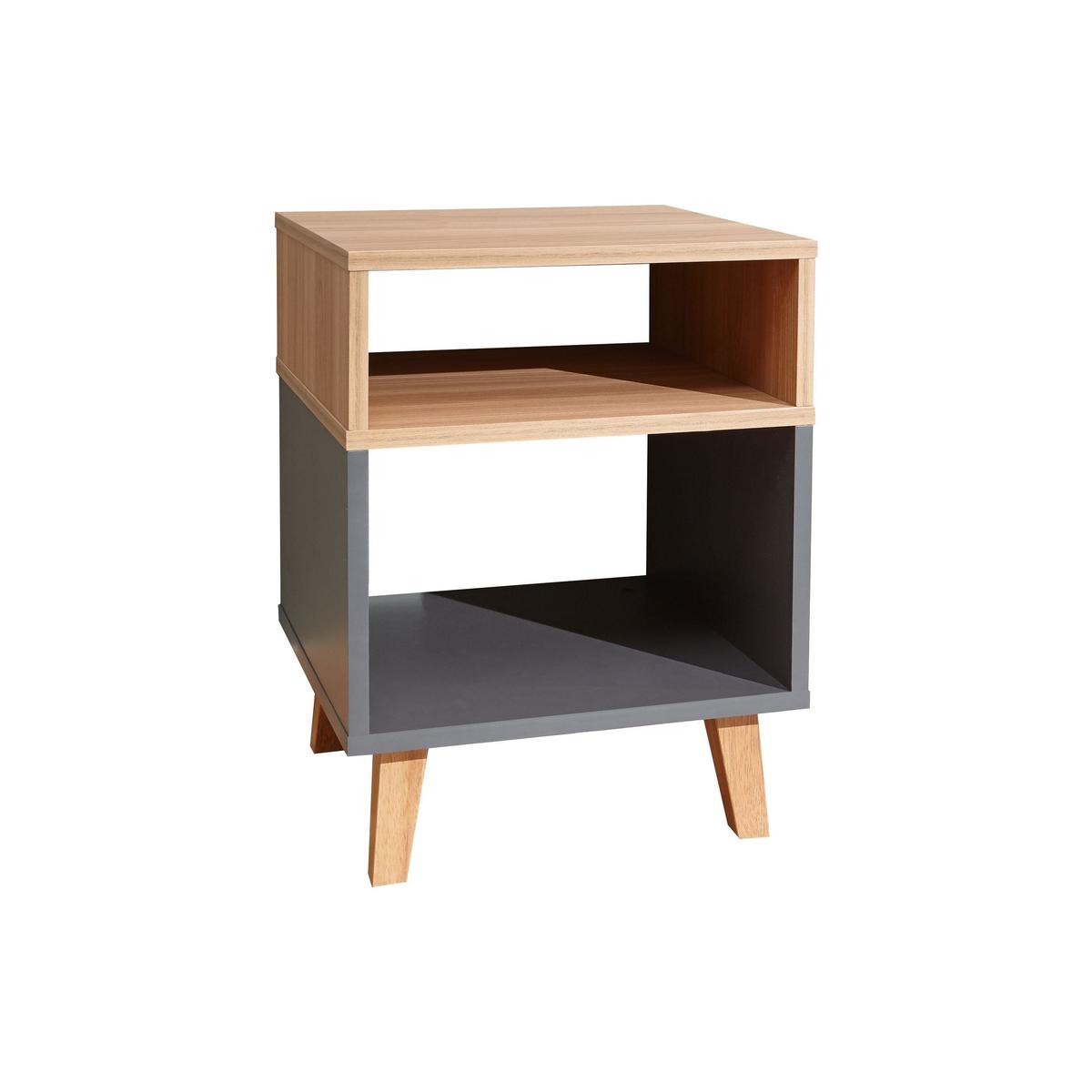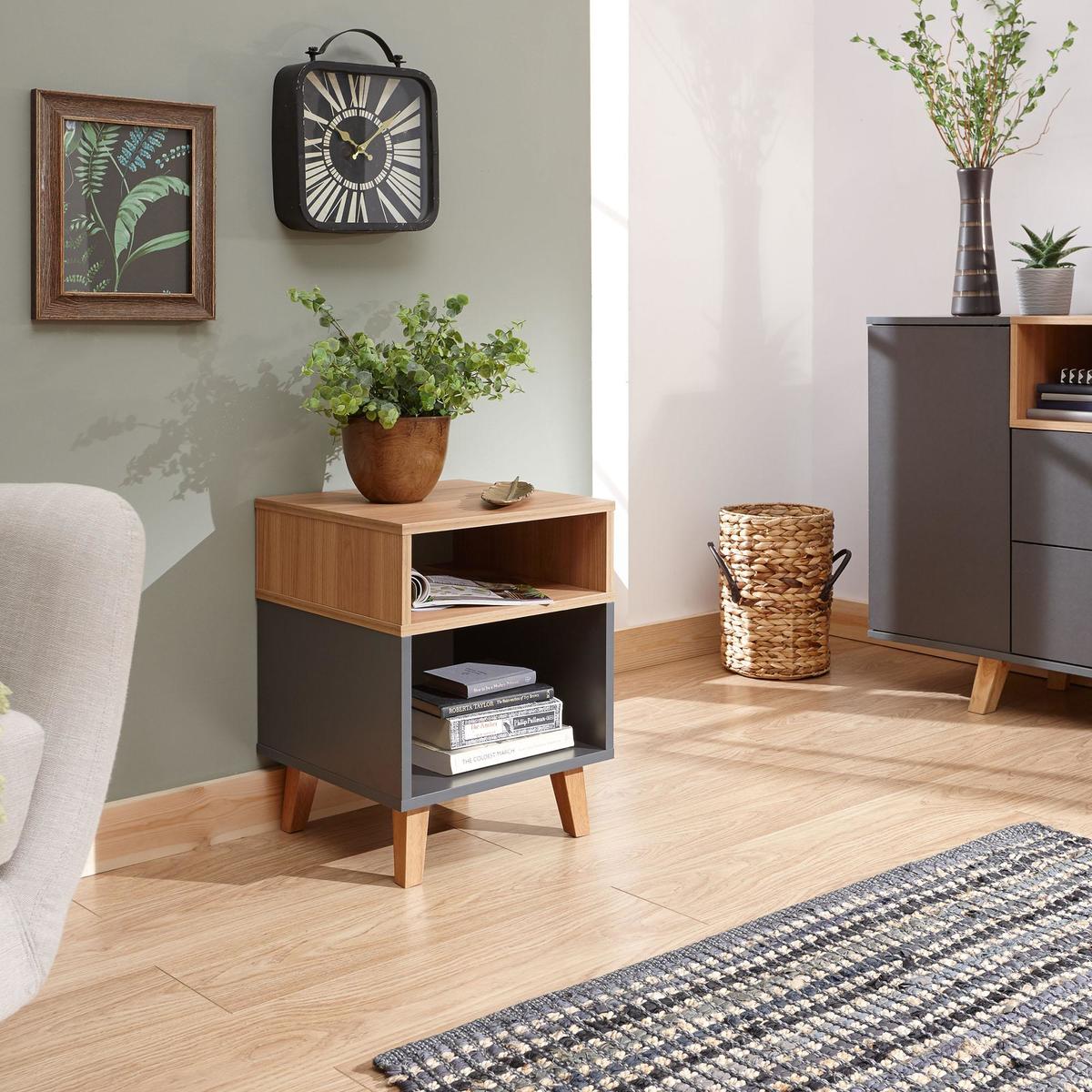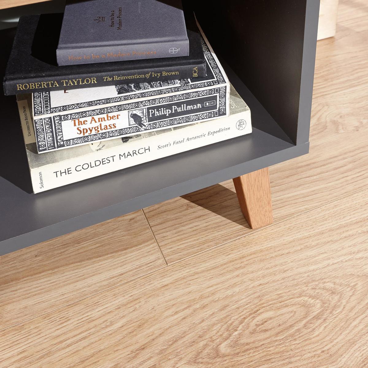 Crafted in a modern Scandi design, the Modena side table offers a clean, minimalist look and would be a great addition to any modern living space. This self-assembly side table features a mix of durable, scratch-resistant slate grey melamine and an oak effect finish, with four retro Scandi-style legs to complete the look. The two double-sided open shelves offer plenty of storage and versatility, allowing the table to be positioned in the centre of the room, or against a wall. Please note, unfortunately we cannot deliver this item to the Channel Islands.