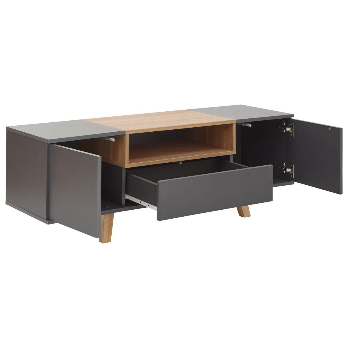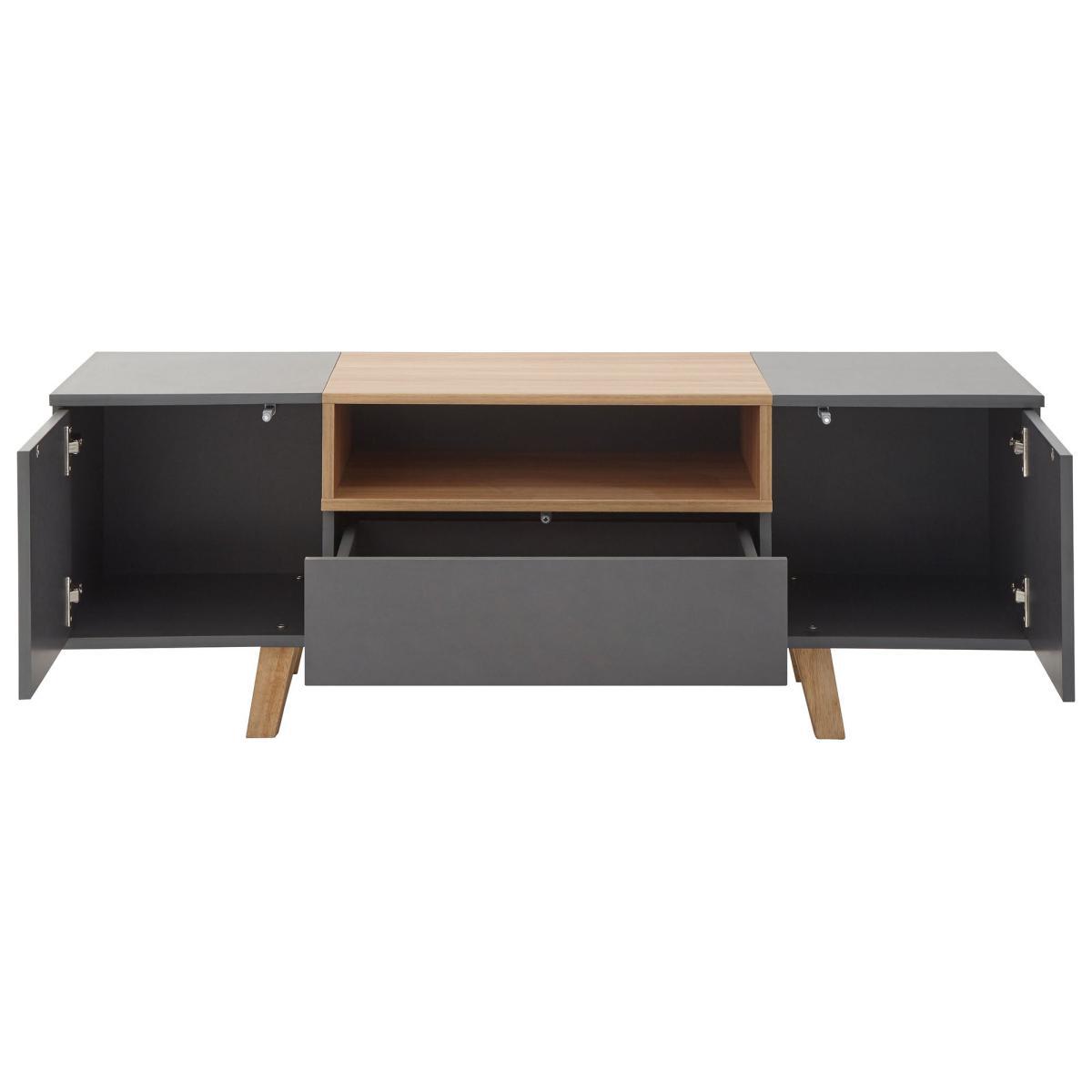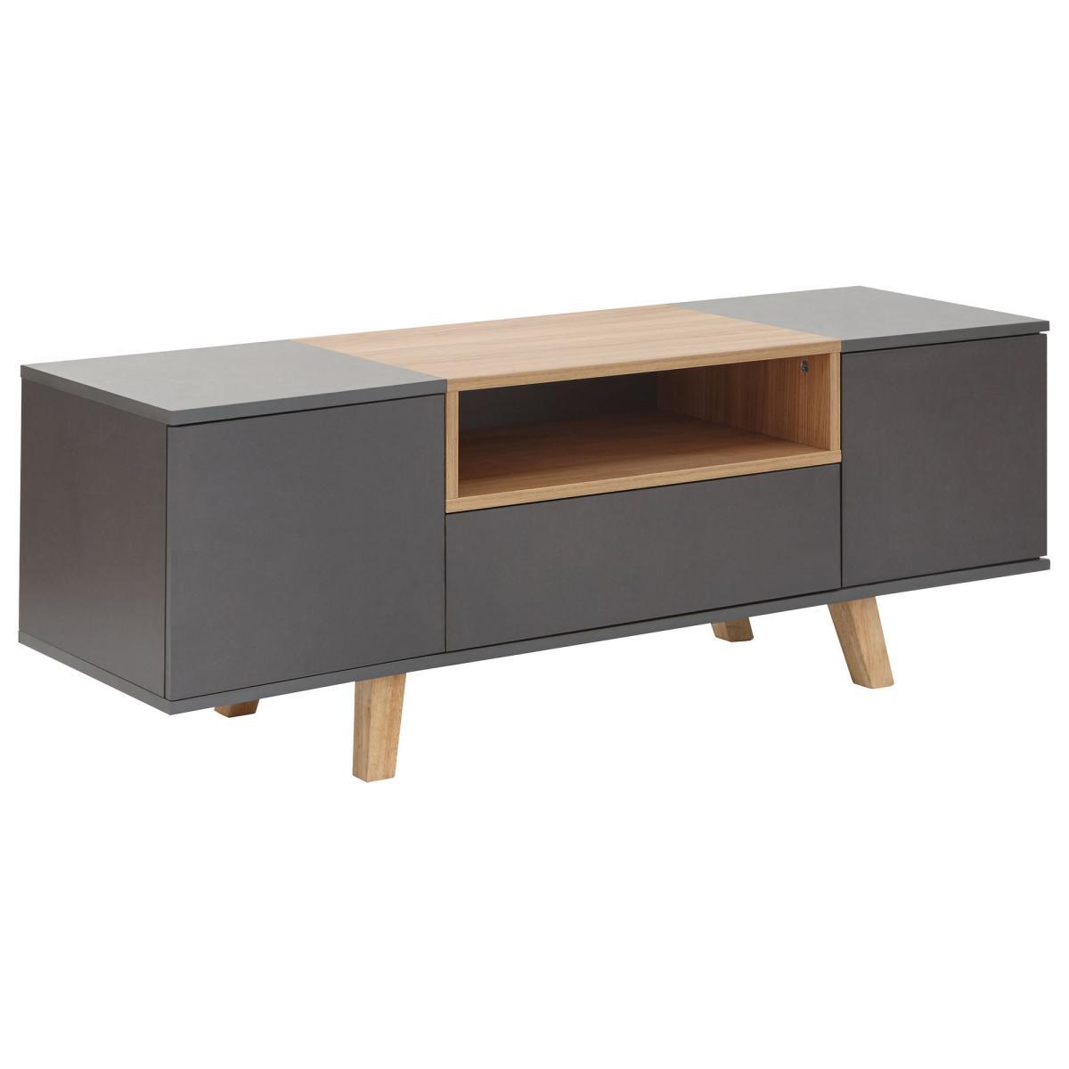 Crafted with a modern Scandi design, the Modena TV stand offers plenty of useful storage space and would be a great addition to any modern space. This self-assembly TV stand features pop-out push-pull door and drawer mechanisms so there are no handles to spoil the clean lines of this elegant piece of furniture, and is finished in a durable, scratch-resistant slate grey melamine with a contrasting oak effect centre. The TV stand is supported by four sturdy, retro Scandi-style legs and boasts two spacious cupboards, an open storage shelf and a single large drawer. Please note, unfortunately we cannot deliver this item to the Channel Islands.
