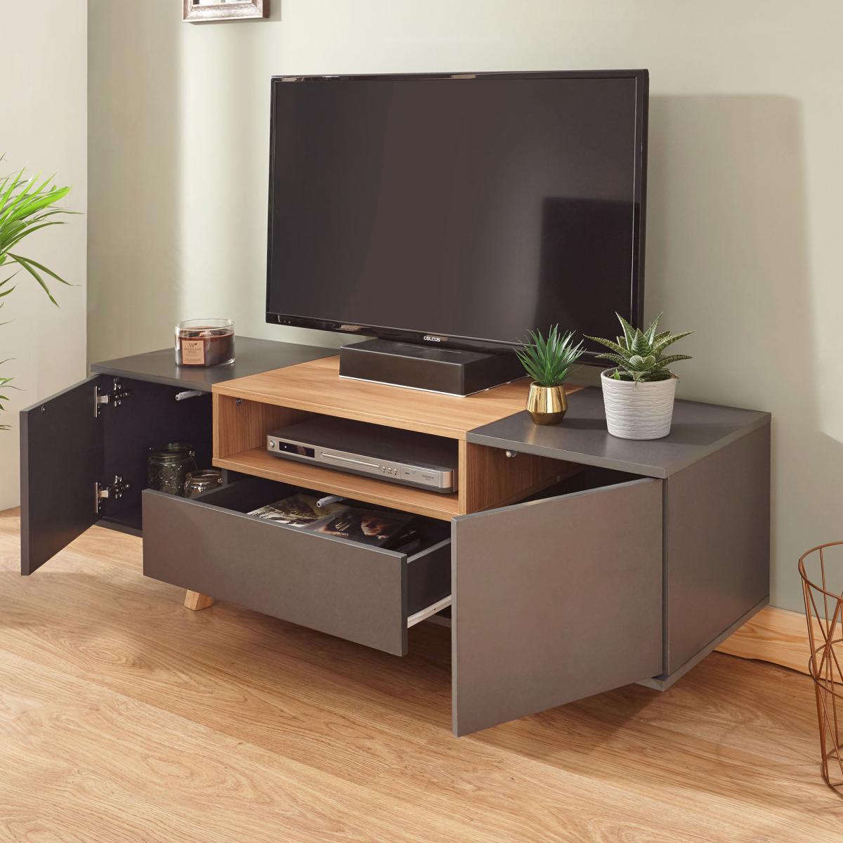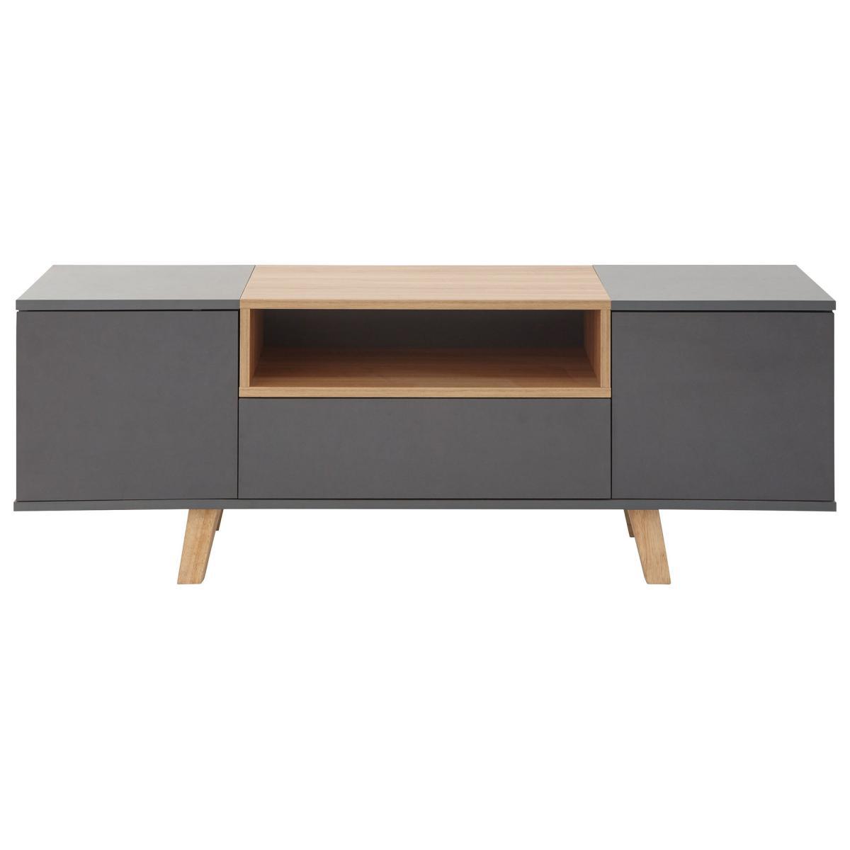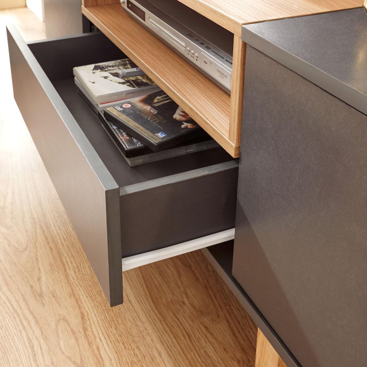 Crafted with a modern Scandi design, the Modena TV stand offers plenty of useful storage space and would be a great addition to any modern space. This self-assembly TV stand features pop-out push-pull door and drawer mechanisms so there are no handles to spoil the clean lines of this elegant piece of furniture, and is finished in a durable, scratch-resistant slate grey melamine with a contrasting oak effect centre. The TV stand is supported by four sturdy, retro Scandi-style legs and boasts two spacious cupboards, an open storage shelf and a single large drawer. Please note, unfortunately we cannot deliver this item to the Channel Islands.