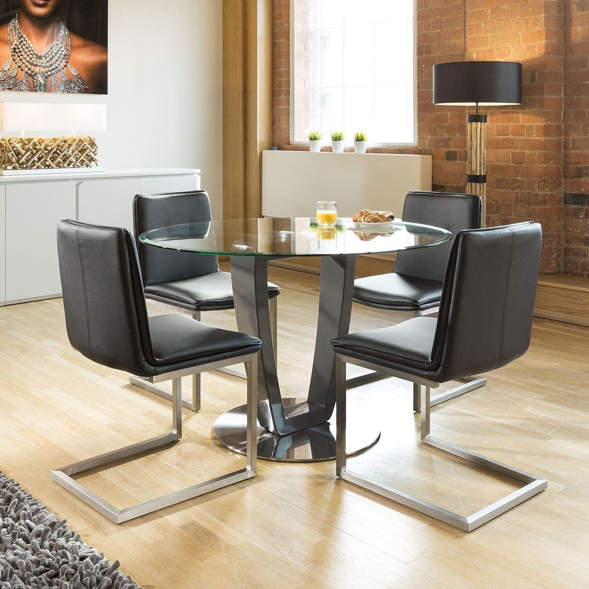 Modern 1.2m Round Clear Glass Dining Table Grey stem & steel Base 4396