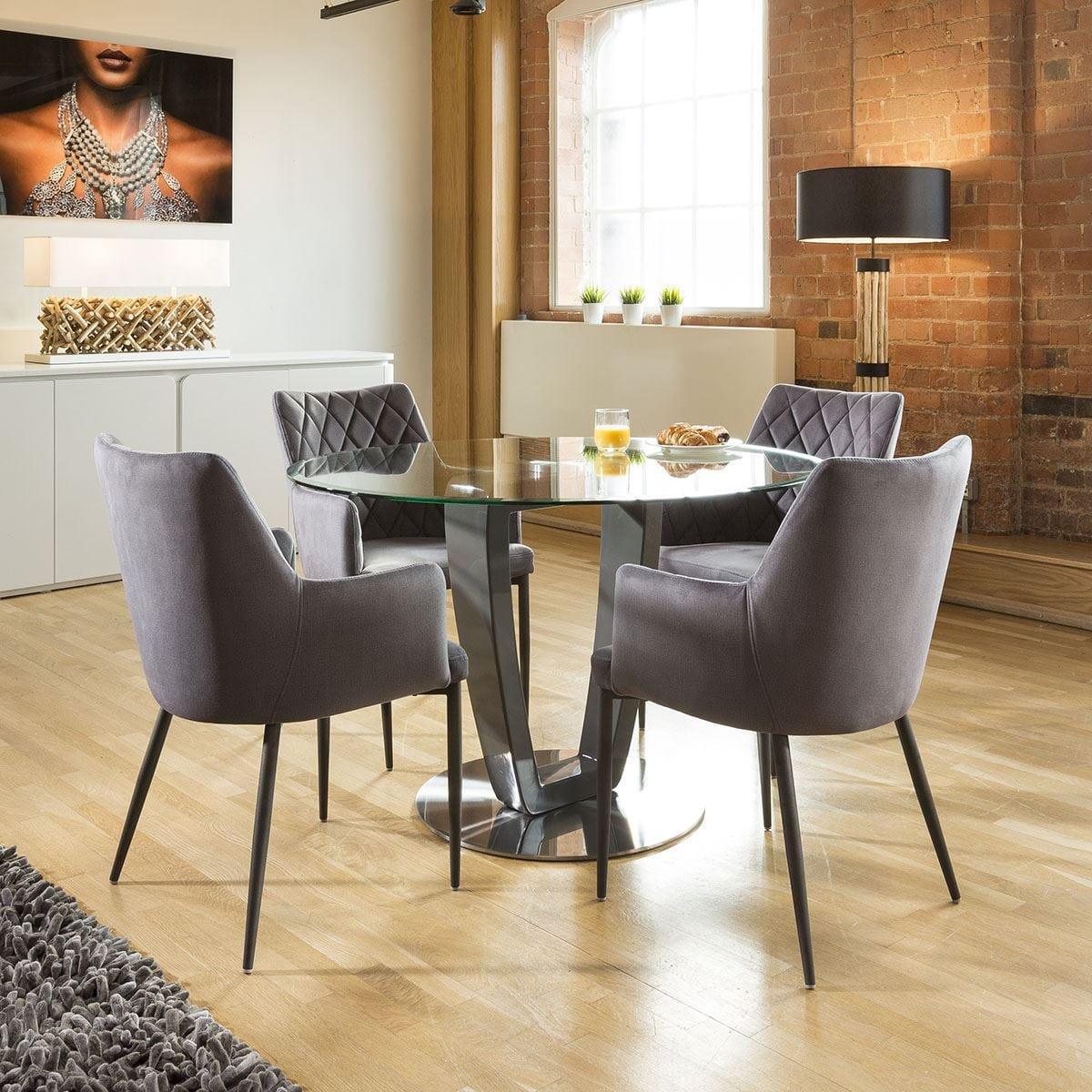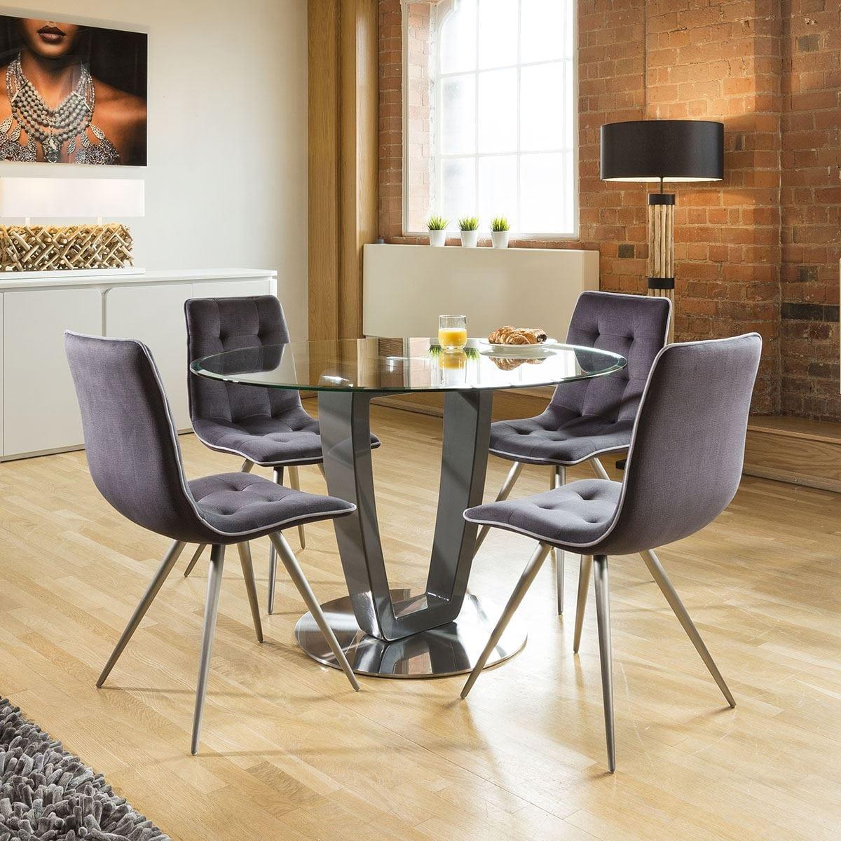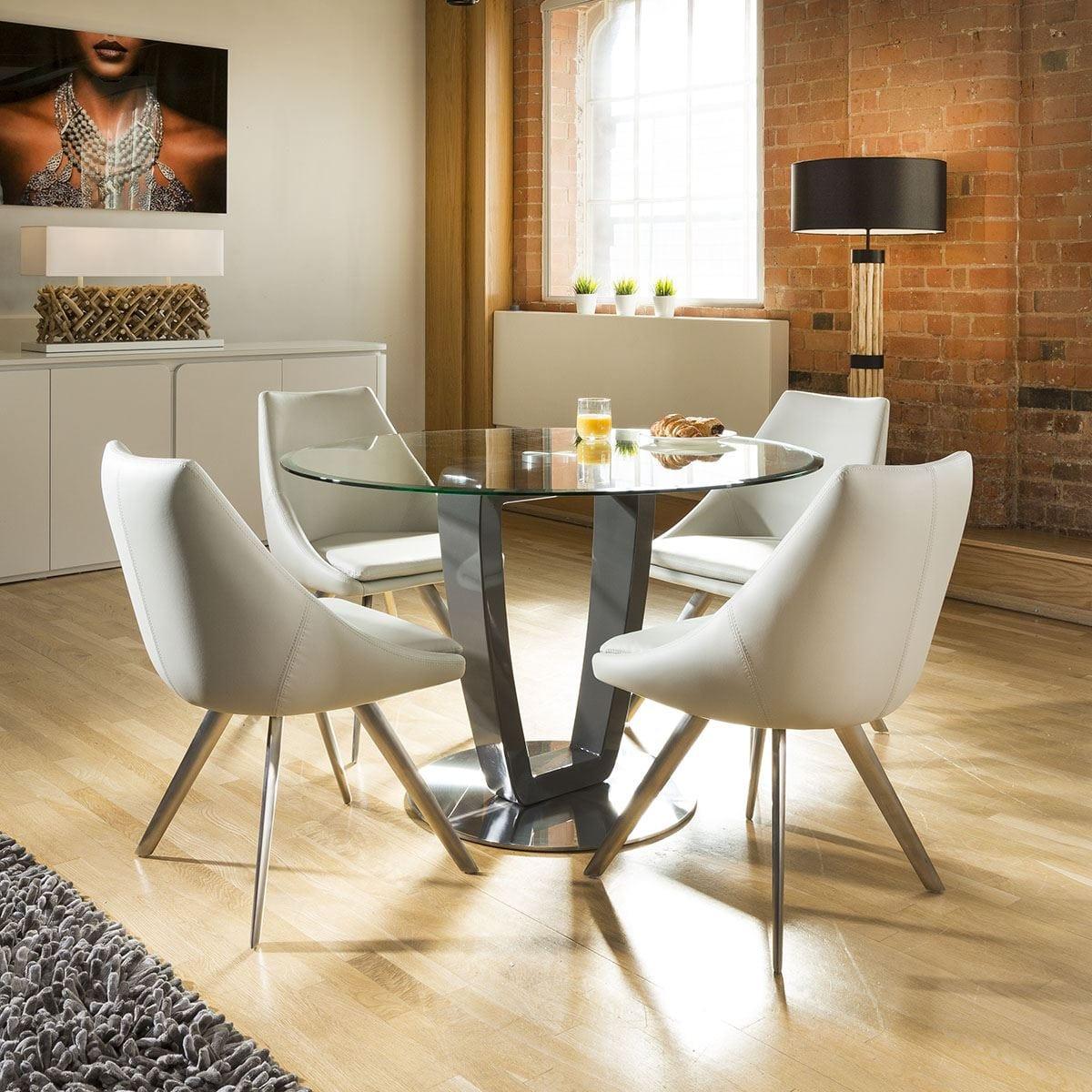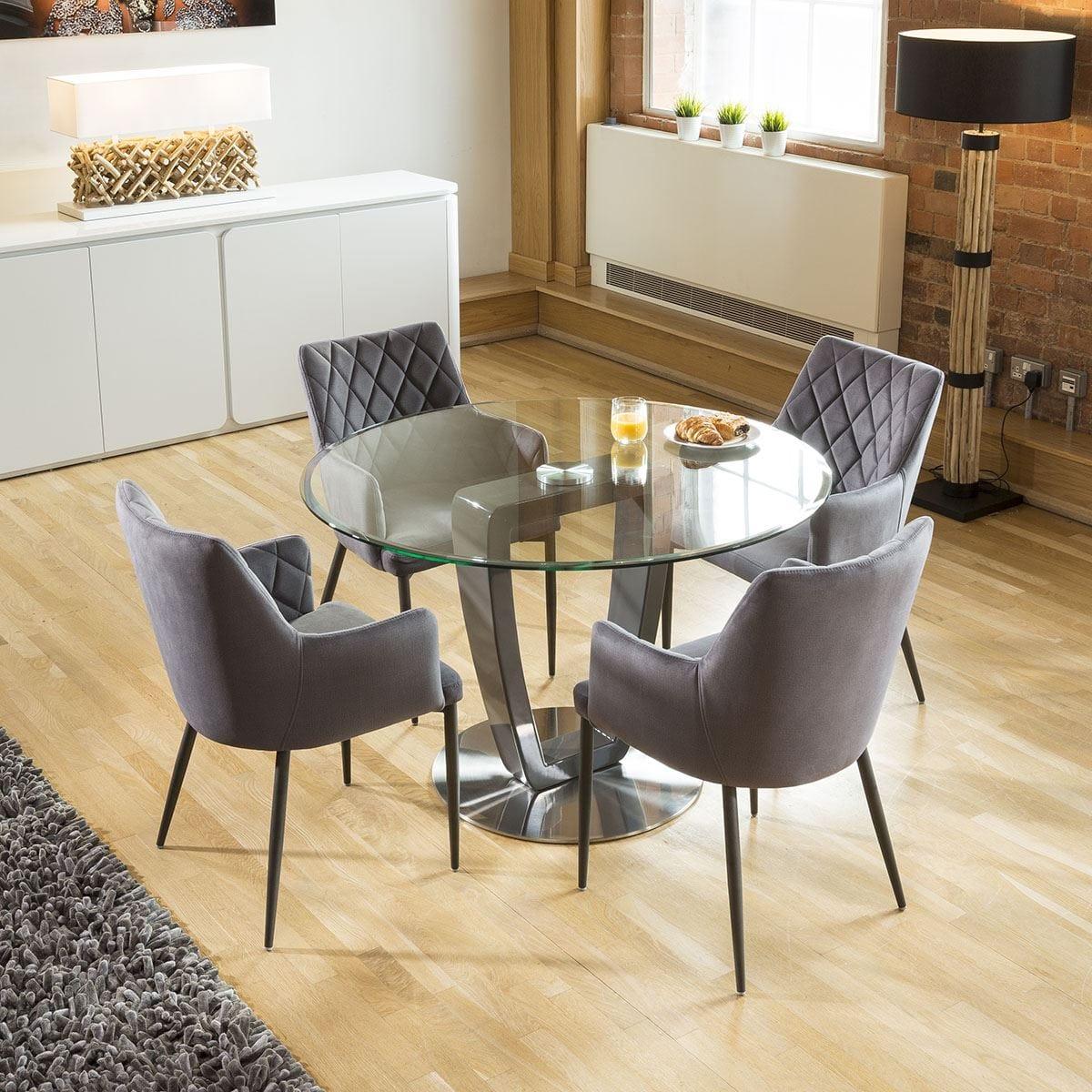 Rodin 135cm Round Glass Dining Table with 4 Grey Marco Chairs