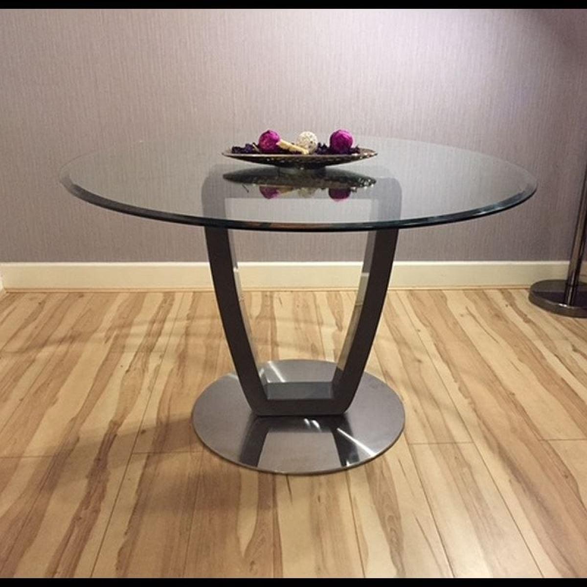 Ultra Stylish Modern High Quality 1200mm Round Glass topped table. This simple but beautiful design features a 10mm glass top with a 25mm bevel around the edge. With a Grey high gloss stem which gives both a great look and feel. Designed for heavy use and long life. The Stainless steel base is very heavy and gives the table remarkable stability. W120cm D120cm H75cm Modern Design Premium Quality Furniture
