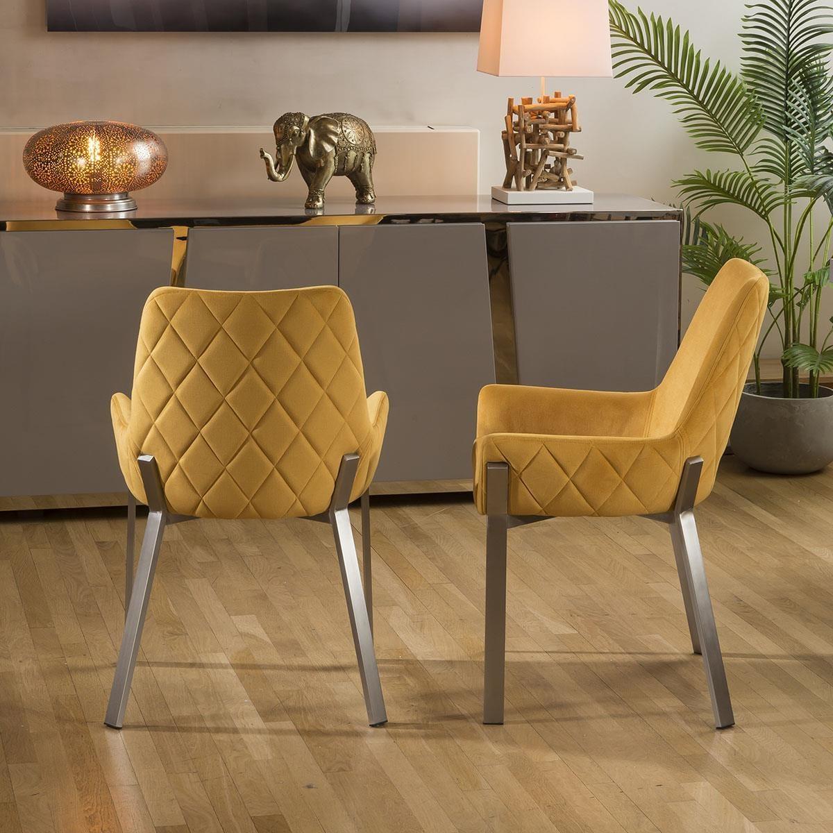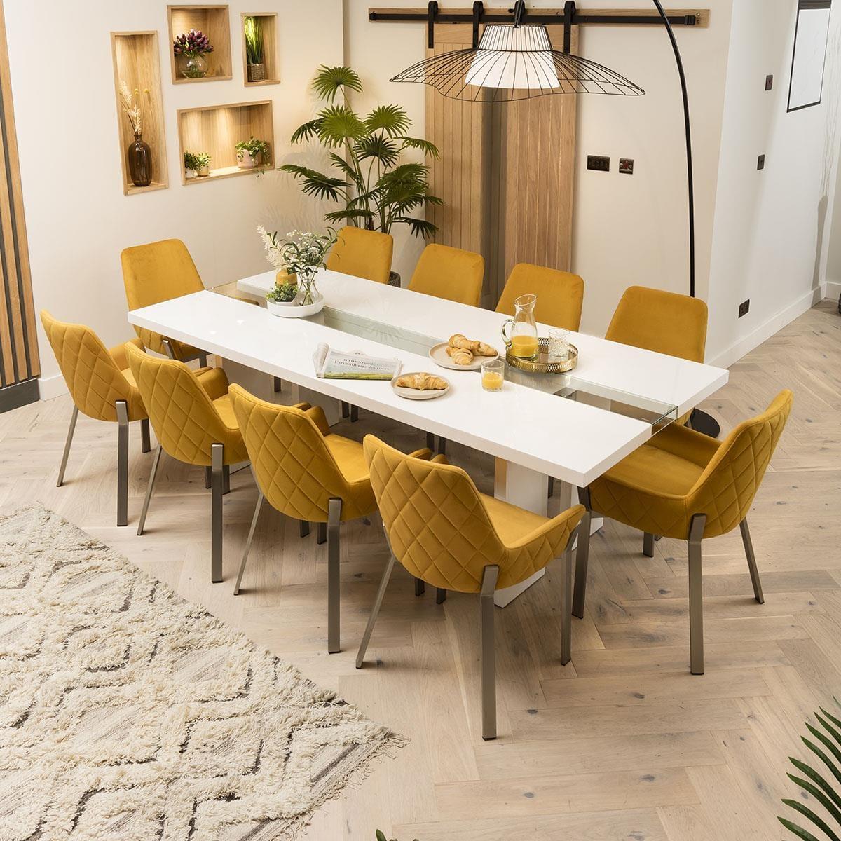 This white gloss ultra-modern chic dining table is Quatropi's rendition of a luxury river table featuring a stunning toughened glass 'river' centre. The 10 seater dining table is expertly crafted with a premium gloss white finish and decorated with glass in the middle, which makes it an incredibly modern eye-catcher, and stylish piece that is perfect for contemporary home decor. In keeping with the clean lines of the 240cm dining table, the straight legs tie in beautifully with the tabletop for a distinctly unique and contemporary look. Visually striking with their ultra-modern design and luxurious presence, the Quatropi Exclusive 1649 carver dining chairs demand designer credibility due to their shape, style and overall sleek appearance. Upholstered in a soft, fine mustard yellow fabric, featuring a stunning diamond quilted design. Complemented by the angled supportive arms, atop expertly crafted brushed metal legs. W240cm D110cm H76cm Also available as matching bar stools Set includes the dining table and 10 carver chairs