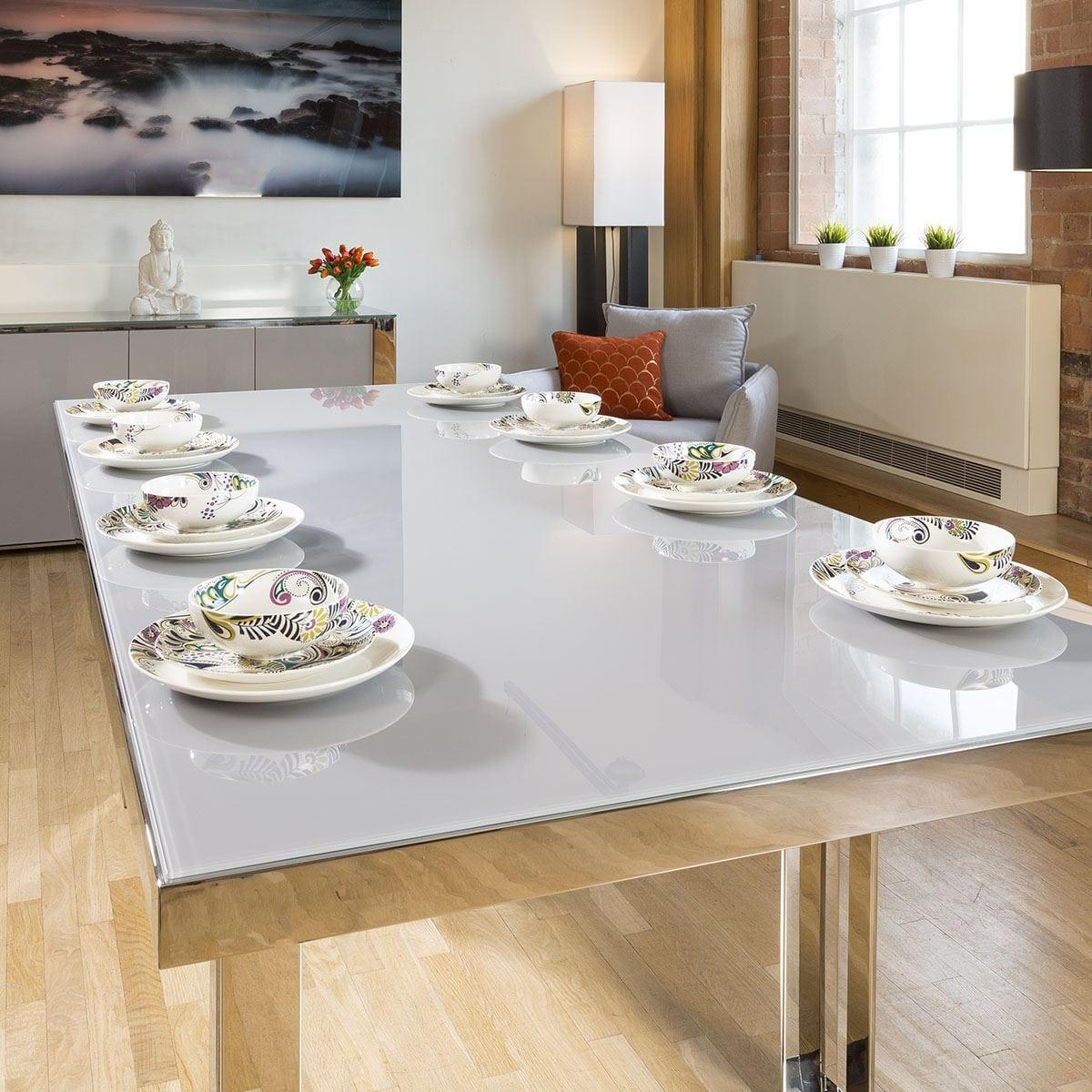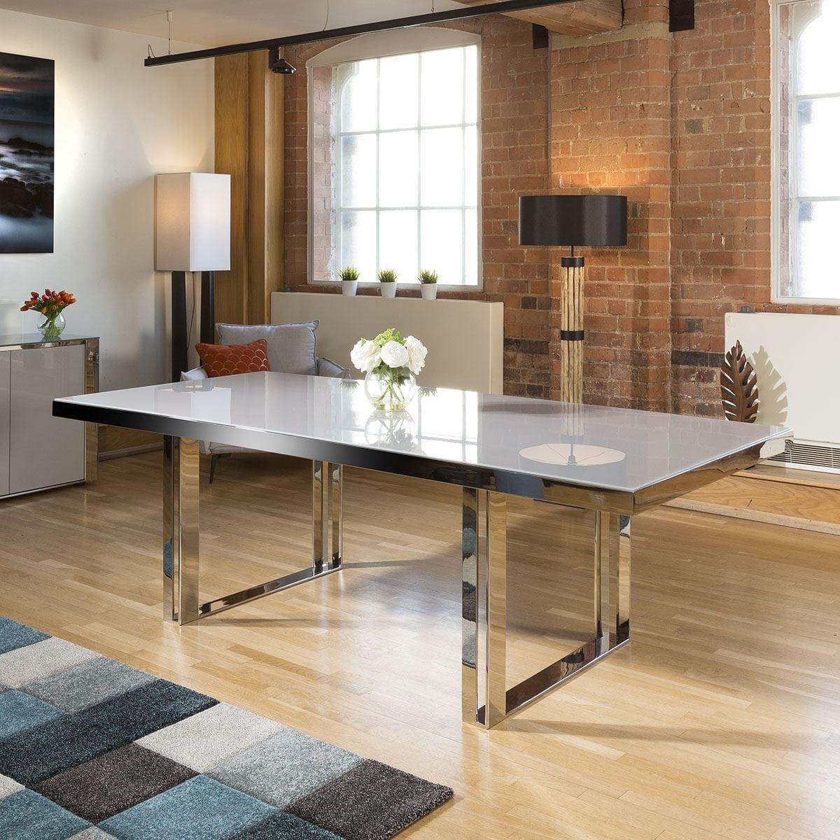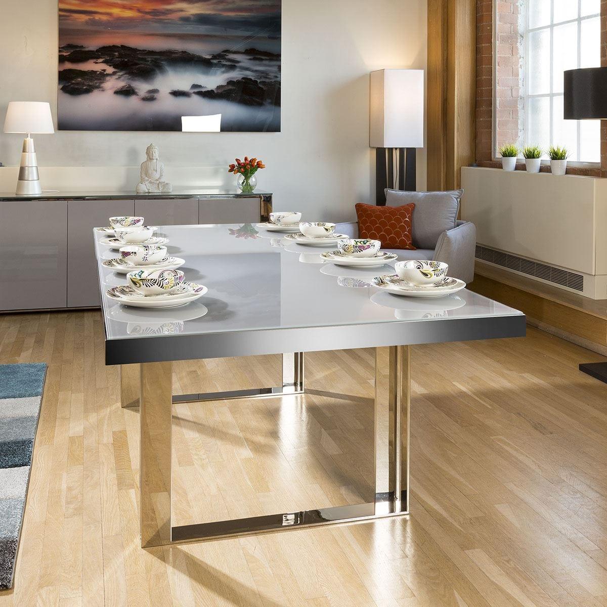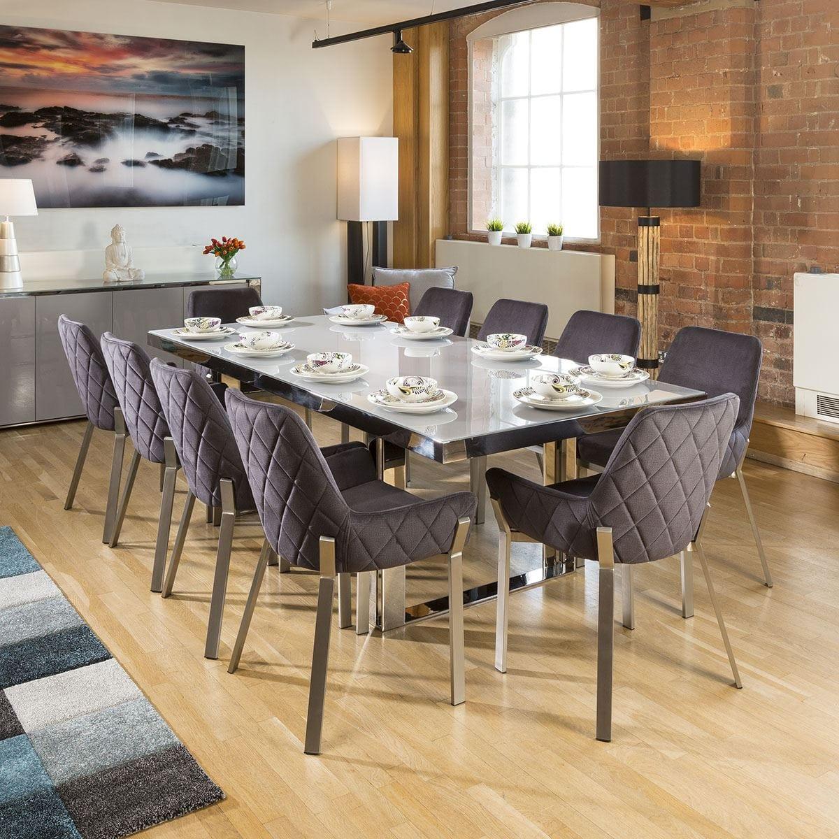 Introducing the Sophie range of designer furniture exclusive to Quatropi. This high end range exudes ultra modern style and features beautiful dove grey hi-gloss paint, matching grey glass and stainless steel frames and feet. The Sophie Dining tables all feature dove grey tempered glass tops and thick mirror finish stainless steel frames and legs. This rectangular table is 2.4 meters and perfect for up to 10 dining chairs Superb quality and strength from this stunning design. Felt feet ensure no damage to any type of flooring. The table is accompanied by 10 high end, well padded charcoal fabric carver chairs with quilted stitching to the backs and brushed stainless steel legs. W110cm D240cm H76cm Stainless Steel Detailing Ultra-Modern Carver Dining Chairs with Arms