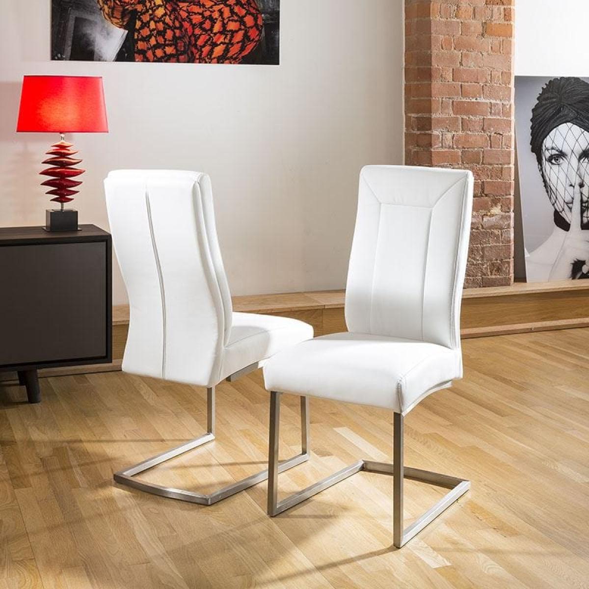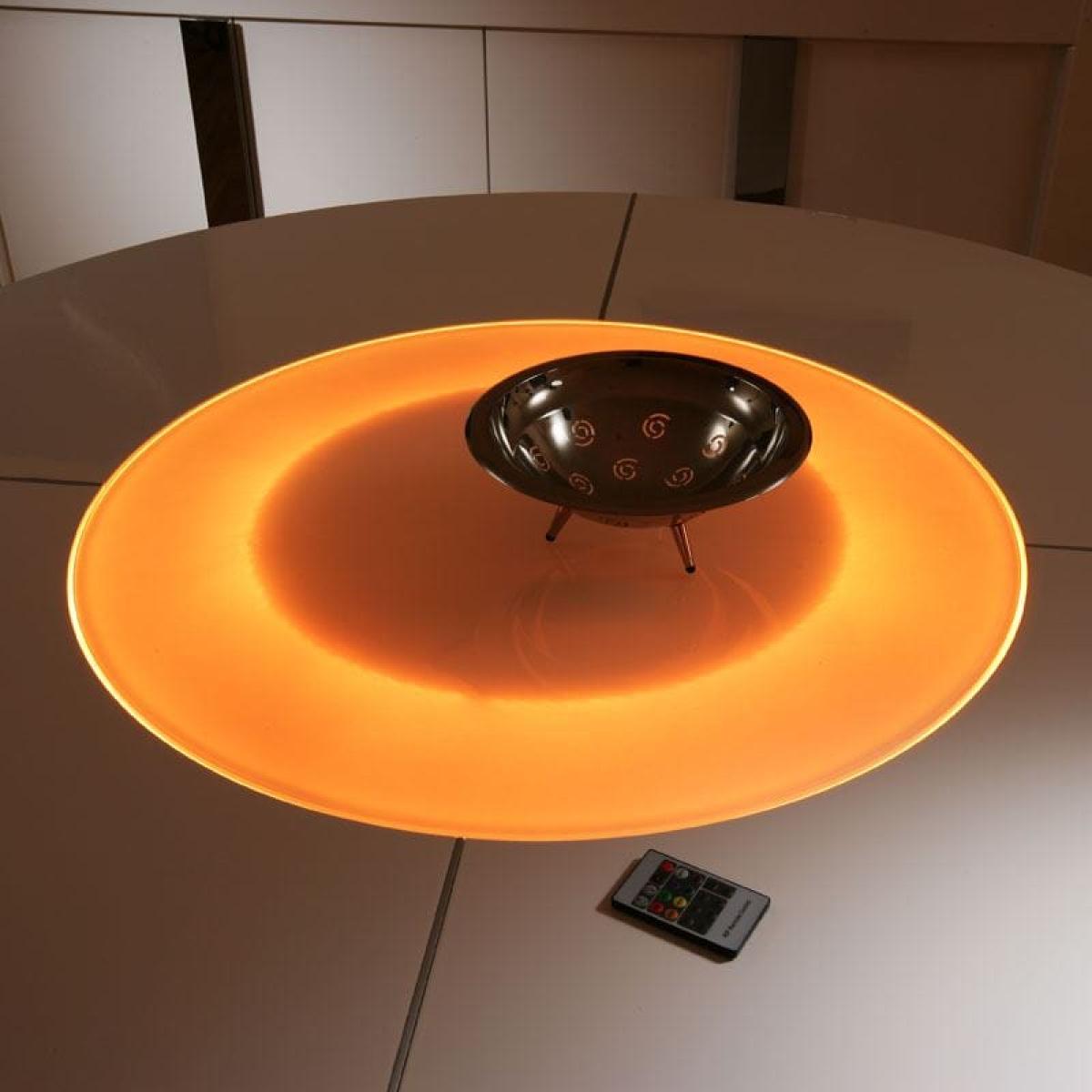 Stunning Quatropi Large Round Dining Table 140cm diameter. Finished in Gloss White with a White Glass with Lazy Susan and 6 White Cantilever Padded Dining Chairs Special features include aluminium trim and central, revolving glass section (lazy susan). Beautifully crafted and will comfortably seat up to 8. The cantilever chairs have a brushed steel frame with extra padding for comfort. Assembly and removal of packaging service available at an extra charge - please call for quote. Under the lazy susan there are LED lights which are operated via remote control. The colour and pattern of the lights can be controlled.