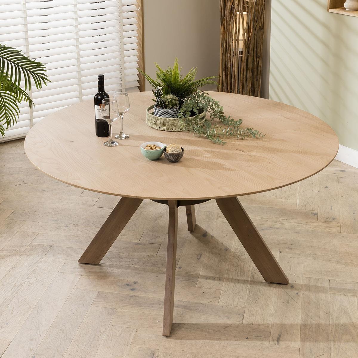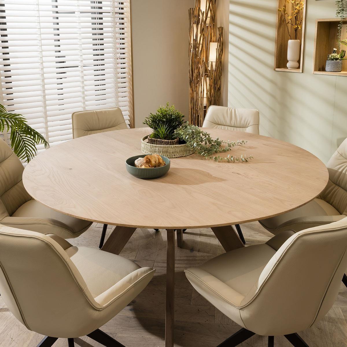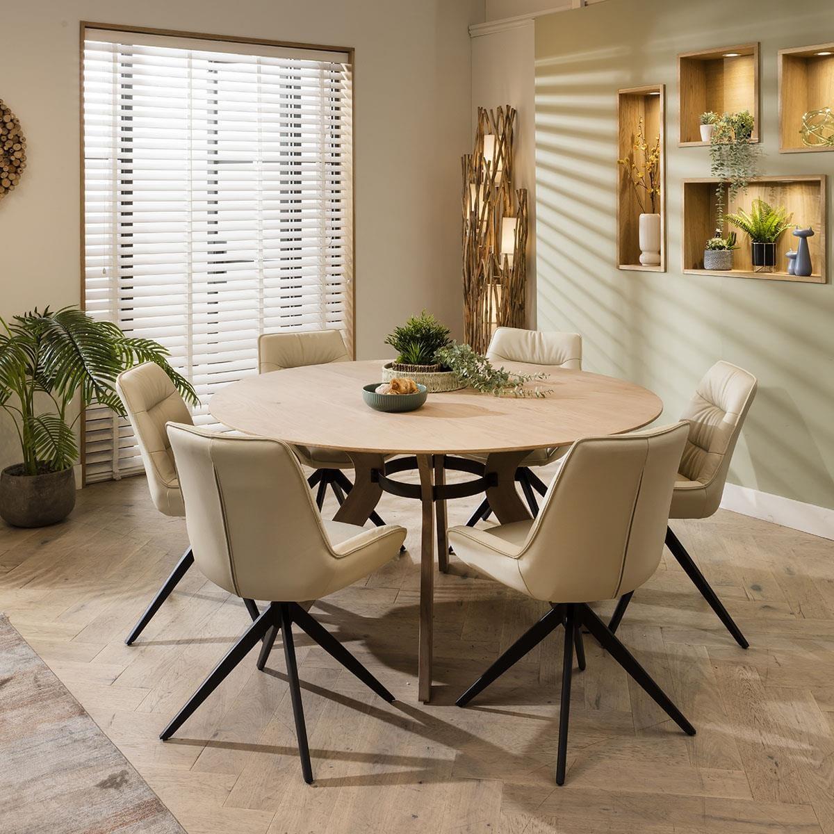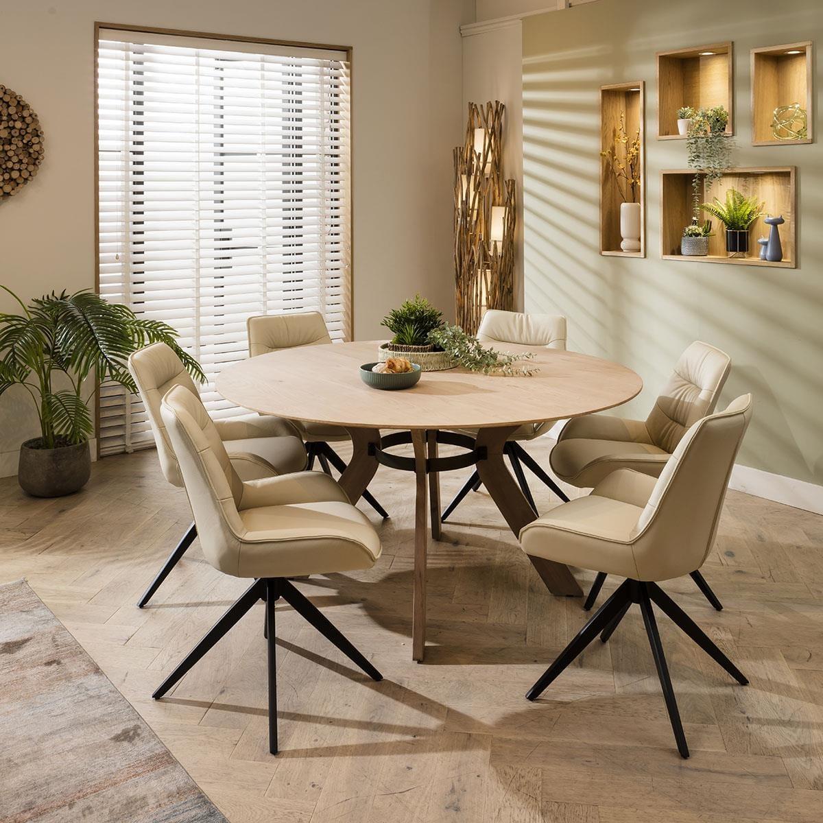 The rustic charm from the natural finish of the wooden dining table combined with buttery cream genuine leather dining chairs make this round dining set for 6 an elegant choice for any contemporary home. The chairs in the 6 seater dining set feature a swivel seat base for added convenience and an added modern touch. The Aquarius 150cm round dining table is a contemporary masterpiece. Crafted from high-quality ash wood, the wooden dining table for 6 boasts a natural finish that showcases rustic charm. With a reverse chamfer edge on the table top and metal detail on the pedestal base, it's not just a dining table; it's a work of art. Elegance with comfort is effortlessly blended with the 6 Nora leather dining chairs in this set, crafted with genuine cream leather. These cushioned dining room chairs feature a sleek 4-point swivel base that ensures stability and ease of movement, making the chairs a perfect addition to any contemporary kitchen or dining space. This 6 seater dining set combines modern Nora chairs with the stunning Aquarius table. Whether you love the Nora chairs and would like to purchase them individually, or you think the Aquarius table would complete your interior scheme better with another chair, you can easily mix and match our modern dining tables and chairs to curate something truly unique. Table Size W150cm D150cm H76cm Chair Size W58cm D64cm H85cm Dining Table And Chair Set For 6