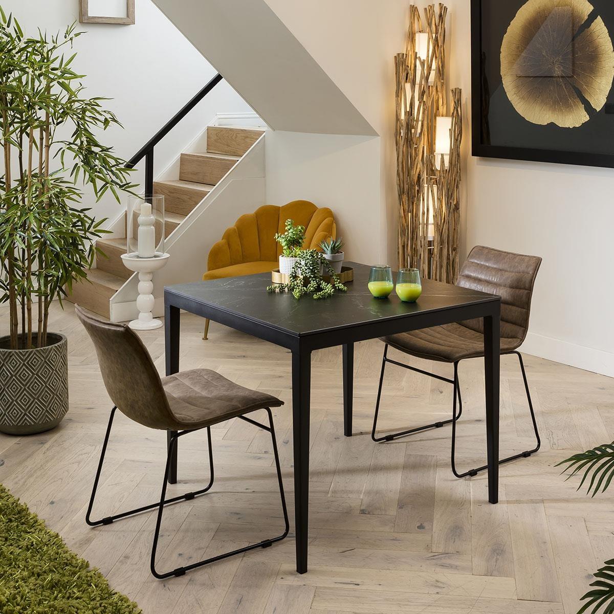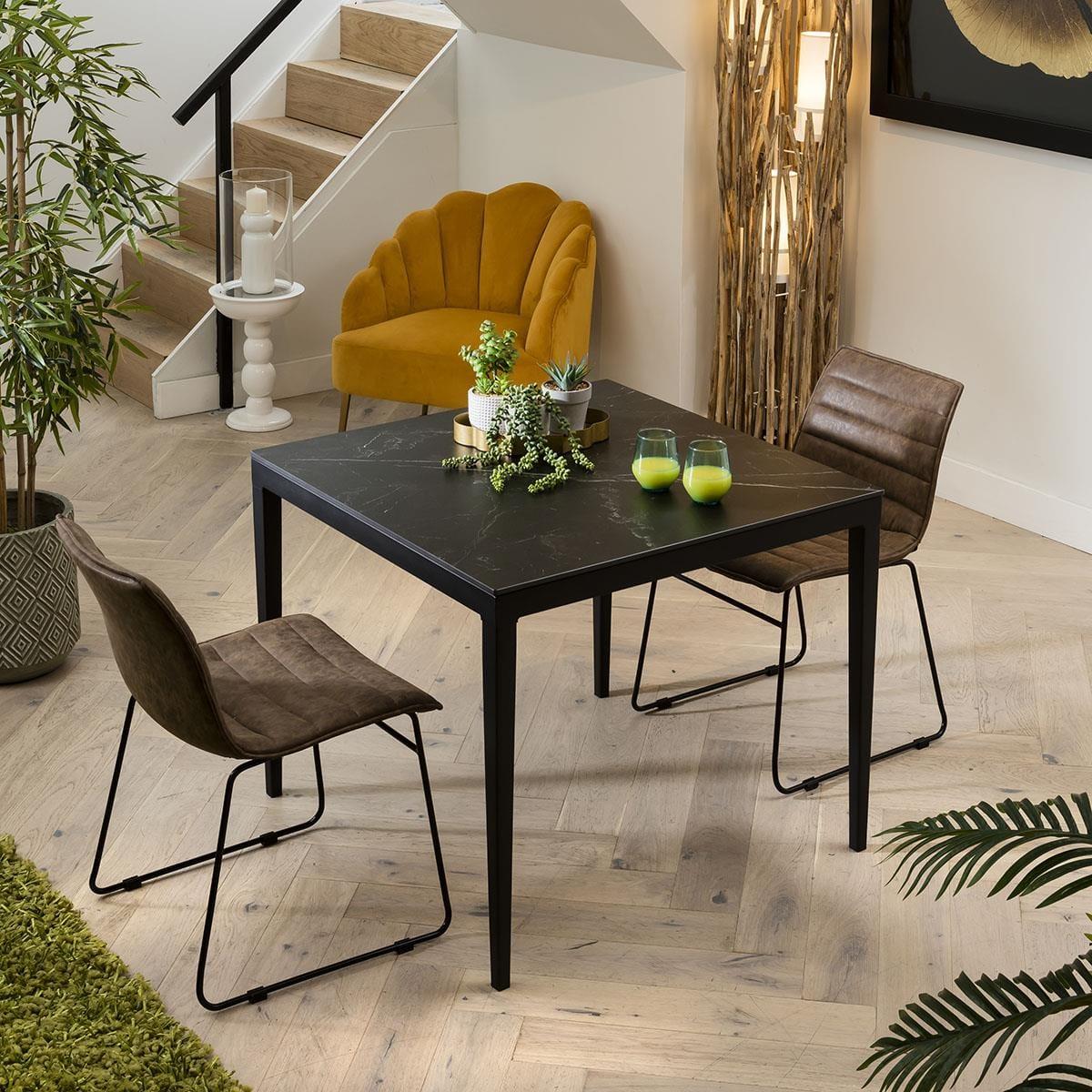The Lena Dining Set will add a stunning industrial look to any living and dining area. The table has a large table top made of high-quality ceramic with a Black Matte finish in Marble Effect. The Square Marble Dining Table in Black is simplistic in design with a contemporary style that will comfortably seat 4 guests. The imposing black powder-coated metal table legs in a robust industrial look are a skilful addition to the sturdy ceramic marble top dining table. This exclusive dining table is constructed from a premium metal frame, complemented by a striking Matte Black ceramic marble effect top, creating a very stylish, modern product. The Parker Dining Chairs have an industrial, retro design in a vintage tan brown faux leather finish with a black trapezoidal metal leg frame. Ribbed detailing provides an elegant, professional look and feel to the chairs with the comfortably padded seat offering maximum comfort and style, this padded chair beautifully accompanies the Brooklyn Dining Table. The easy clean premium PU leather material is finished in an antique tan, a stylish and classic style that will add some urban infused design to your dining space. Spread the cost our with interest-free finance options. Minimum spend applies.