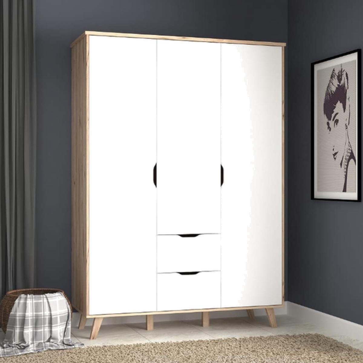 I really like this wardrobe because it offers a clean, contemporary look with its matte white finish and light oak accents, making it versatile for many interiors. It works particularly well in modern, Scandinavian, or minimalist schemes, where its neutral tones can help keep the space feeling bright and fresh. The combination of doors and drawers makes it practical for organising different clothing types, while the six-legged design adds a subtle touch of Scandinavian-inspired style. Practical styling tips include pairing it with light textiles and simple decor to maintain a streamlined aesthetic, or adding warm accessories like a textured rug or wooden accents to soften the look in more cosy interiors. Its understated elegance lends itself to a range of colour palettes, making it a flexible choice for both existing and new schemes.