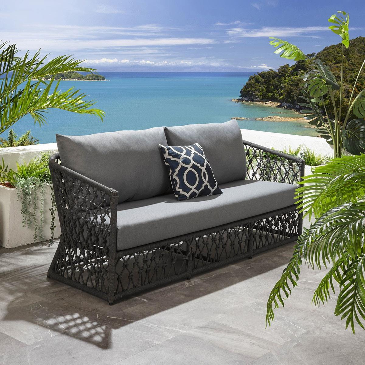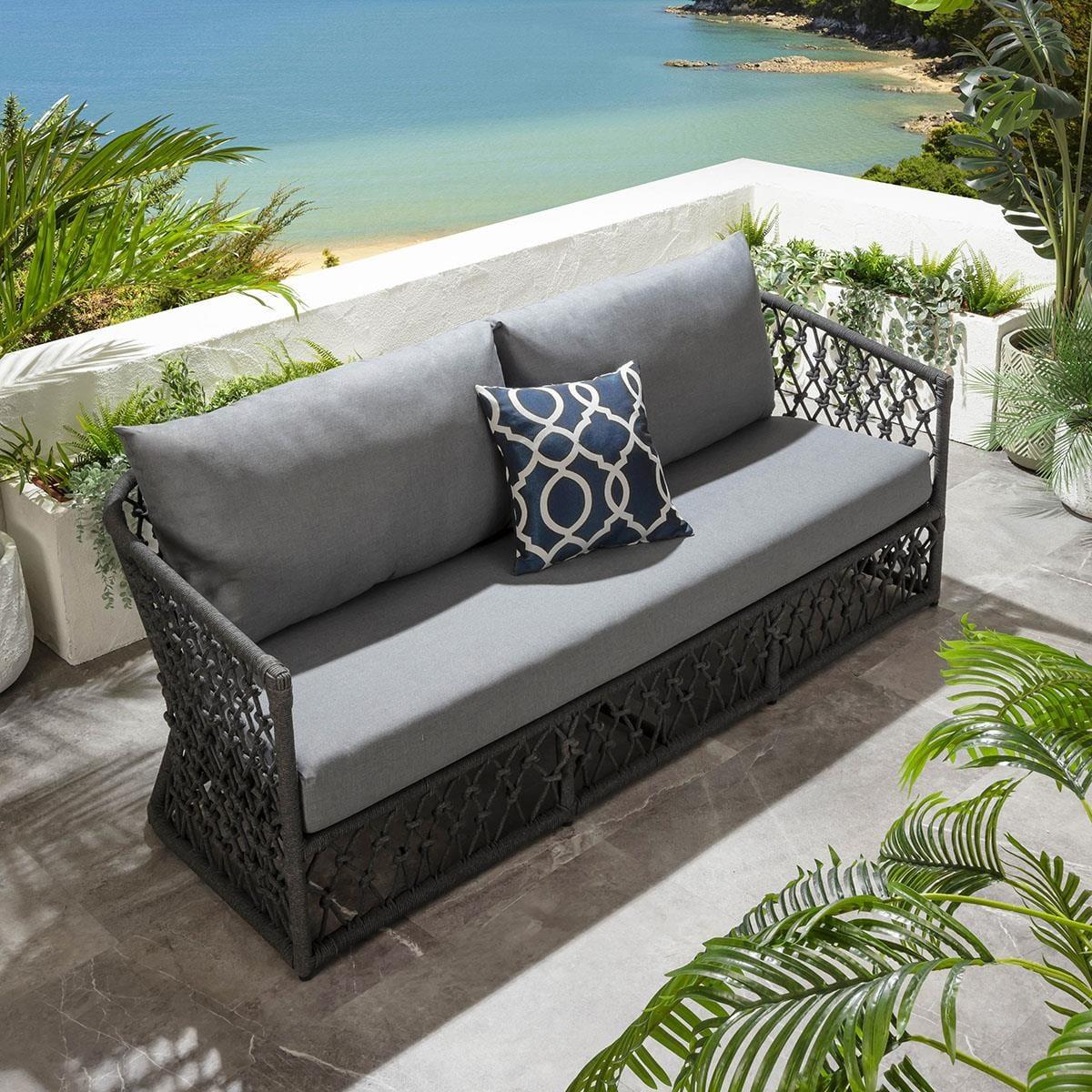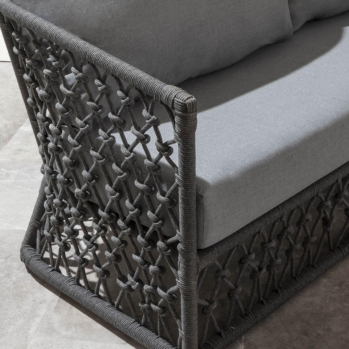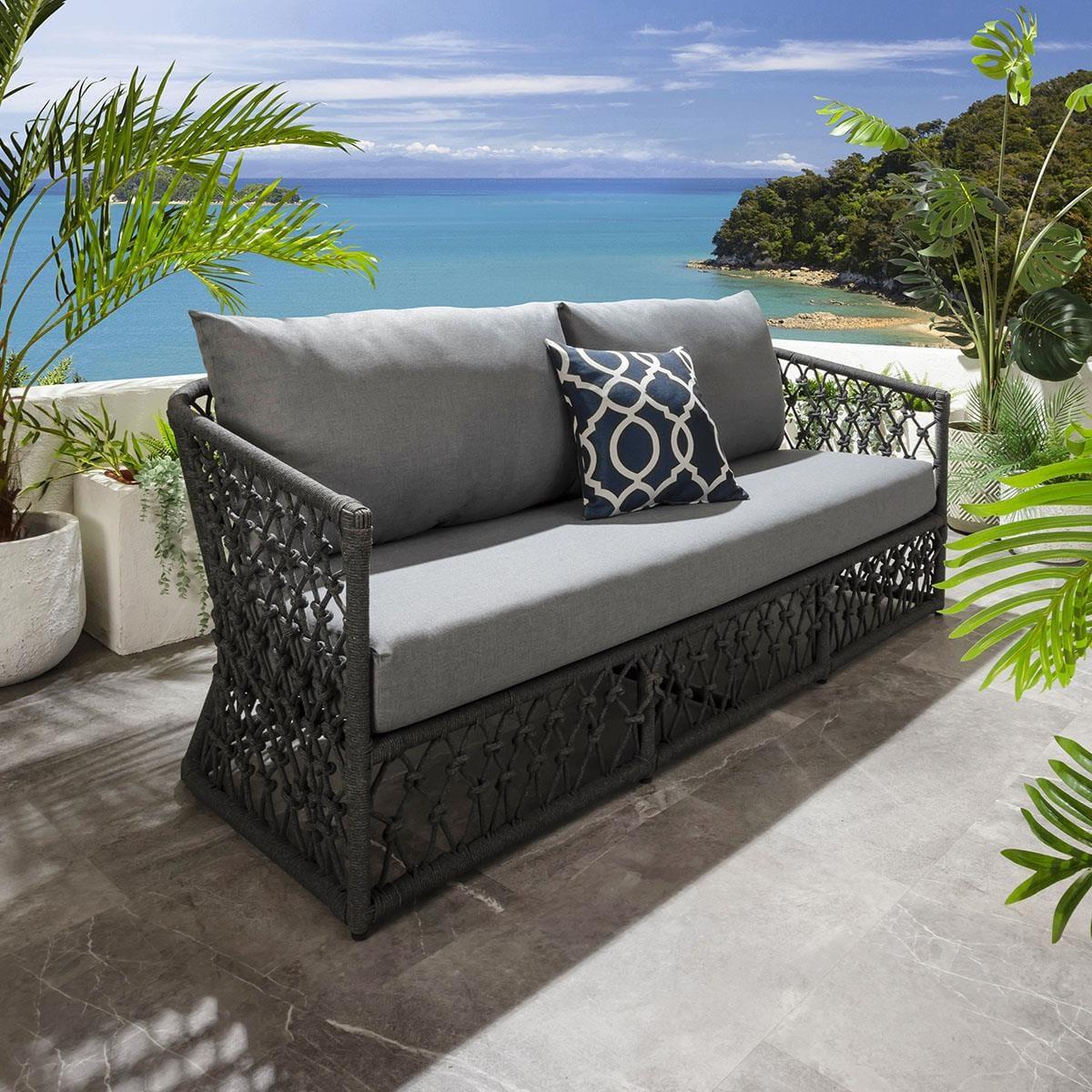The luxury outdoor sofa from the Amelia collection is a modern garden essential that seamlessly combines style and comfort. The 3-seater garden sofa boasts an artisanal design with a weather resistant aluminum frame enveloped in an exquisite grey knotted rope pattern, elevating your outdoor space with modern elegance. Crafted for both aesthetics and durability, the aluminium frame ensures long-lasting resilience against the elements. The intricate knotted rope design adds a touch of sophistication, creating a modern outdoor sofa that stands out in any setting. The high wrap-around backrest and arms provide optimal support, making it an ideal spot for relaxation and socialising. Indulge in supreme comfort with our thick, luxury base cushion, expertly upholstered in a chic grey fabric that complements the sofa's modern aesthetic. The back cushion, matching the grey fabric, completes the ensemble, offering a plush experience that invites you to unwind in style. No assembly is required, allowing you to enjoy your outdoor retreat without the hassle of setup. Expand your outdoor oasis by exploring other pieces in the Amelia garden furniture collection, where you can effortlessly pair this luxury outdoor sofa with matching garden furniture. Elevate your exterior design with a cohesive and contemporary ensemble that transforms your space into a modern haven. W198cm D75cm H77cm Seat Height 43cm Luxury 3 Seater Sofa