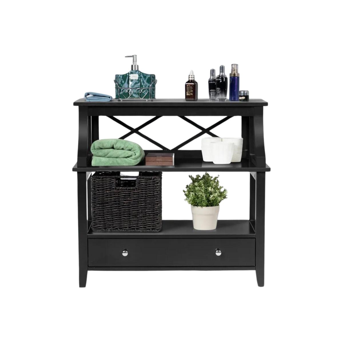 Ample Storage Equipped with a 2-tier shelf and a large capacity drawer, this table offers plenty of space to store and organize your belongings efficiently. Durable Construction Crafted from high-quality MDF material, the table ensures durability and longevity. Its solid frame and thickened panels provide excellent stability and sturdiness for reliable use. Stable Design Featuring an X-shaped support on the back, the table prevents items from falling and adds to its stability. Two silver handles on the drawer facilitate easy opening and closing. Each shelf can hold up to 15kg whilst each drawer can hold up to 10kg. Versatile Use This versatile piece can function as a console table, side table, end table, sofa table, or lamp table, adapting seamlessly to various settings in your home. Easy Assembly Includes illustrated instructions for straightforward assembly, making it quick and hassle-free to set up and start using.