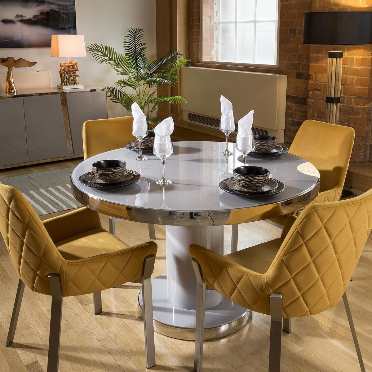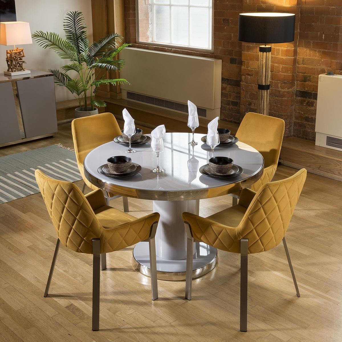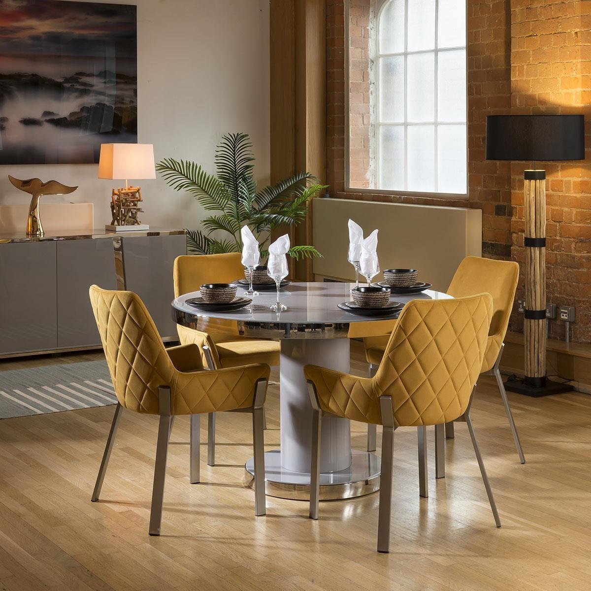 The table has a tempered glass top to match the finish of the table, with a polished stainless steel top edge and base line for a fully balanced aesthetic, finished in a high gloss grey top and base. This dining set includes 4 Carver Dining Chairs With Mustard Quilted Fabric and Brushed Stainless Steel Legs, adding that perfect splash of colour. Quatropi Luxury Dining Sets have been designed to stand out in the most contemporary dining rooms and kitchens in the UK. The dining table sets have been put together by our expert designers to provide a large combination of choice from farmhouse style to prestige, including small or large dining table sets, long narrow tables, round breakfast tables, farmhouse solid oak sets, extendable dining sets, corner sofa bench sets - only to mention a few! Our range of dining chairs that we match to the dining tables provides you with a large choice of sets - these are available in many colours and made in many styles, such as carver, faux leather, suede, velvet and many more. W120cm D120cm H76cm Stainless Steel Detailing Set includes dining table and 4 dining chairs