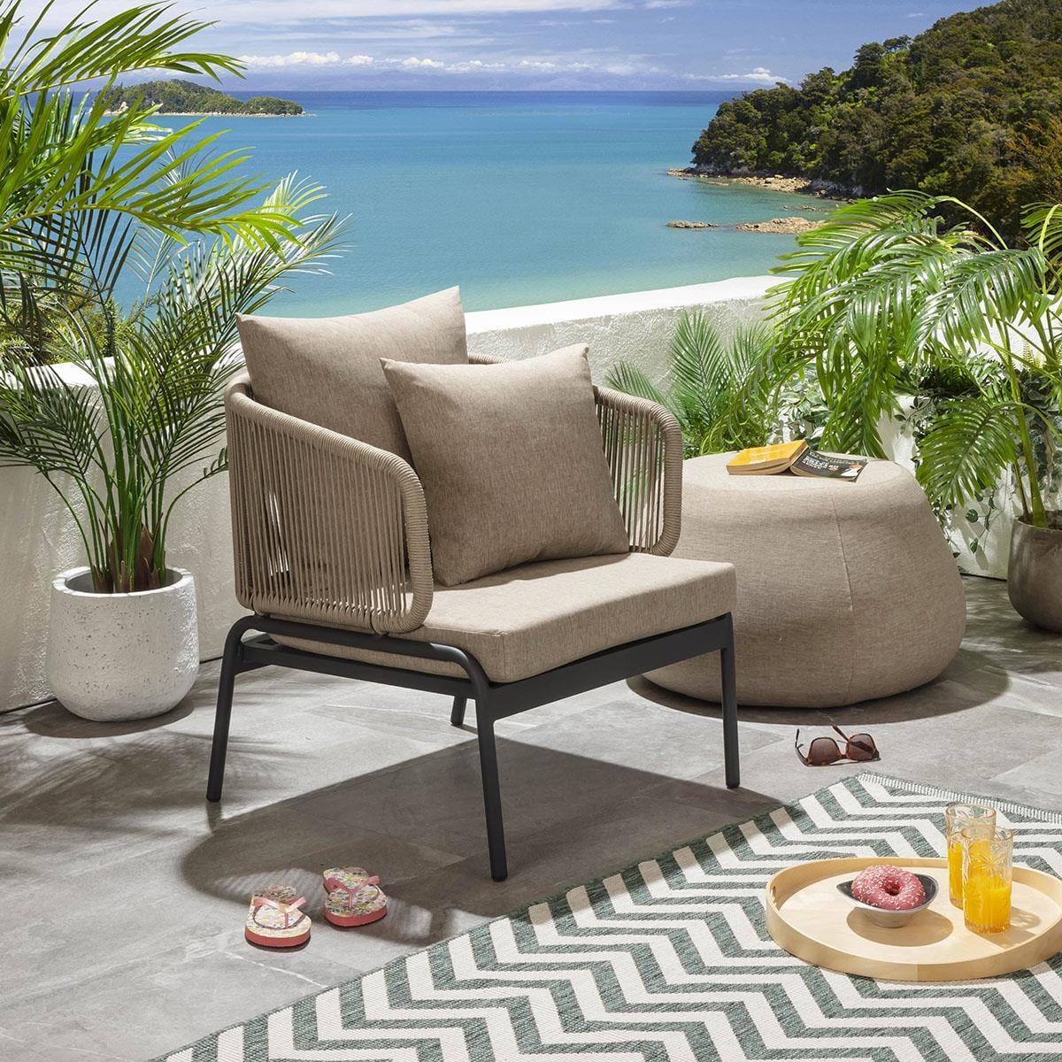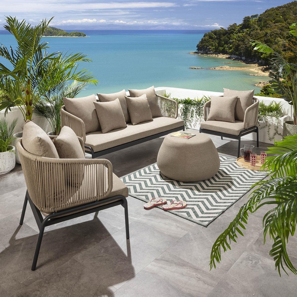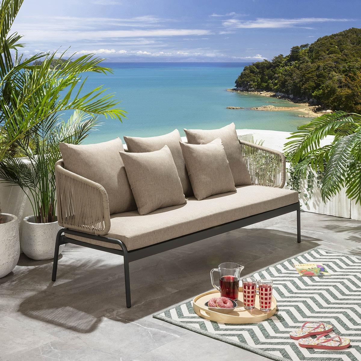 Crafted with a premium grey-painted aluminium frame, this outdoor sofa set features high backs, sides, and intricate beige rope weaves for support. Complete with cushions in durable outdoor fabric, this metal garden sofa set includes 1 sofa and 2 armchairs, accompanied by weather covers for all pieces. The Jasmine outdoor sofa stands out with its premium grey-painted aluminium frame, boasting a high back and sides adorned with a beige rope weave for added support. The sofa's cushions, covered in luxury beige durable outdoor fabric, offer both comfort and style, making it an ideal addition to any outdoor space. The outdoor cushions are crafted with the utmost attention to comfort and durability. Made with luxury foam, they provide plush support for hours of relaxation. Upholstered in a sleek beige outdoor fabric, the cushions seamlessly complement the modern design of the sofa set. Designed for modern outdoor living, our aluminium sofa set comes complete with weather covers for protection when not in use, ensuring longevity and easy maintenance. Sofa Size W180cm D72cm H75cm Seat Height 39cm Chair Size W69cm D72cm H75cm Seat Height 39cm Set includes a sofa and 2 armchairs