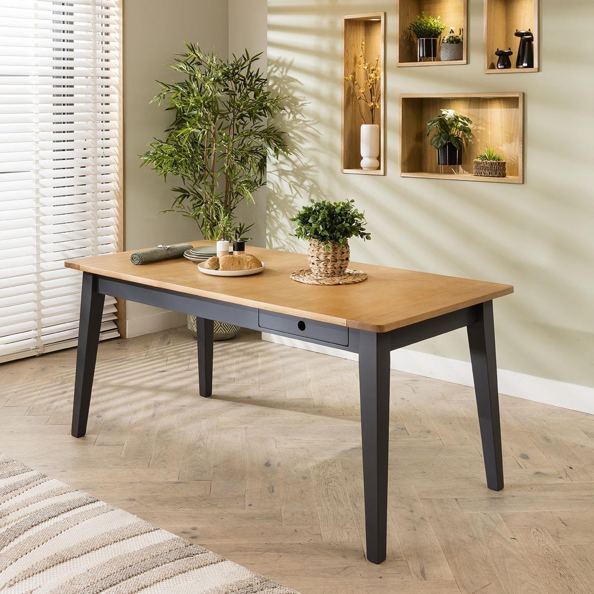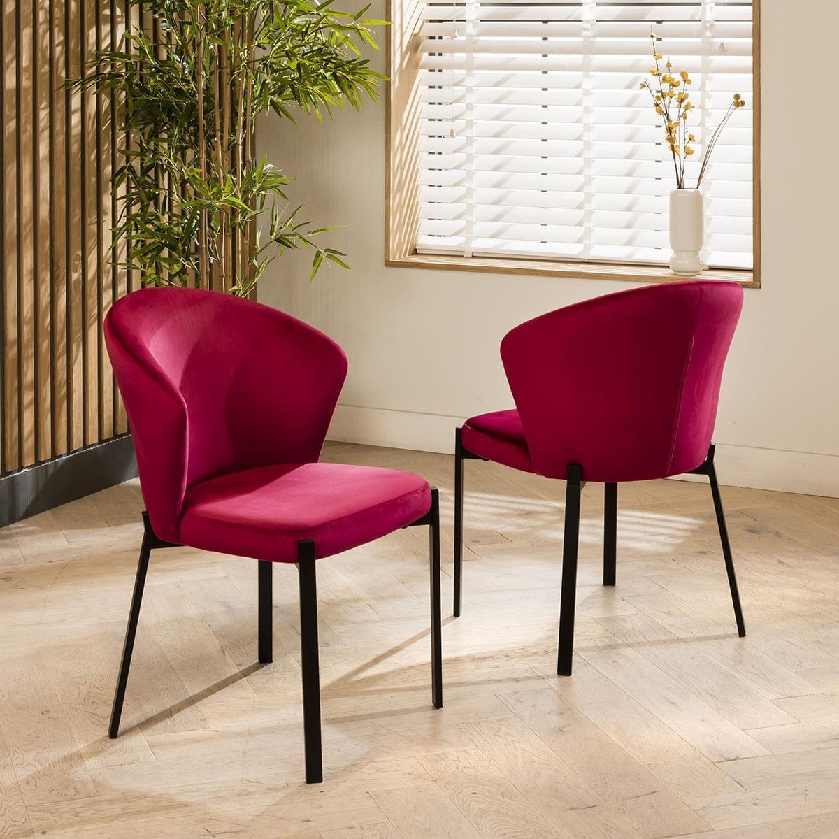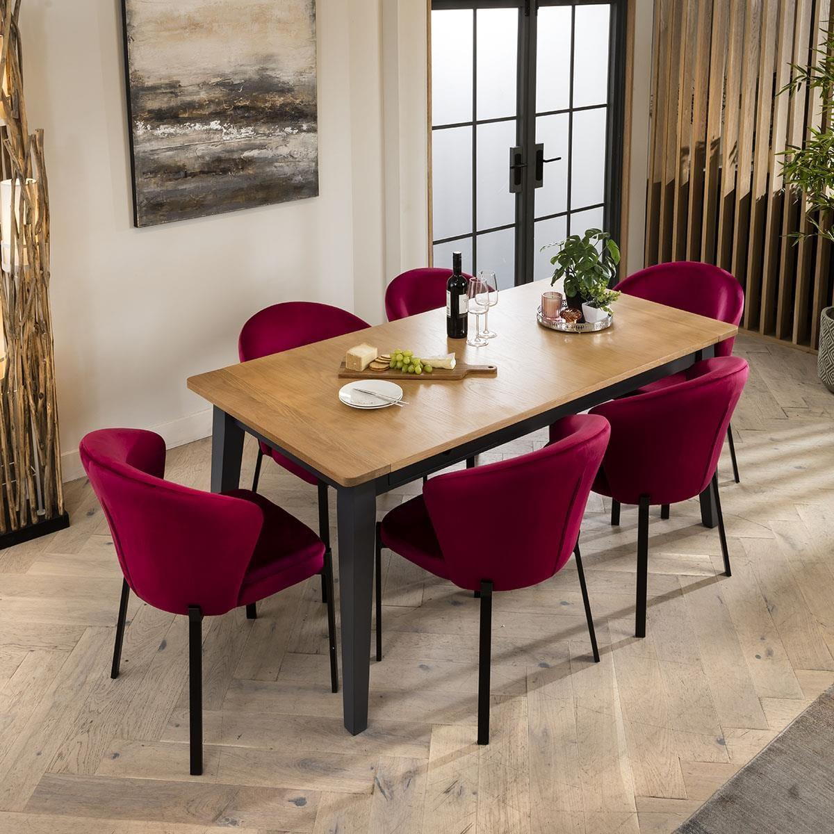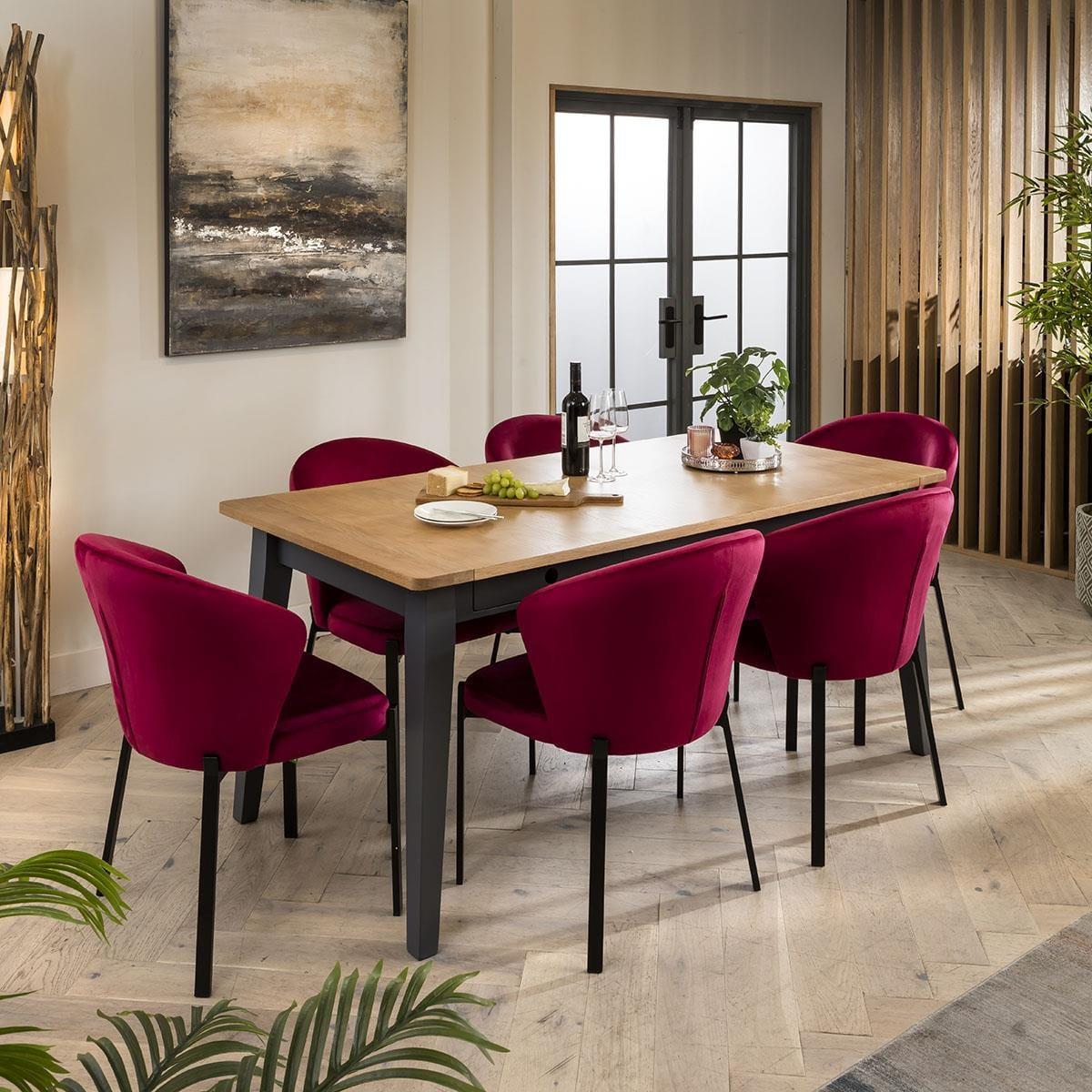 Experience the perfect fusion of timeless elegance and modern design with our 6 seater dining set, seamlessly blending traditional practicality with chic style and premium quality. Our oak extending dining table, paired with six Zoe dining chairs in berry red velvet fabric, promises to transform your dining space. Including a wooden table marrying simplicity and sophistication - it's the Ralph dining table. Its sleek, grey frame and legs accentuate the oak tabletop, with built-in drawers for storing dining essentials. Effortlessly extendable, this modern dining table extends from 175cm to 215cm, comfortably accommodating 6 people. For a harmonious blend of elegance and comfort that will elevate your dining experience. Crafted with the utmost attention to detail, these Zoe dining chairs boast luxurious berry red velvet upholstery with sleek black metal legs. This set of 6 red velvet dining chairs have cushioned seats that offer unmatched comfort. This 6 seater dining set combines modern Zoe chairs with the stunning Ralph table. Whether you love the Zoe chairs and would like to purchase them individually, or you think the Ralph table would complete your interior scheme better with another chair, you can easily mix and match our modern dining tables and chairs to curate something truly unique. Table Size W175-215cm D87cm H77cm Chair Size W57cm D62cm H83cm Dining Table And Chair Set For 6
