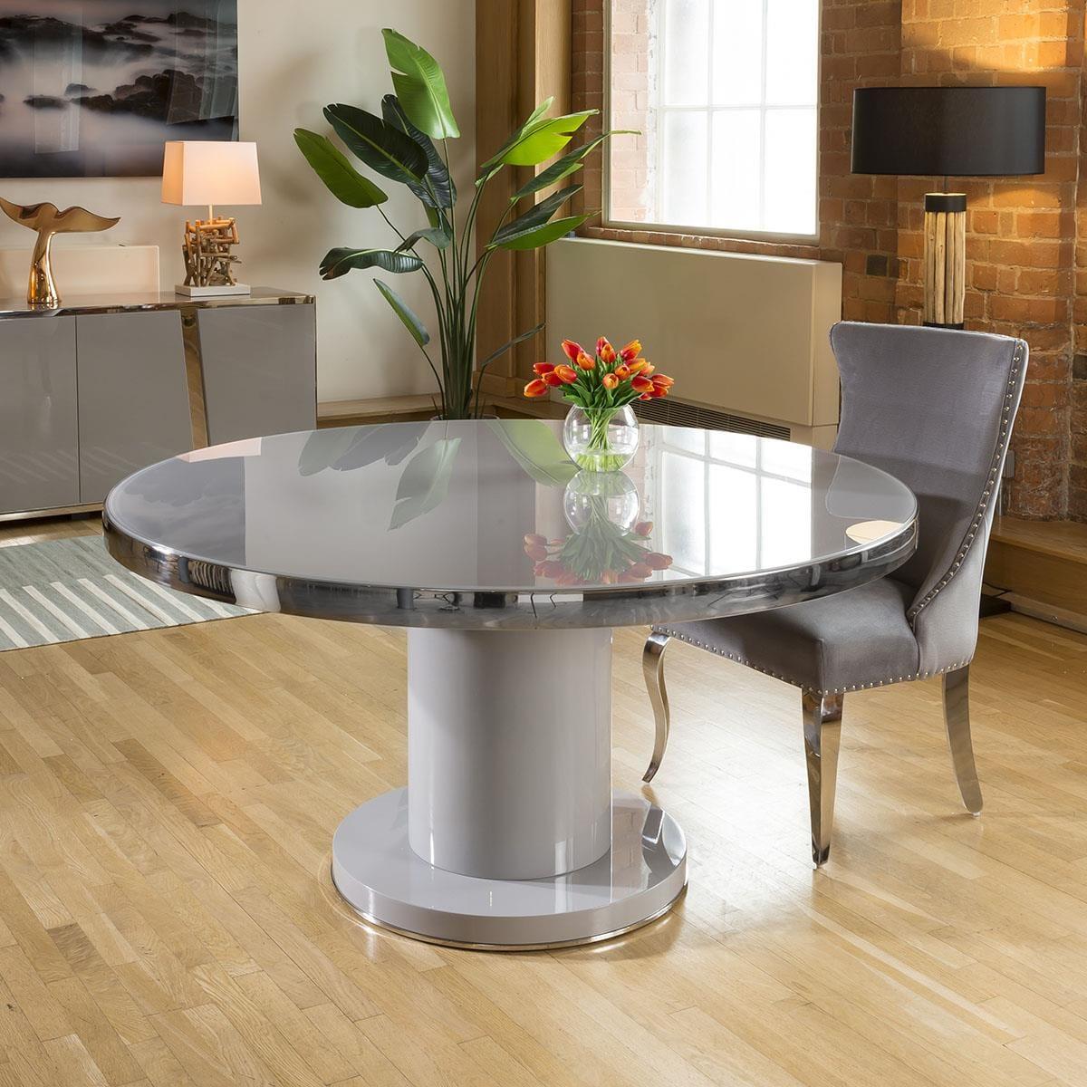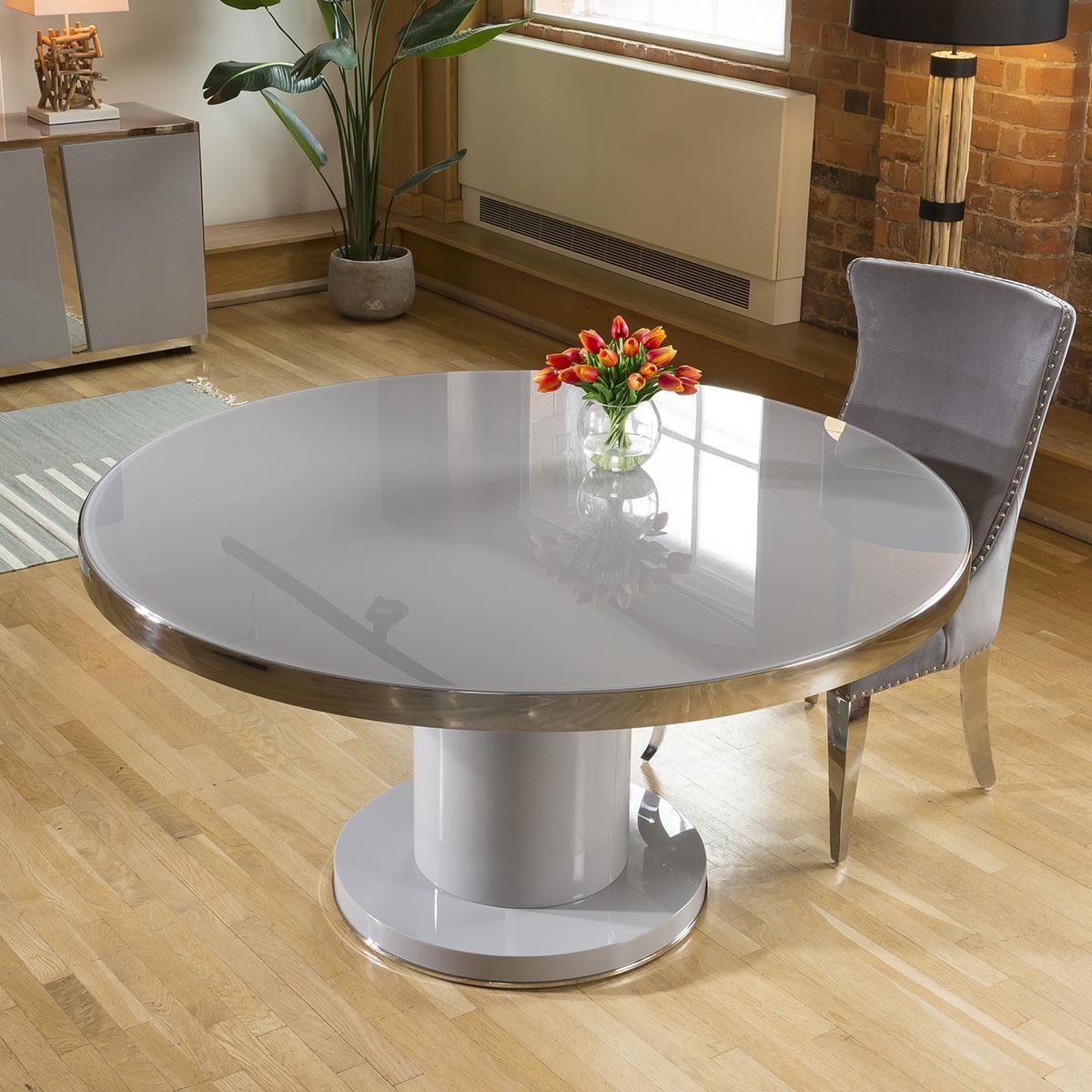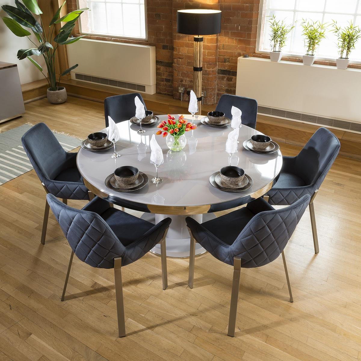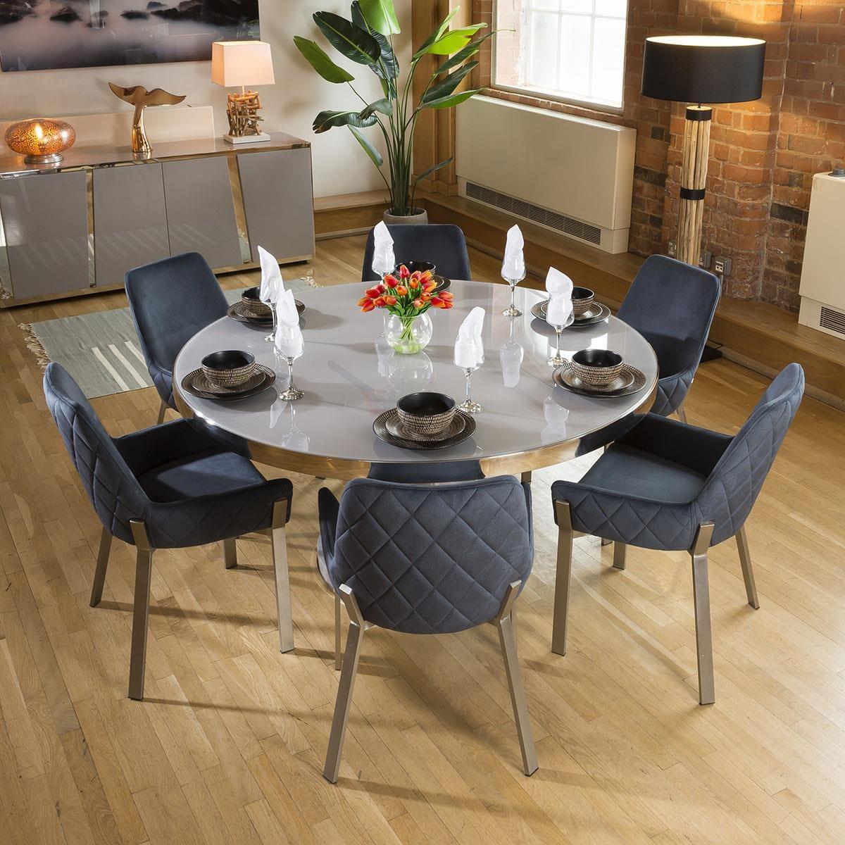 The table has a tempered glass top to match the finish of the table, with a polished stainless steel top edge and base line for a fully balanced aesthetic, finished in a high gloss grey top and base. This dining set includes 6 Carver Dining Chairs With Blue Quilted Fabric and Brushed Stainless Steel Legs, adding that perfect splash of colour. Quatropi Luxury Dining Sets have been designed to stand out in the most contemporary dining rooms and kitchens in the UK. The dining table sets have been put together by our expert designers to provide a large combination of choice from farmhouse style to prestige, including small or large dining table sets, long narrow tables, round breakfast tables, farmhouse solid oak sets, extendable dining sets, corner sofa bench sets - only to mention a few! Our range of dining chairs that we match to the dining tables provides you with a large choice of sets - these are available in many colours and made in many styles, such as carver, faux leather, suede, velvet and many more. W150cm D150cm H76cm Tempered glass top Set includes dining table and 6 dining chairs