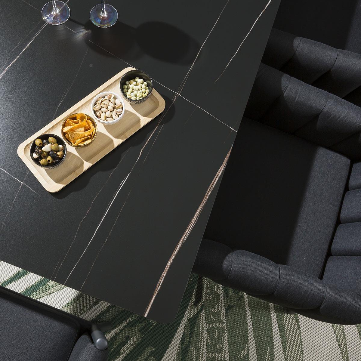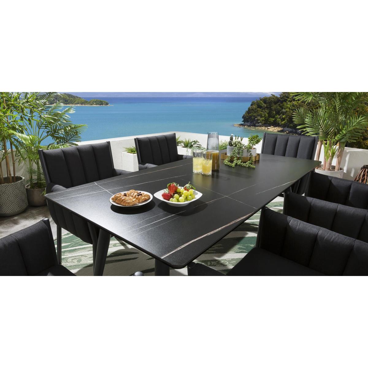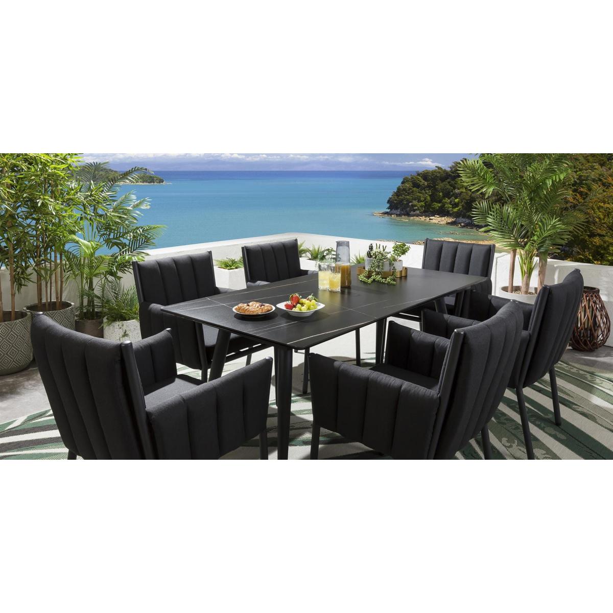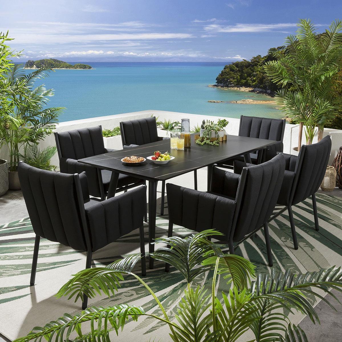 The Quatropi Luxury Outdoor Portals Range Dining Set is the perfect way to add style and sophistication to any outdoor living space. This set includes a 180cm x 90cm table with a black ceramic top and grey aluminum frame, plus 6 premium aluminum frame dining chairs with thick soft charcoal cushions, offering a modern and stylish design. The set is also designed with a 5 year warranty and weather cover, making it a durable and reliable choice for any outdoor area. With its luxurious look and feel, this dining set is the perfect way to enjoy al fresco dining in style. Spread the cost our with interest-free finance options. Minimum spend applies. W180cm D90cm H73cm 5 Year Warranty 6 Luxury Chairs