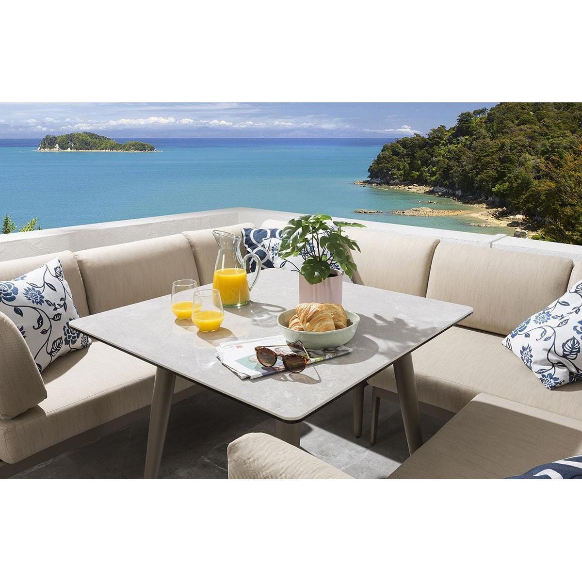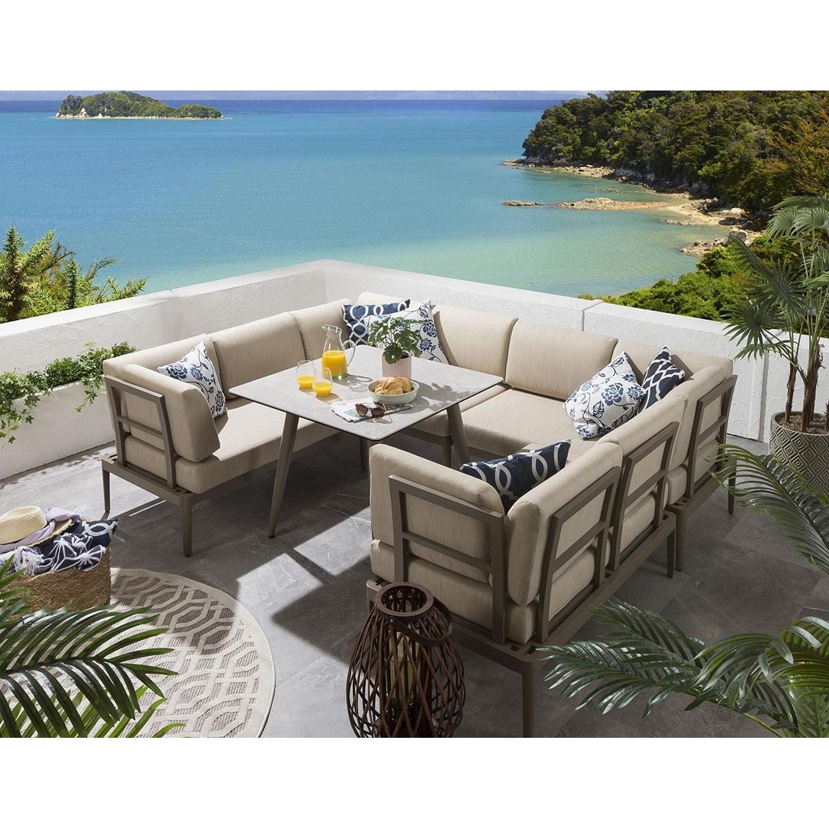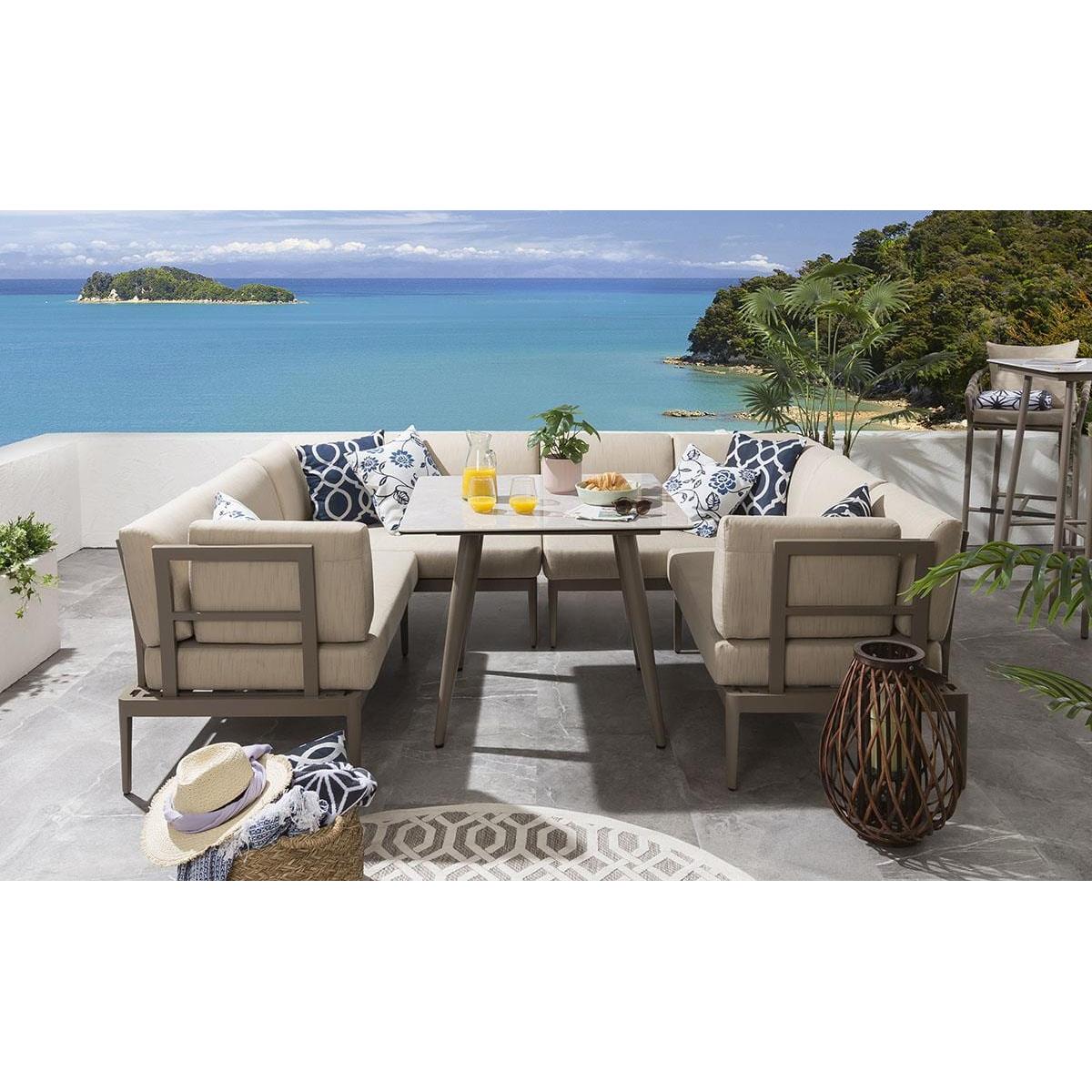 Our Ada Garden Dining Set includes 4 modular sofa sections in beige brown and a spacious 90cm x 90cm ceramic dining table with a timeless light beige brown marble-effect finish table top. Whatever the occasion, you'll find it incredibly difficult to resist your outdoors with the lure of this luxurious 6 seater garden table and chairs set. The Ada Modular Garden Sofa can be configured as a corner sofa, or straight sofa, depending on your space and requirements. The small garden corner sofas come complete with our signature luxuriously thick cushioning that offers unbeatable comfort, topped off with rich Beige Brown high-end marine fabric which has amazing resilience to colour fading and damage caused by extreme weather conditions and also a free winter cover. The Ada Modern Dining Bench Set includes a premium ceramic top garden table. Ceramic stone is exceptionally hard wearing, plus its heat, scratch, and fade resistant. We usually reserve this material for our designer indoor dining tables, however, it is the perfect material for outdoor tables, as it is extremely durable. Expertly crafted aluminium frames are highly durable, complemented by clean lines that lend contemporary style. It is robust and weather-resistant for outdoor use & the firm-cushioned seating offers comfortable support that's shower-resistant, but we advise that cushions are stored when not in use. If you need more information about this product, use the Live Chat service to speak to the team or send us a message. Spread the cost our with interest-free finance options. Minimum spend applies. W250cm D200cm H81cm Ceramic glass durable table top Seats up to 6 people - 6-Seater Beige Brown Garden Dining Table & Chairs