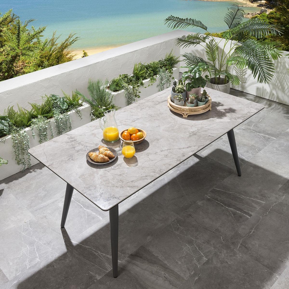 Our hard-wearing and spacious ceramic 180cm rectangular garden dining table makes a perfect addition to any contemporary, modern or minimalist outdoors, providing enough space for up to six people to enjoy dining in comfort. Made from robust and ultra-durable ceramic in a natural smooth grey marble-effect finish, atop a hard-wearing grey aluminium metal frame - which are set to last for years to come. Expertly crafted aluminium frames are highly durable, complemented by clean lines that lend contemporary style. It is robust and weather-resistant for outdoor use & aluminium frames will not rust and are lightweight to move around. If you need more information about this product, use the Live Chat service to speak to the team or send us a message. Spread the cost our with interest-free finance options. Minimum spend applies. W180cm D90cm H73cm 6 Seater Grey Ceramic Marble Effect Garden Dining Table Adjustable Feet