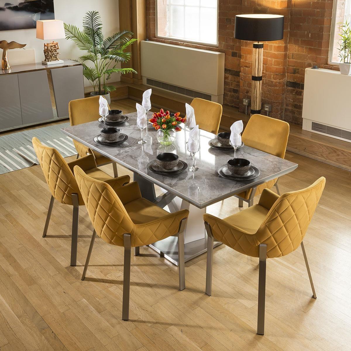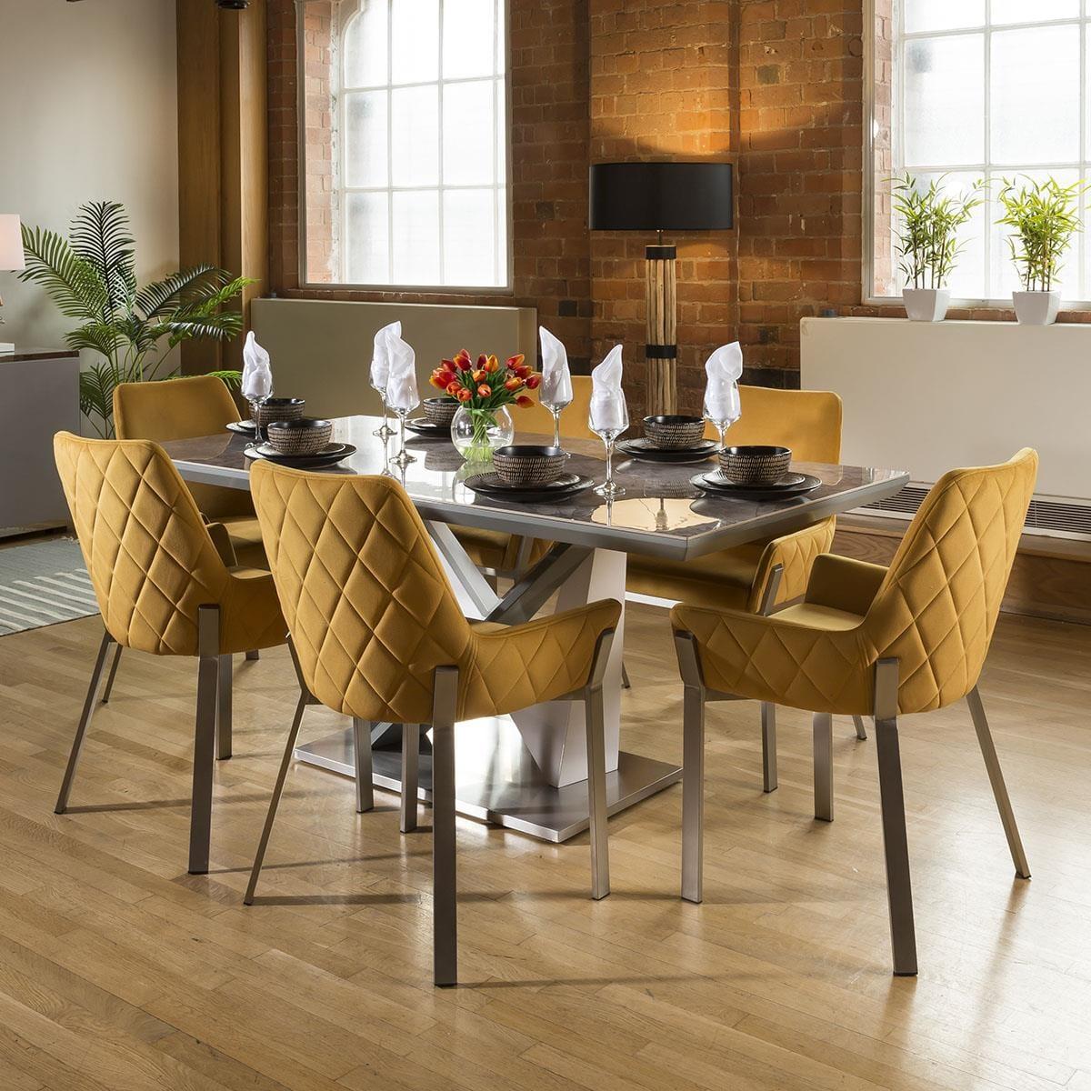 High quality large rectangular dining table with grey ceramic top, white / grey gloss central pedestal and the base plate is brushed stainless steel and very heavy to keep the table very sturdy. This dining set includes 6 Carver Dining Chairs With Mustard Quilted Fabric and Brushed Stainless Steel Legs, adding that perfect splash of colour. Quatropi Luxury Dining Sets have been designed to stand out in the most contemporary dining rooms and kitchens in the UK. The dining table sets have been put together by our expert designers to provide a large combination of choice from farmhouse style to prestige, including small or large dining table sets, long narrow tables, round breakfast tables, farmhouse solid oak sets, extendable dining sets, corner sofa bench sets - only to mention a few! Our range of dining chairs that we match to the dining tables provides you with a large choice of sets - these are available in many colours and made in many styles, such as carver, faux leather, suede, velvet and many more. W180cm D90cm H76cm Set includes 1 x dining table and 6 chairs Mix and Match any of our tables and chairs